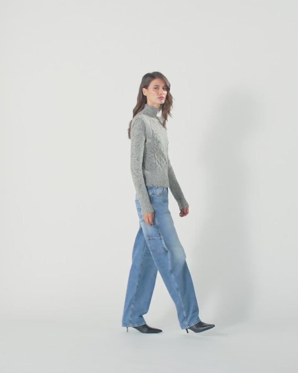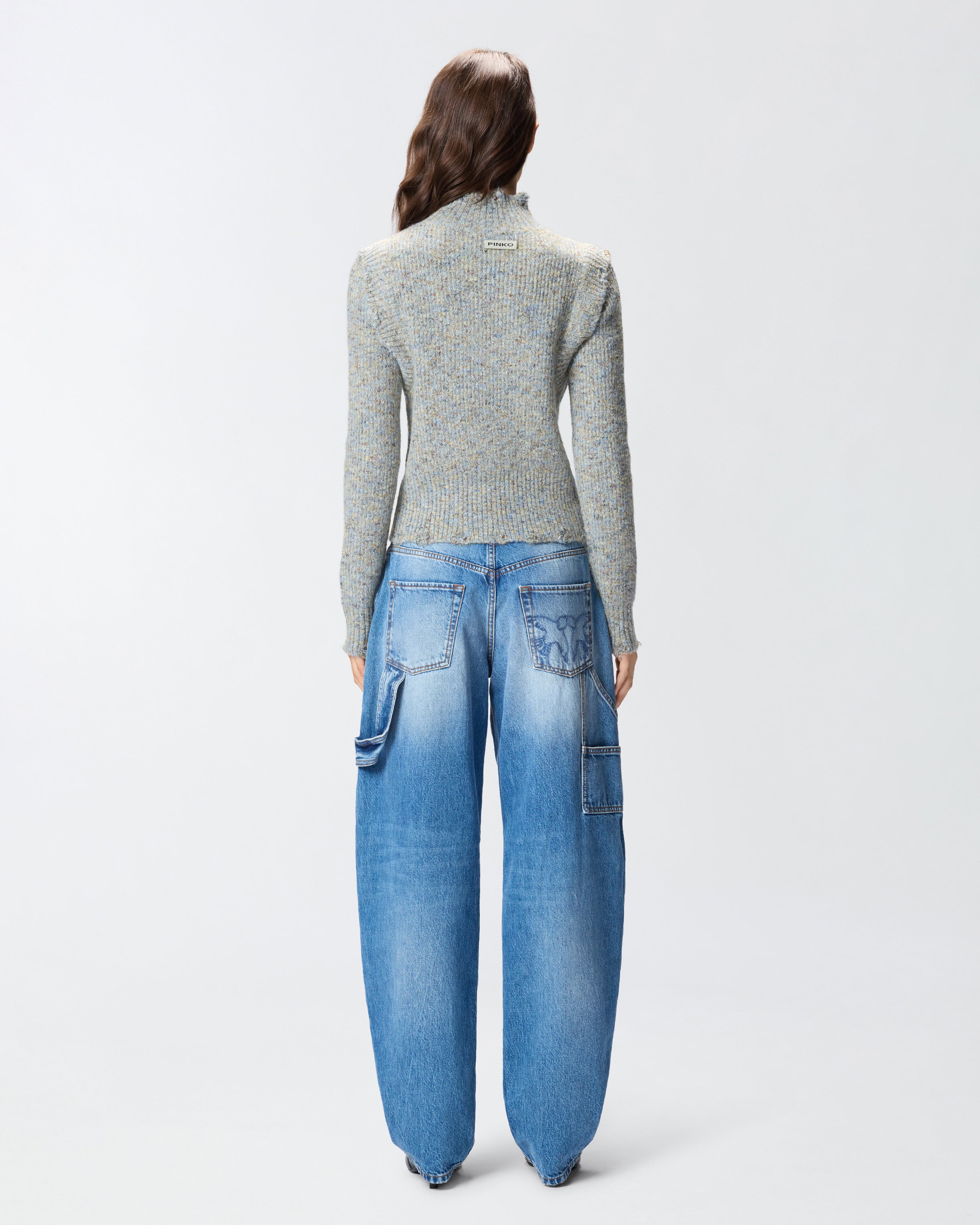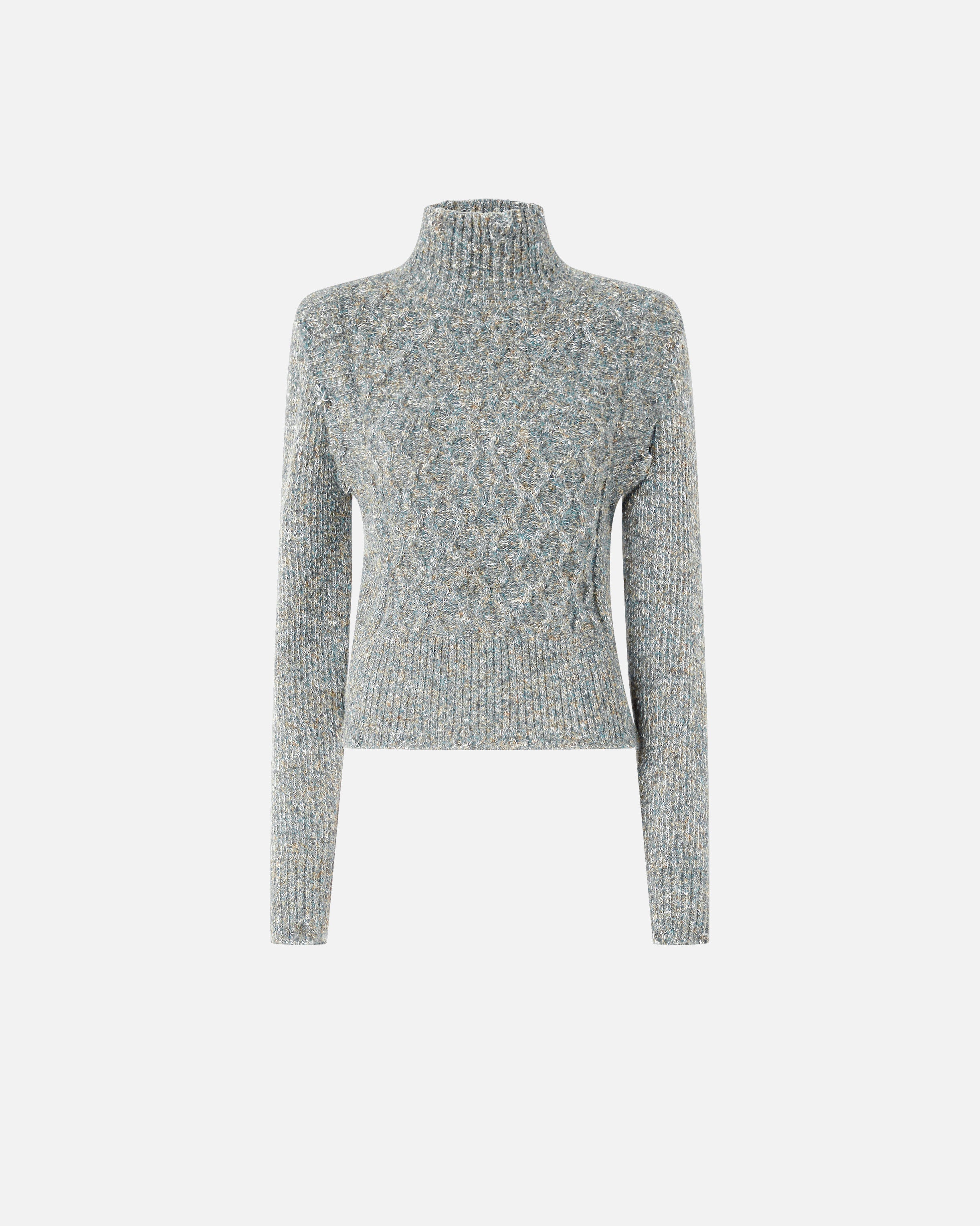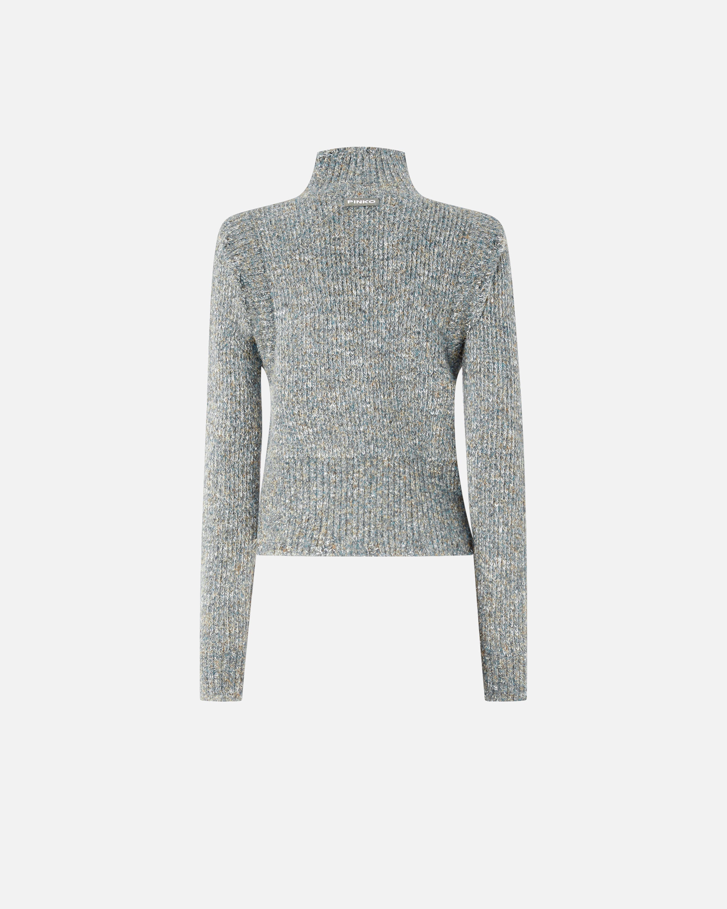 Turtleneck sweater knit from yarns of different colours, featuring ribbing on the back and sleeves and cable stitching on the front that gives the design movement and a three-dimensional feel. This piece, finished with a label bearing the PINKO logo lettering on the back, is perfect to wear with the matching skirt to create a complete winter look with an innovative, modern vibe. The piece has undergone finishing tests to minimise the possible formation of pilling, ensuring greater fabric softness and durability.