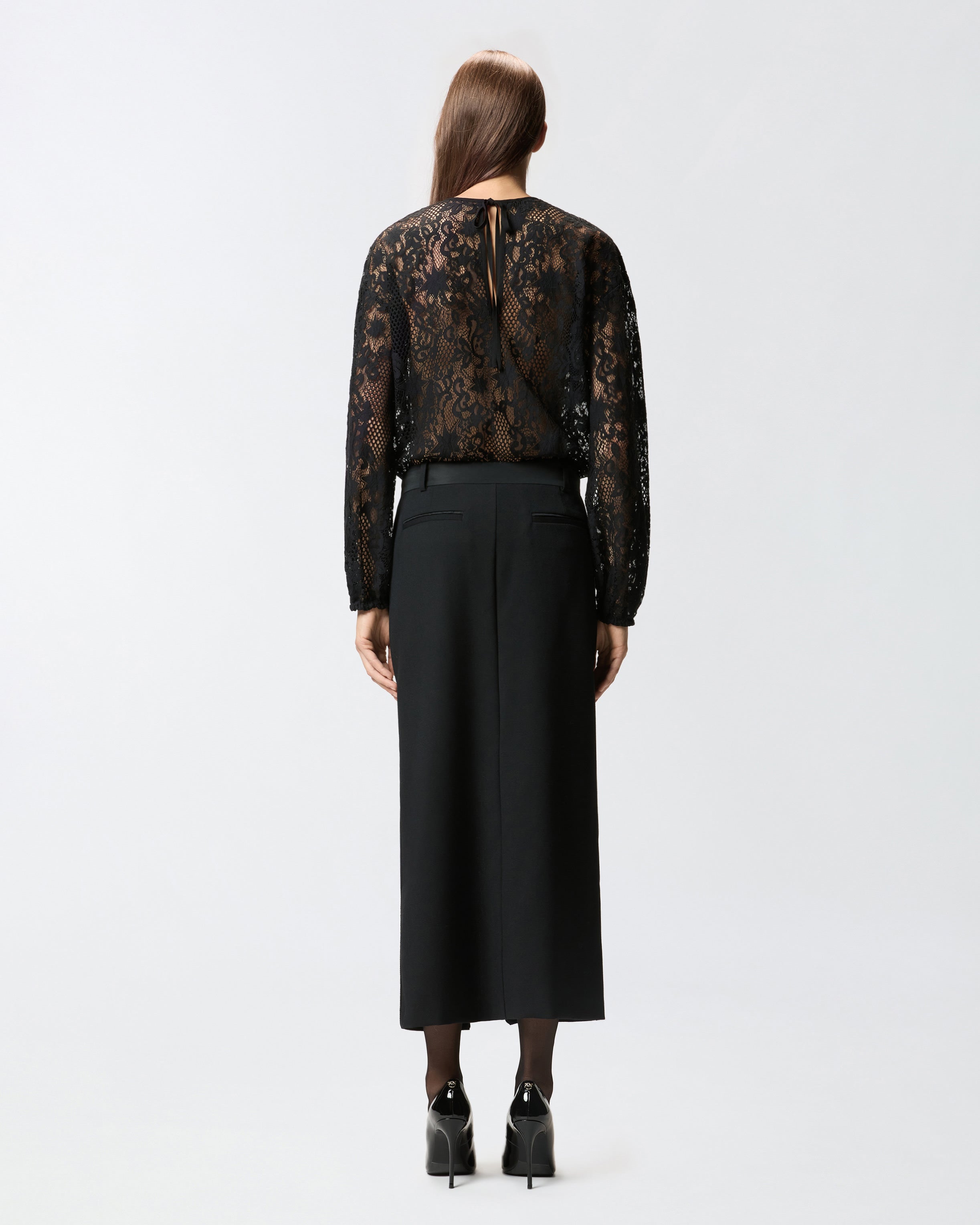 Feminine long-sleeved bodysuit in semi-sheer rebrodé lace decorated with an elaborate design. Keyhole fastened with lacing in the middle at the back. Pair this bodysuit with the lace pencil skirt in the same colour for a bold, feminine head-to-toe look.