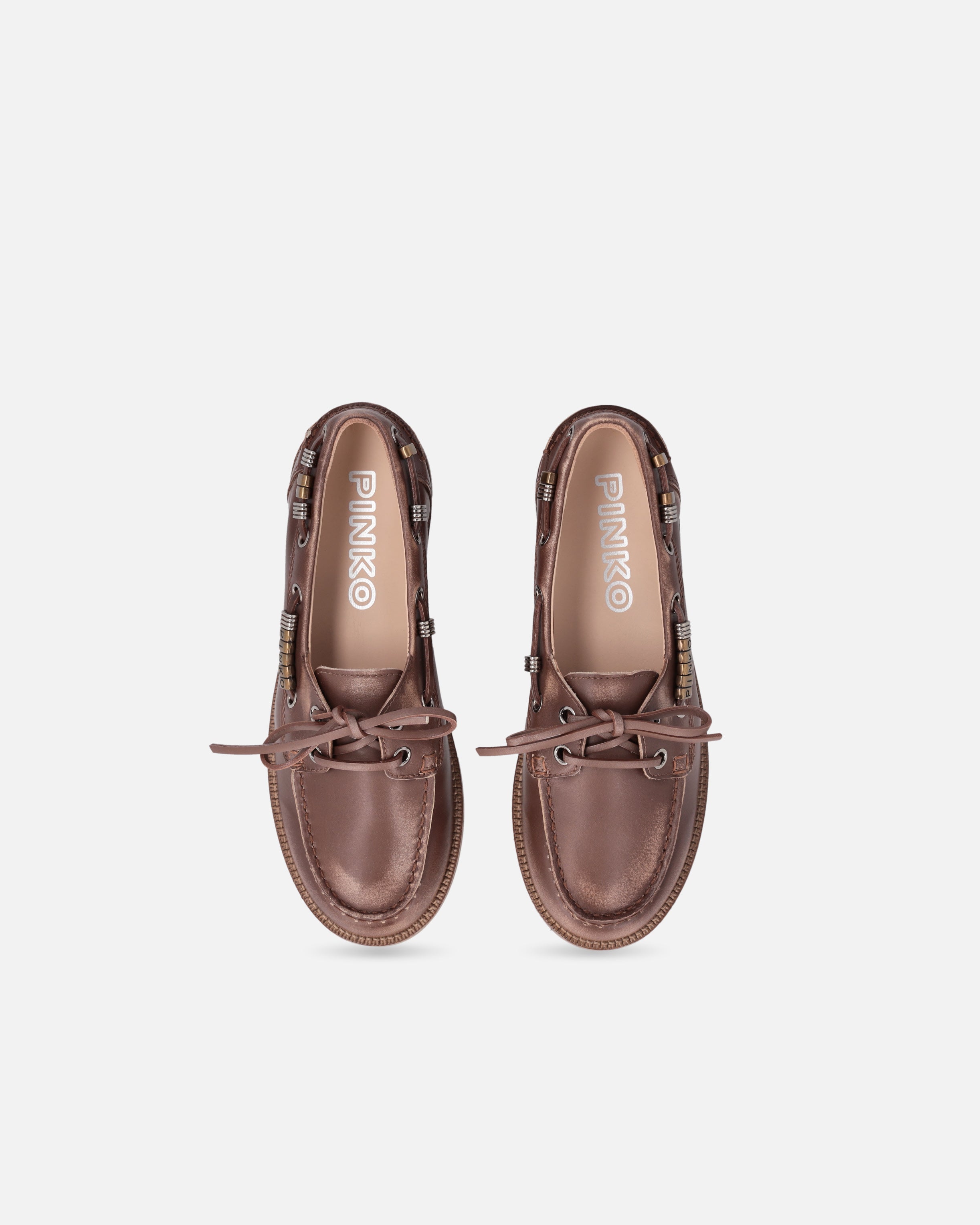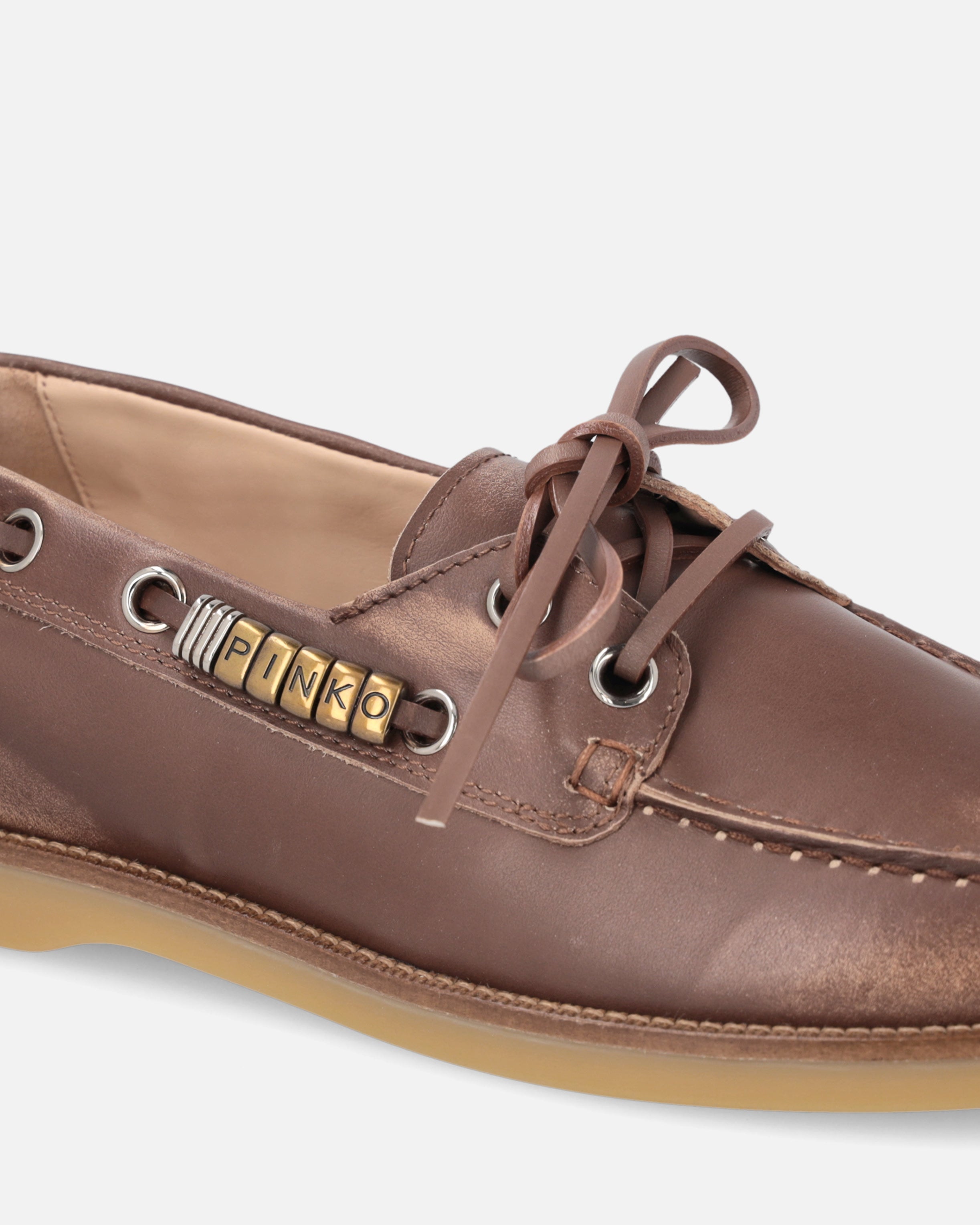 A reinterpretation of the boat shoe style with an urban and refined touch, these moccasins are made of Italian leather, synonymous with quality and tradition. The design is enhanced by pinched detailing on the vamp, an artisanal technique that highlights the hand-stitching and gives the shoe an authentic, distinctive look. Metallic details on the side laces, including gold rings forming the PINKO logo lettering, add shine and character, while the crepe-effect rubber sole ensures comfort and flexibility. The model you were looking for to complete your everyday outfits with a casual and contemporary elegance.