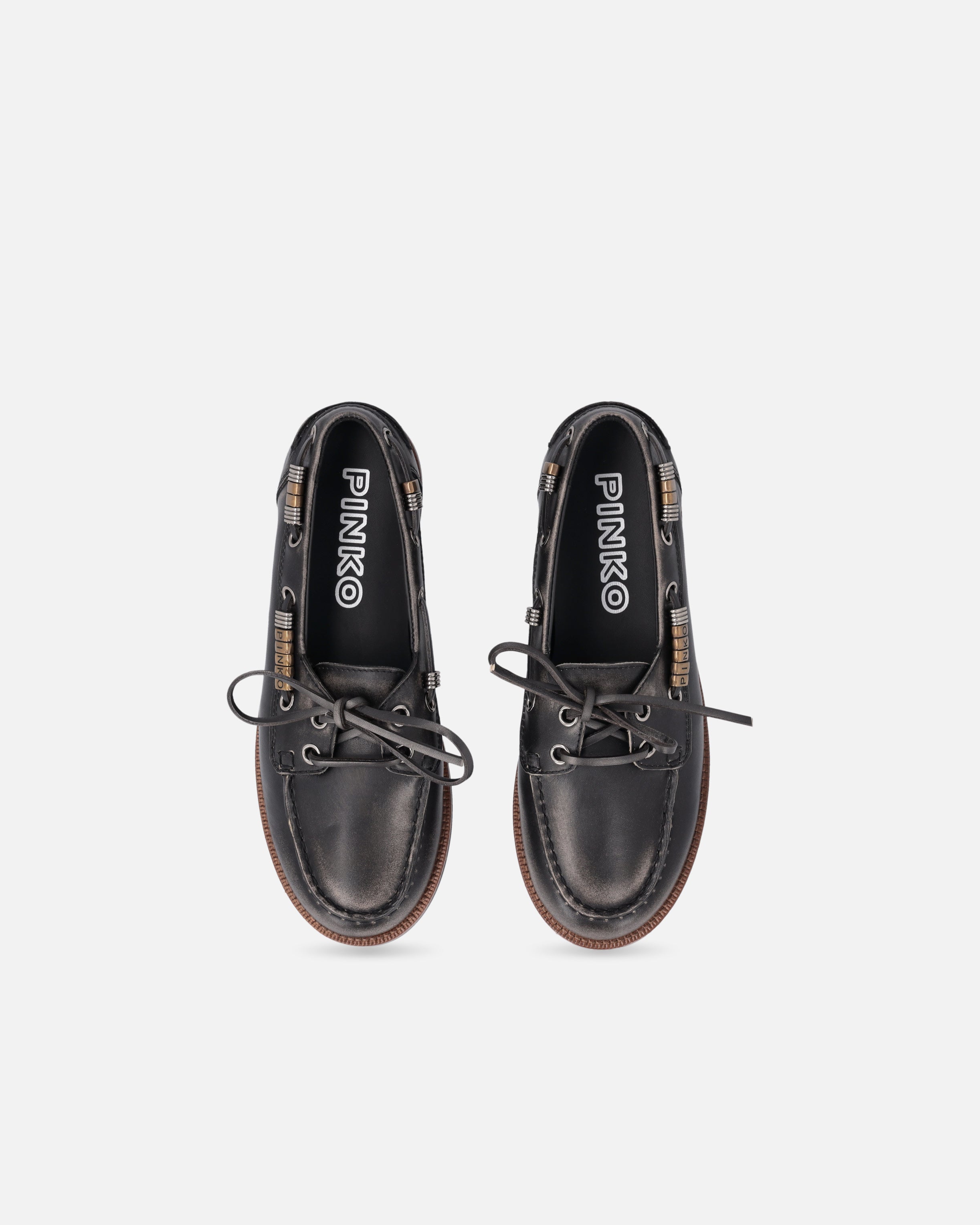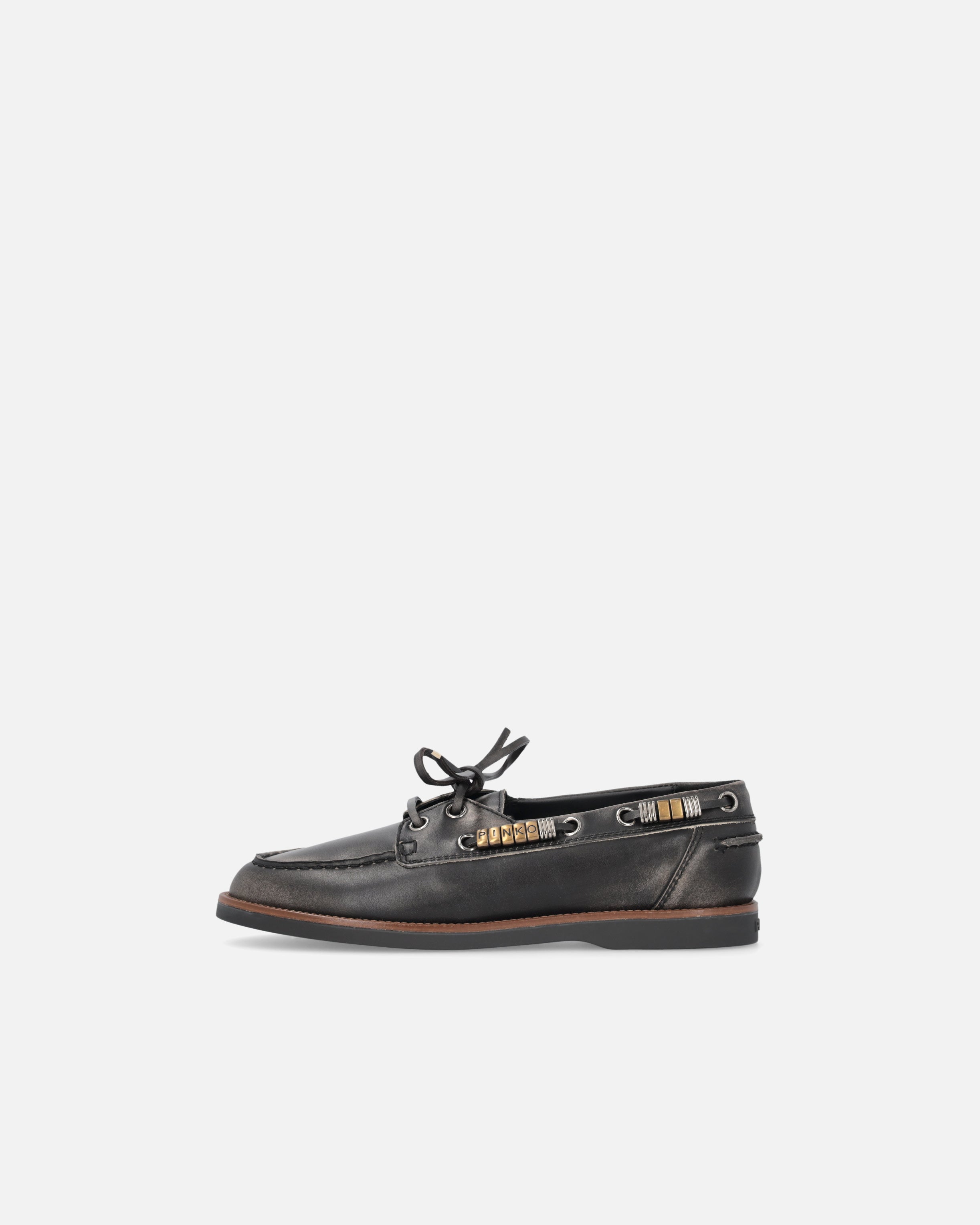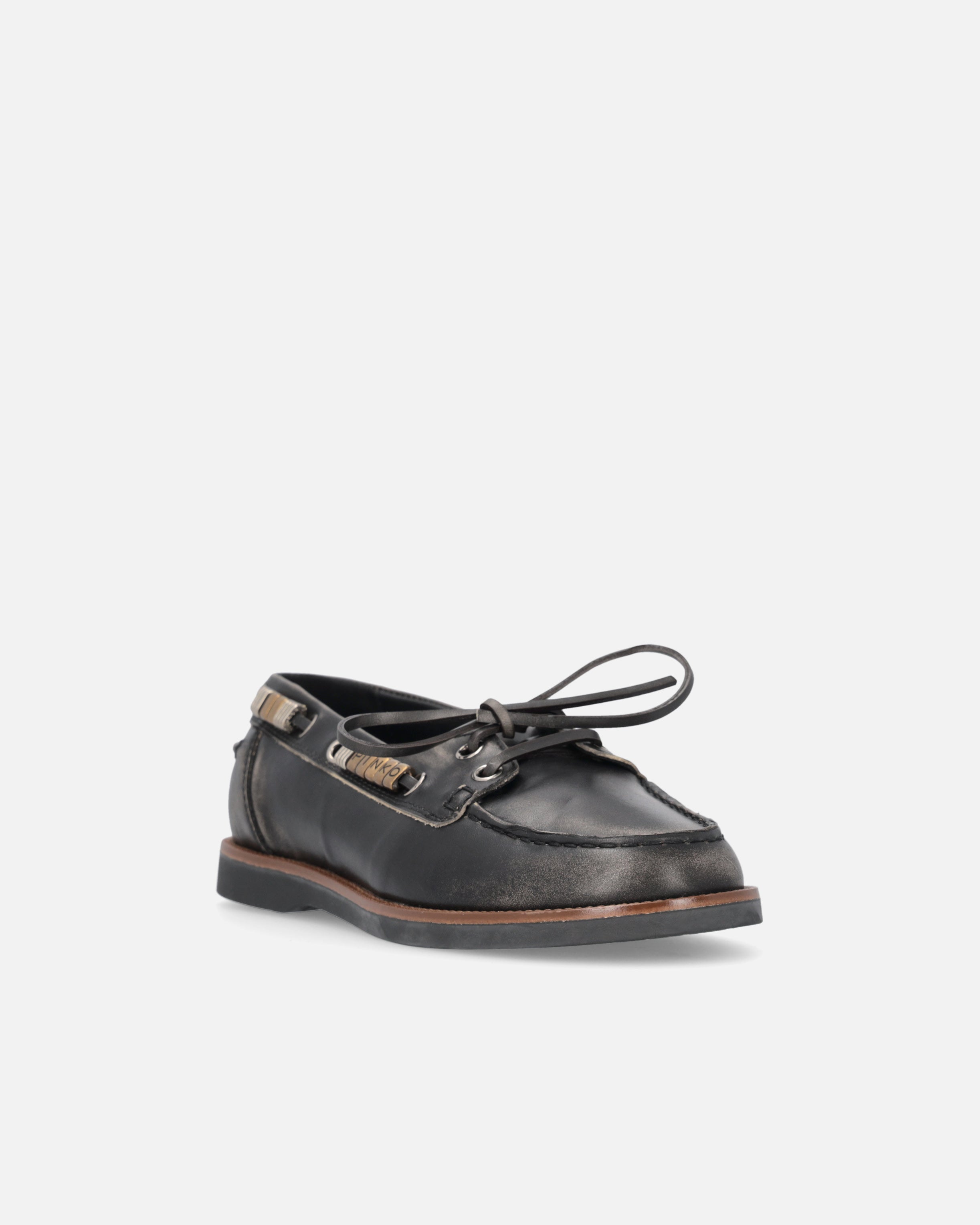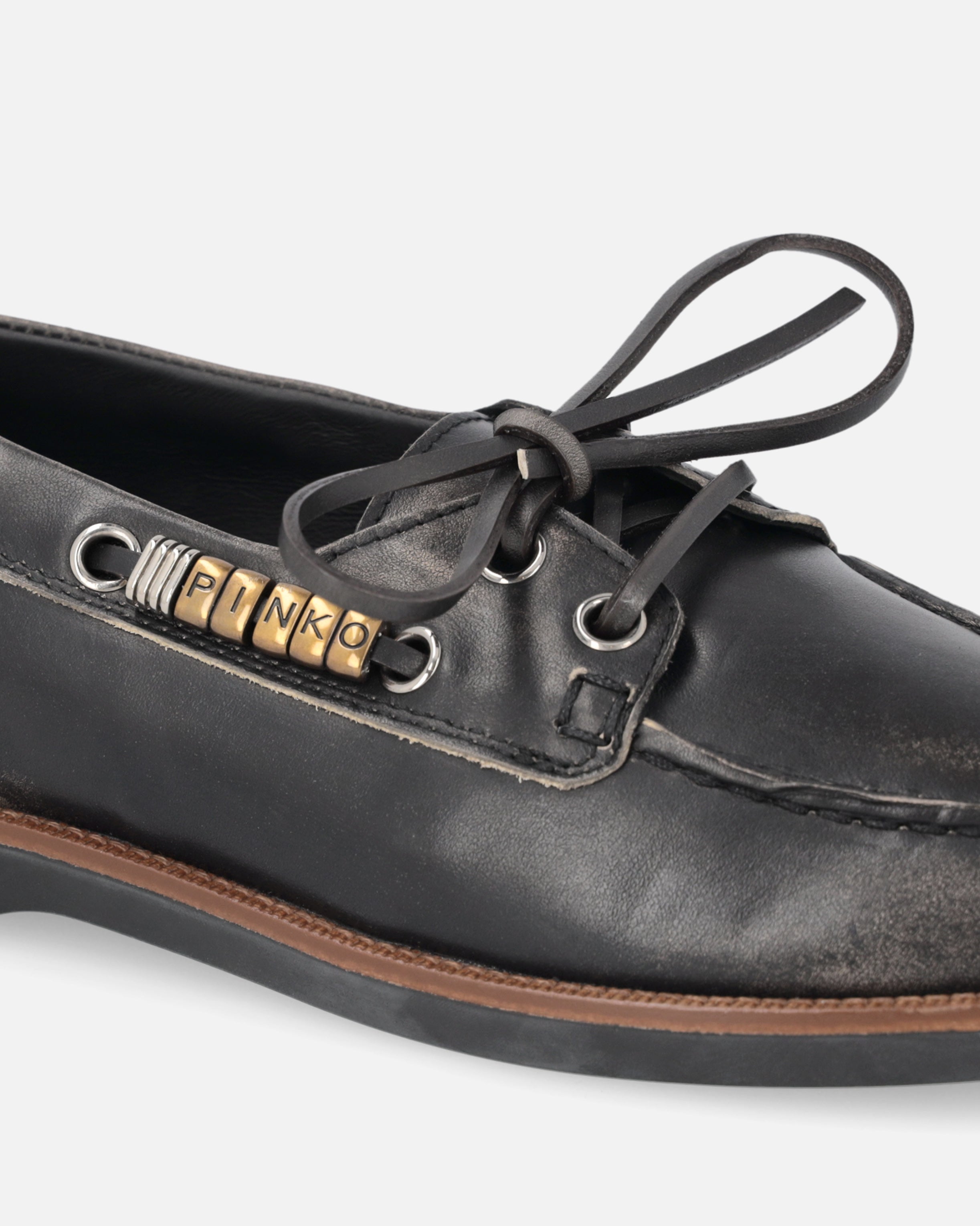 A reinterpretation of the boat shoe style with an urban and refined touch, these moccasins are made of Italian leather, synonymous with quality and tradition. The design is enhanced by pinched detailing on the vamp, an artisanal technique that highlights the hand-stitching and gives the shoe an authentic, distinctive look. Metallic details on the side laces, including gold rings forming the PINKO logo lettering, add shine and character, while the crepe-effect rubber sole ensures comfort and flexibility. The model you were looking for to complete your everyday outfits with a casual and contemporary elegance.