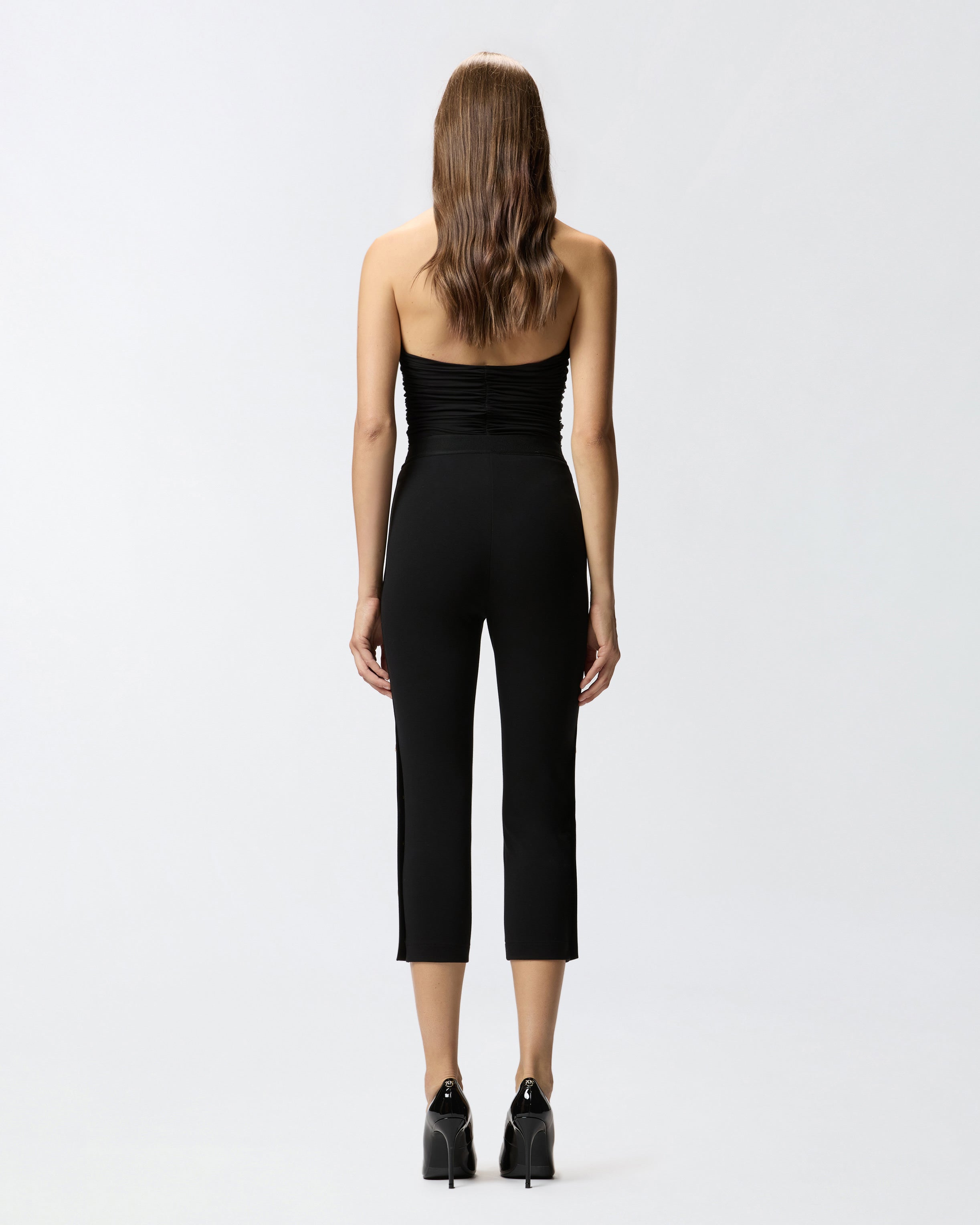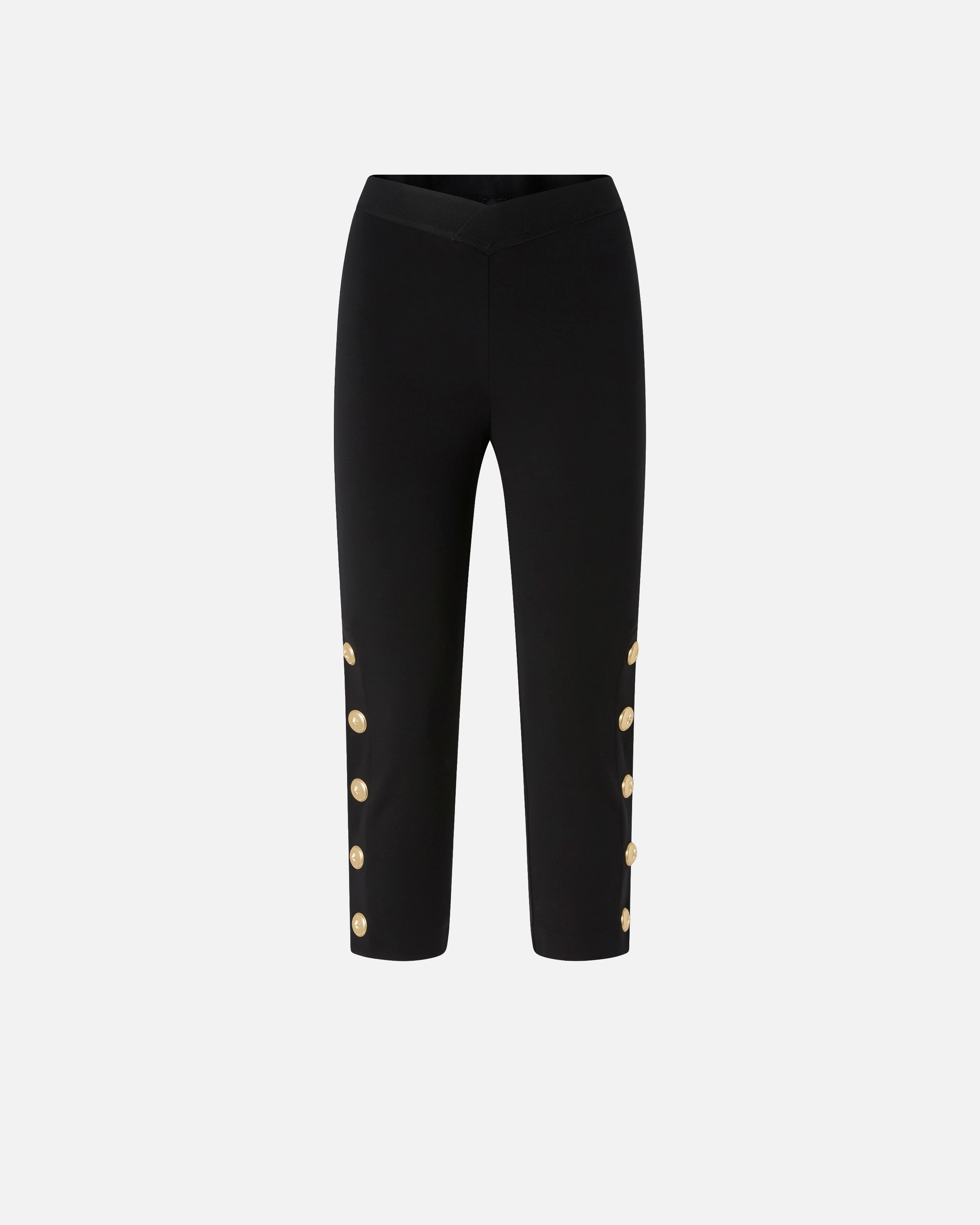 High-waisted leggings in technical, full Milano-knit stretch viscose fabric. This skinny-fitting style features a comfortable slightly V-shaped elasticated waist on the front and is embellished by a row of star-decorated metal buttons on the outer side of the leg, for a personalised touch in pure PINKO style.