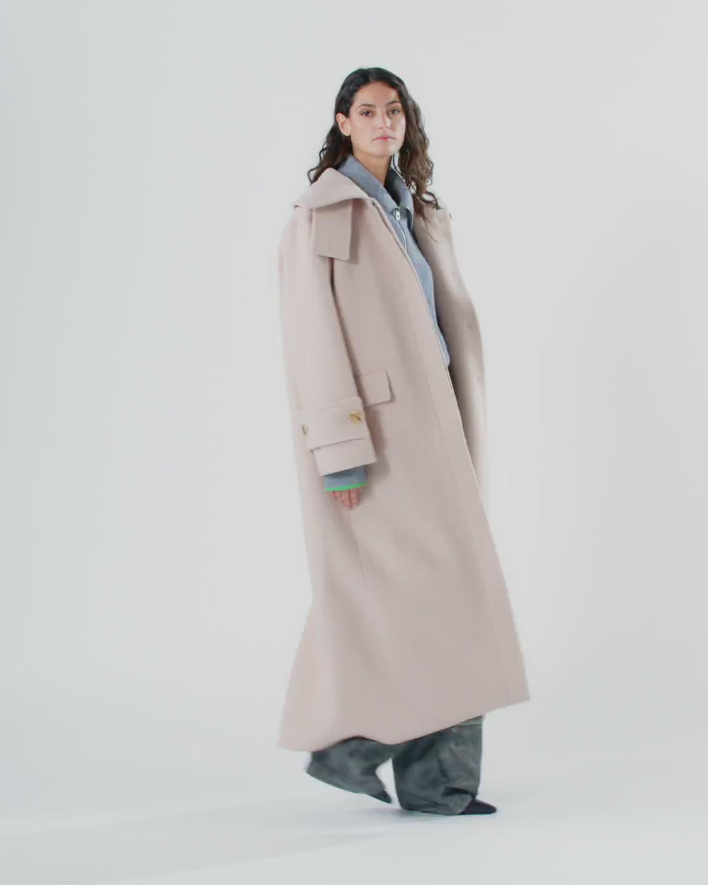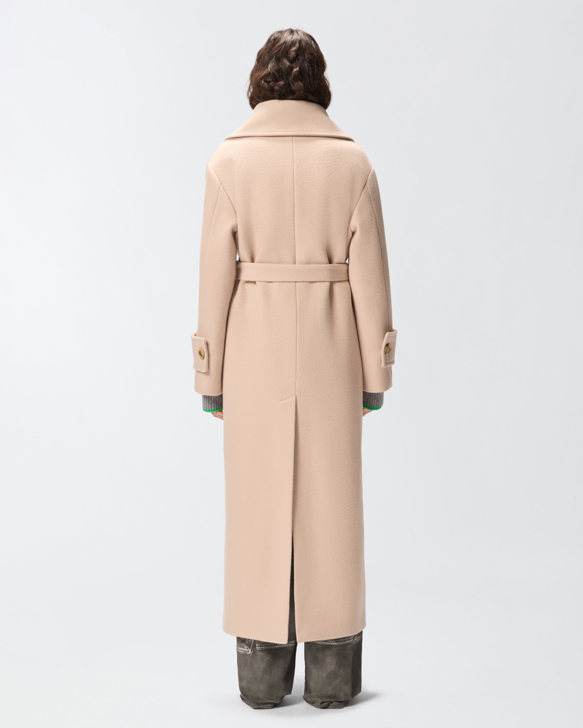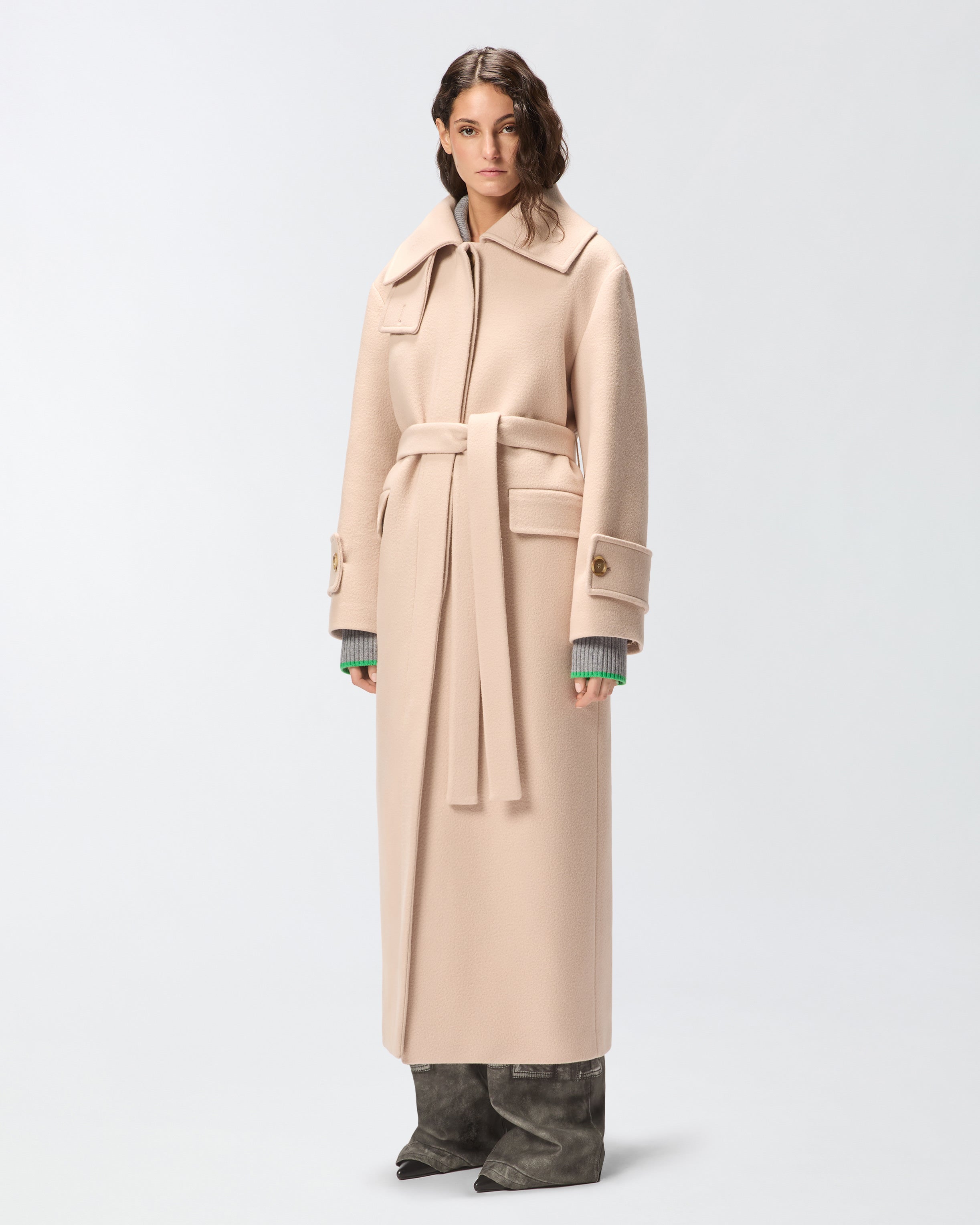 Long coat made from refined wool-blend cloth, featuring a wide collar and flap pockets. Here, a functional design meets a minimalist aesthetic provided by a concealed button placket, buttoned straps on the sleeves and a waist belt that highlights the feminine figure. Brave the bitterly cold days ahead in style.
