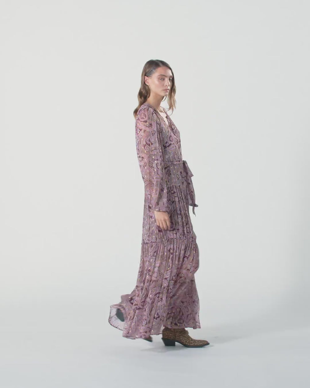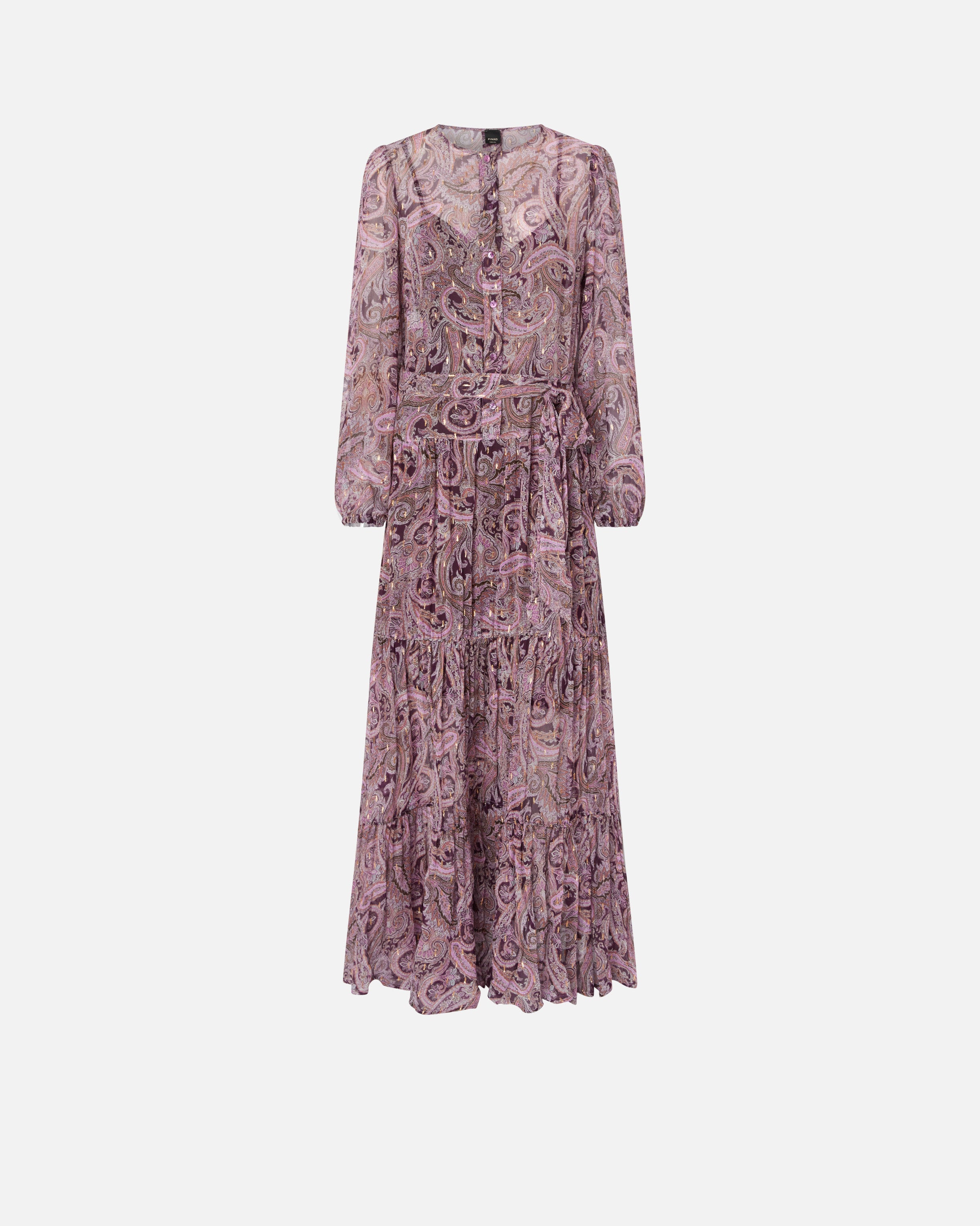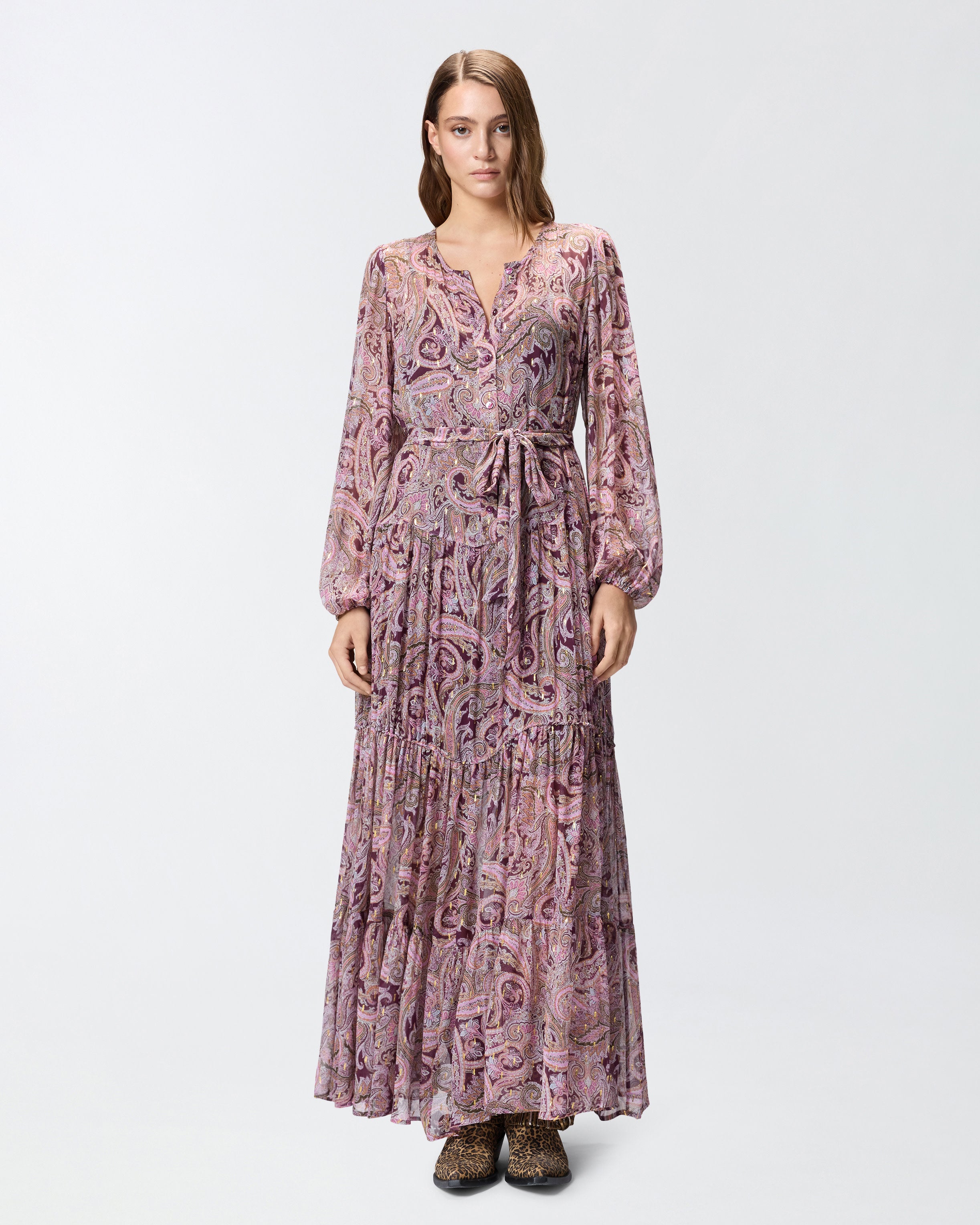 Long crew-neck dress with slightly puffed long sleeves, front button fastening down to the waistline, highlighted by a fabric belt, and wide flounced skirt. This piece is made from lightweight semi-sheer viscose crepon and is embellished with a sophisticated cashmere-inspired print with metallic-thread detailing for extra radiance. The light weight and playful, feminine sheer effects—offset by the slip with spaghetti straps—make this women's dress the ideal choice for a boho-chic evening look.