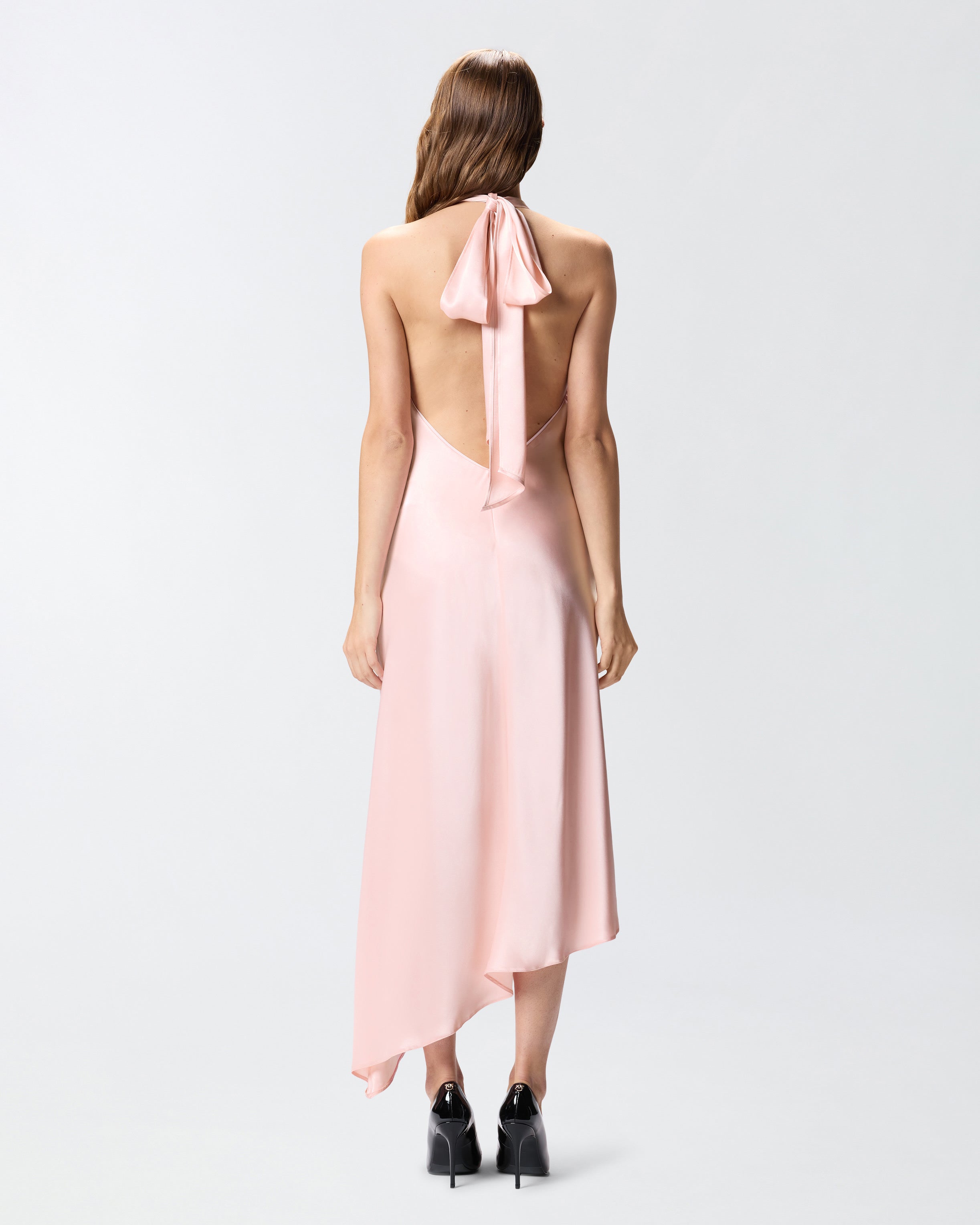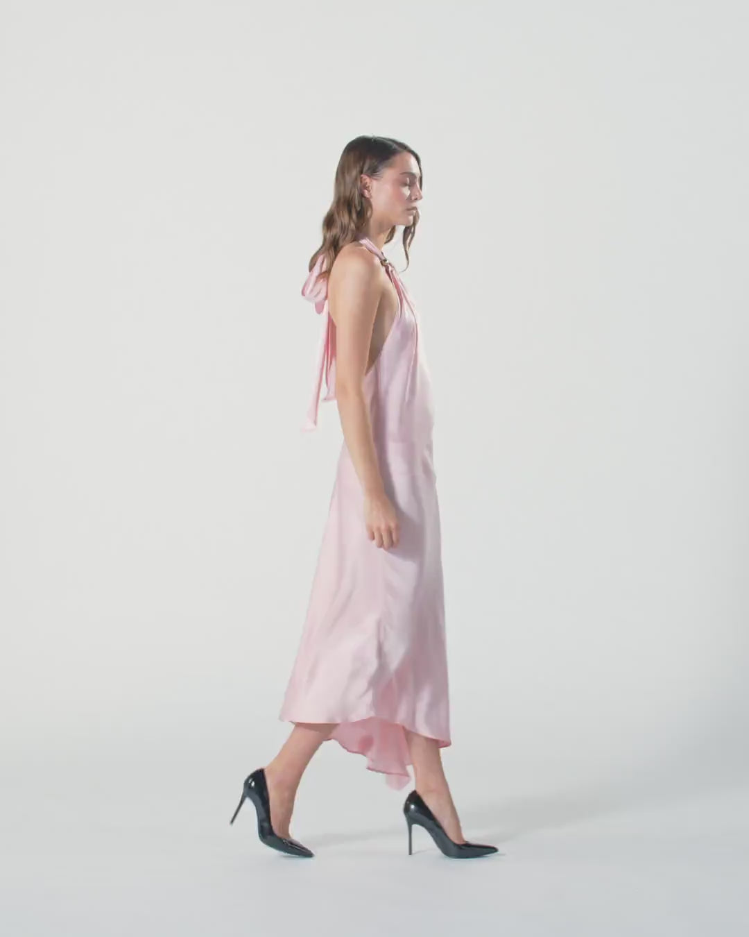 Long and fitted sleeveless dress, made unique by the asymmetrical hem and embellished with metal boules at the halter neckline. A touch of sensuality is given by the open back caressed by the drape tied to the neck that falls freely, giving movement. The shiny satin gives a unique shine and a particularly soft hand to the garment. Wear this design for a flowing, flowing effect that elegantly and sophisticatedly enhances the feminine lines and silhouette.