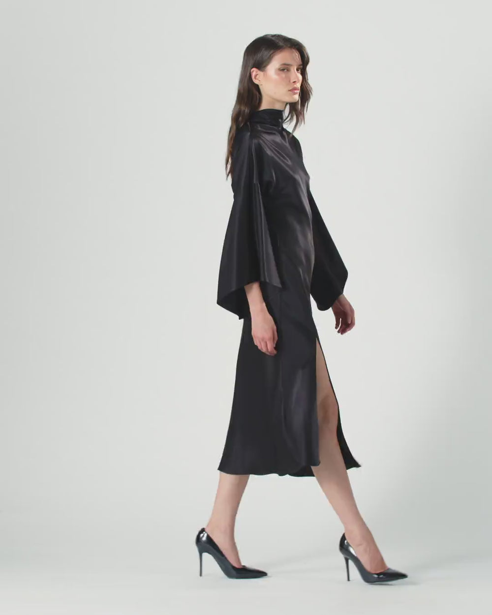 Long fitted satin dress with a high neck and long full sleeves. The shiny satin gives the piece unique shimmer and a particularly soft hand. The side slit and the cut-out detail on the back will enhance your sensuality without sacrificing class. Wear this dress for a fluid, slinky effect that elegantly enhances the lines with sophistication and the feminine silhouette.