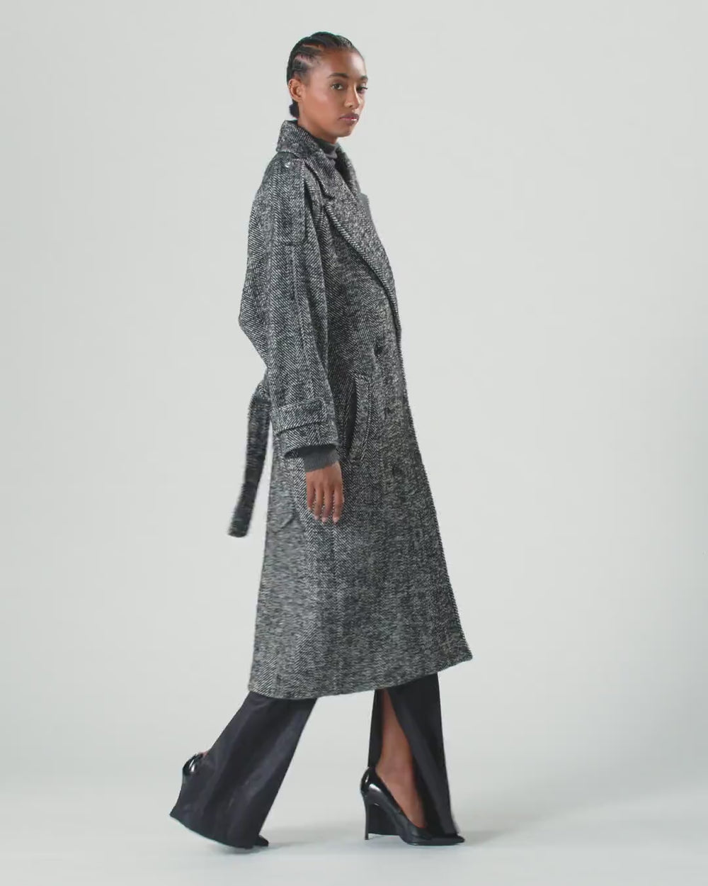 Women's ankle-length coat with a robe design, double-breasted fastening, lapel collar and long sleeves complete with strap details. The piece is made from warm wool-blend cloth, obtained from regenerated yarns that give the structure a textured and uneven appearance, and is customised with a refined herringbone pattern. Matching-fabric waist tie. Lined model.