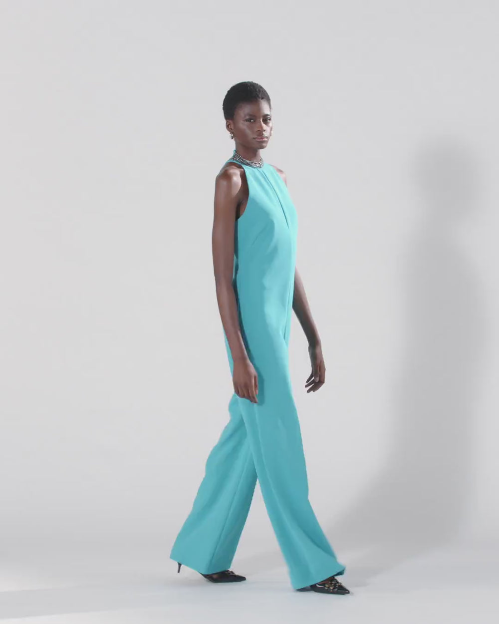 Straight-cut playsuit with long trousers made of a technical canvas fabric with a compact and contemporary look and lined in lightweight georgette for a more comfortable fit. This model stands out for its sleeveless upper with a refined halterneck, embellished with a thin vertical cut-out on the front and a jewel detail with rhinestones, also on the front, recreating a multi-strand choker necklace. This elegant jumpsuit is fastened with an invisible zip in the middle at the back to keep the look as clean as possible, making it perfect for both ceremonies and special evenings with a formal dress code.