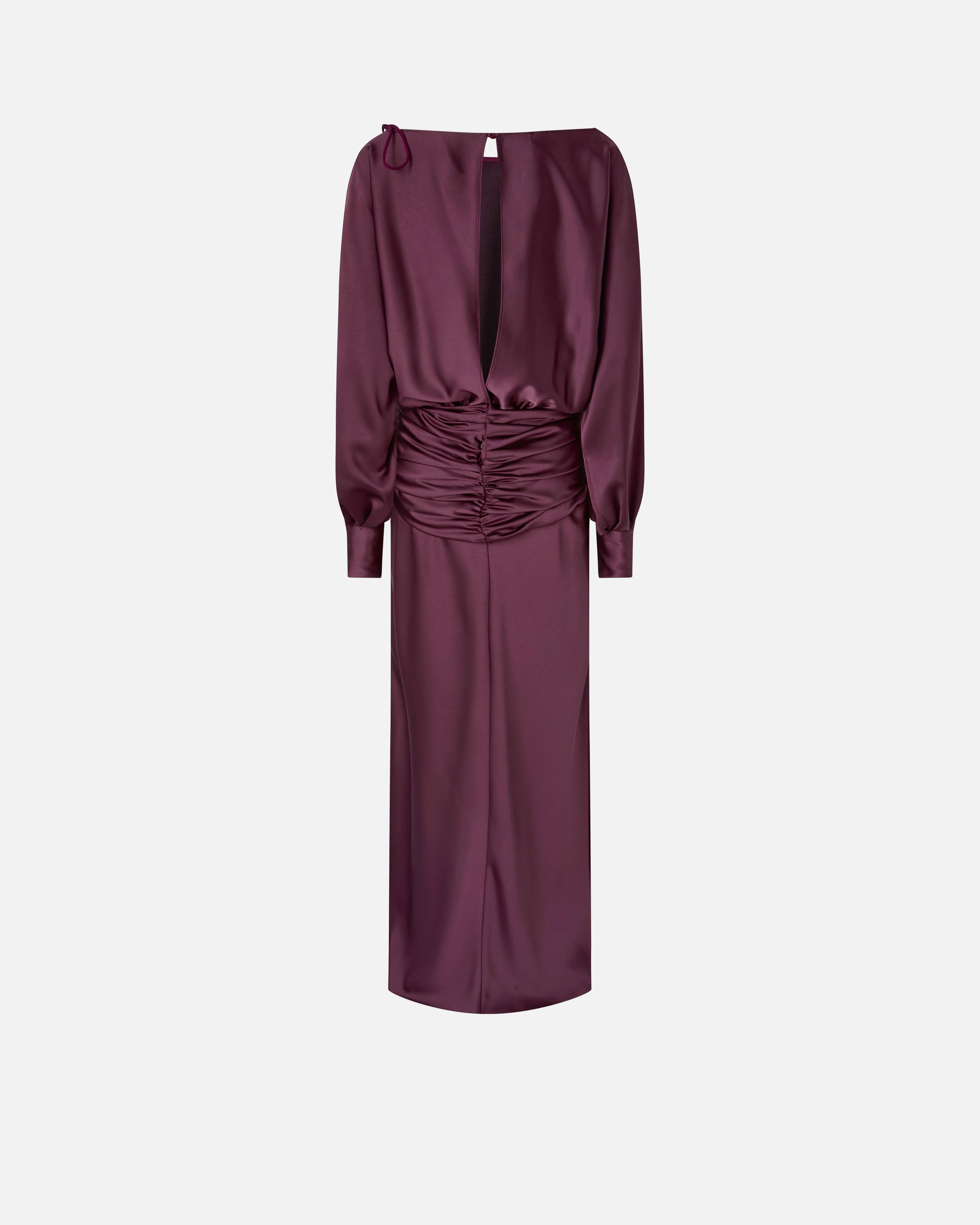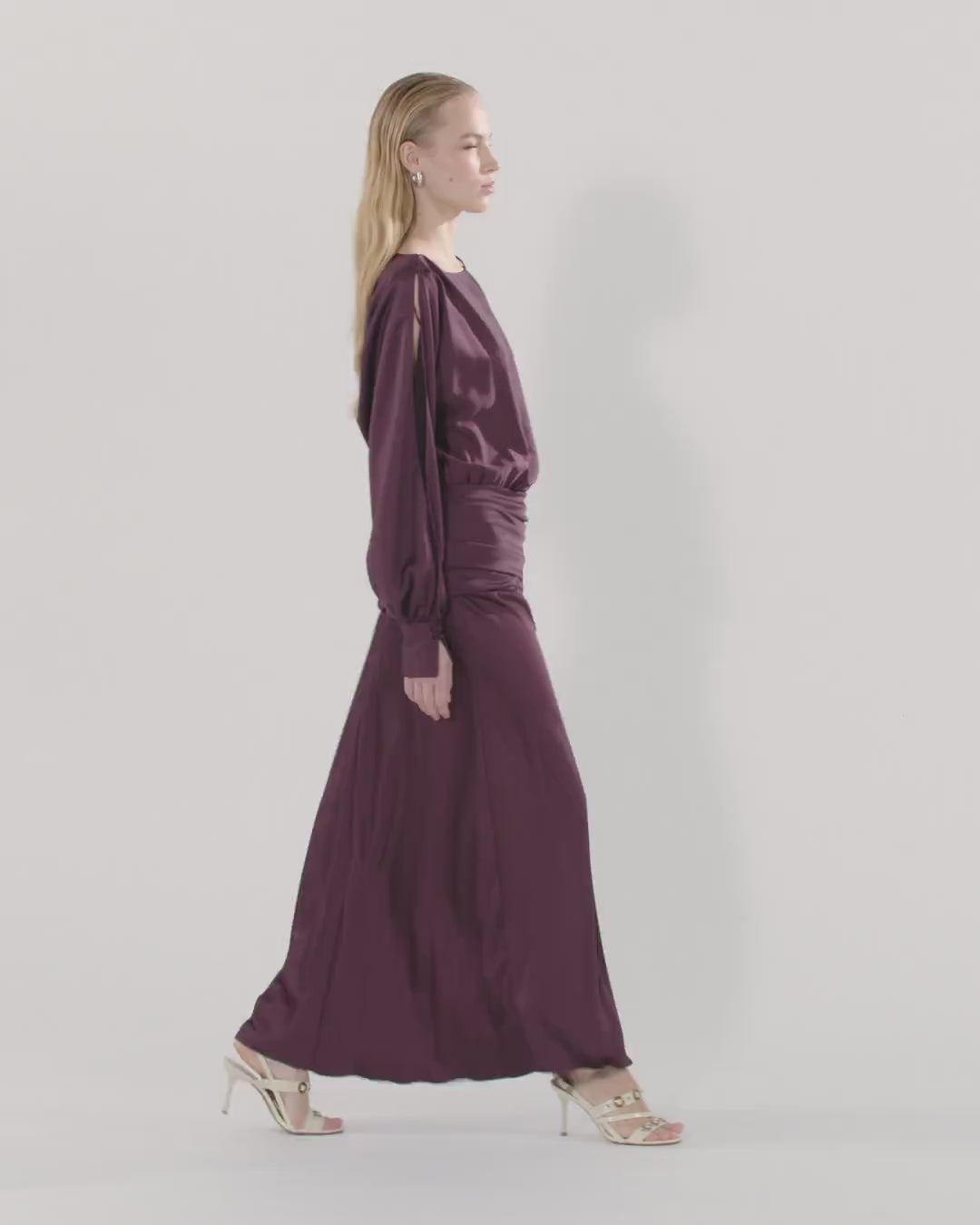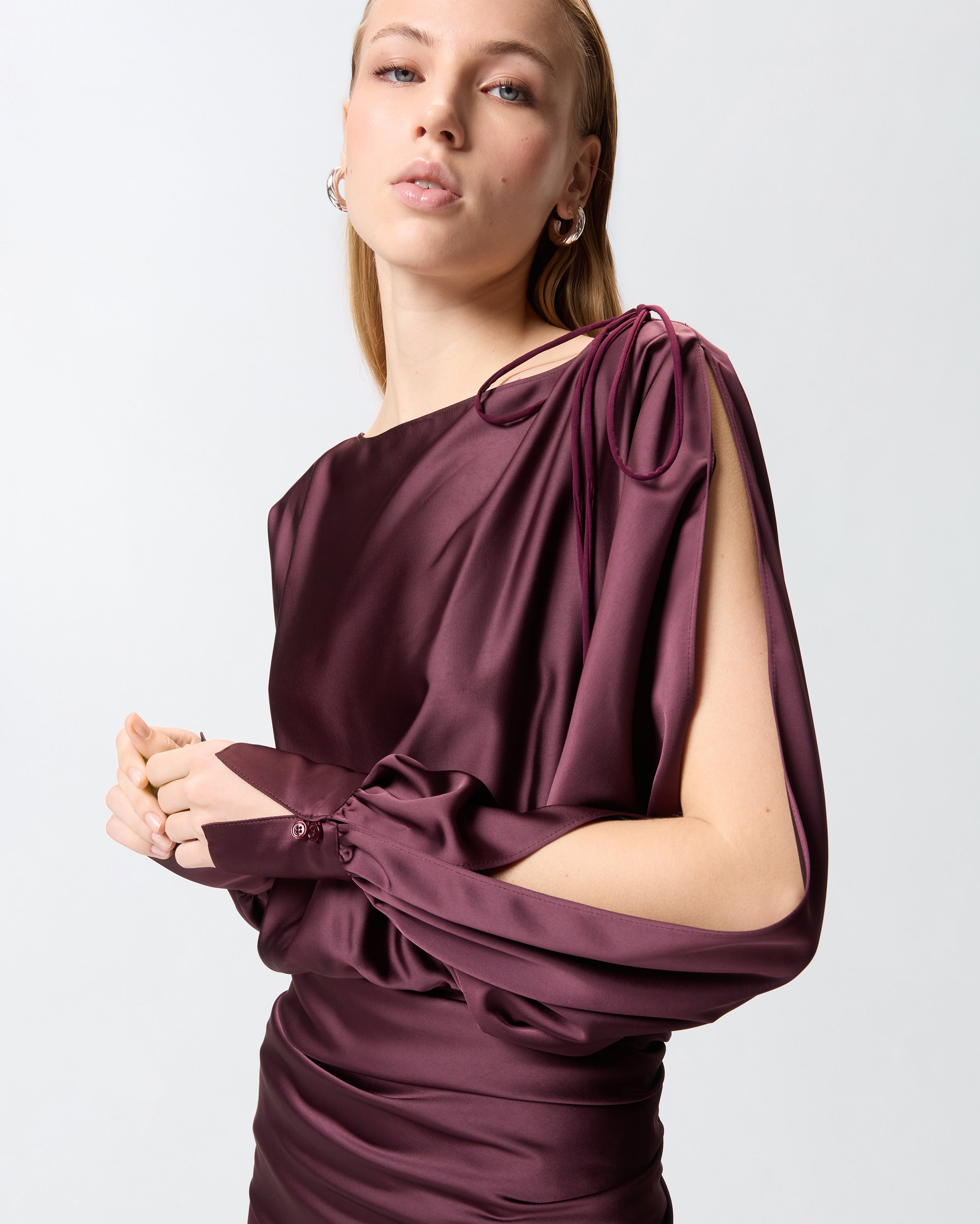 Long dress featuring a fitted bodice with a cinched waist, a boat neckline with ribbons to tie on one shoulder, and long balloon sleeves with high cuffs, paired with a flowing skirt with a wavy-effect hem. The model is made from soft, radiant double-faced satin for a refined, even look both inside and out, and features an elegant draping at the waist with an invisible zip and buttons to enhance the wear without sacrificing the fluidity of the silhouette. Perfect for a special occasion or ceremony, this dress features an inner lining and a long central cut-out that crosses the entire back, fastened only by a small button at the base of the neck.
