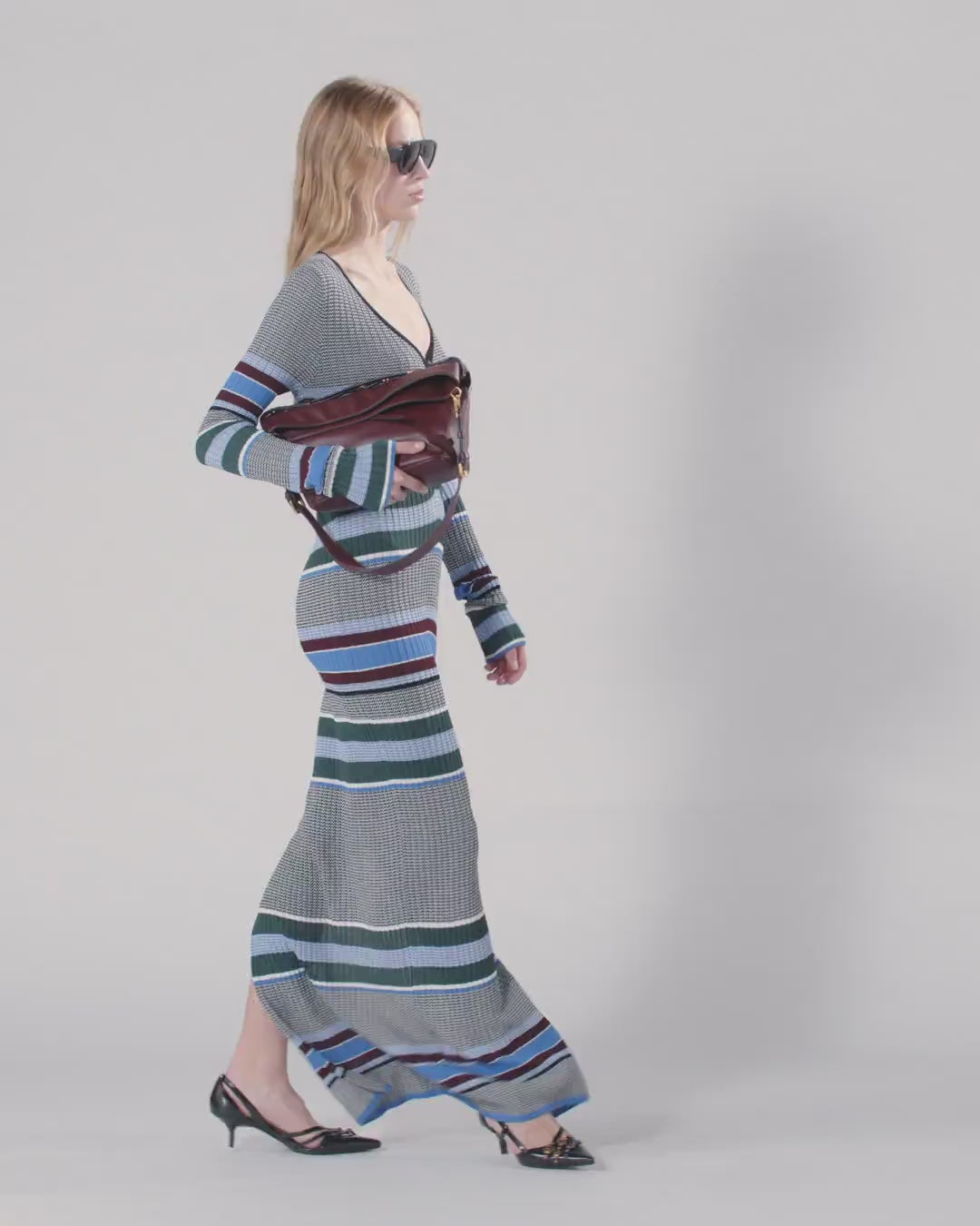 Slim-fitting long dress with plunging rounded V-neck, four-button fastening at the front, comfortable long sleeves and discreet side slit. Perfect for breathing life into new daytime looks, this model is made from ribbed knit viscose fabric—a particularly stretchy and comfortable material designed to caress the body in a natural way—and is customised with a multicoloured pattern with stripes that differ in thickness, lending a dynamic edge and extra movement. The final touch is given by the label with jacquard PINKO logo lettering on the back.
