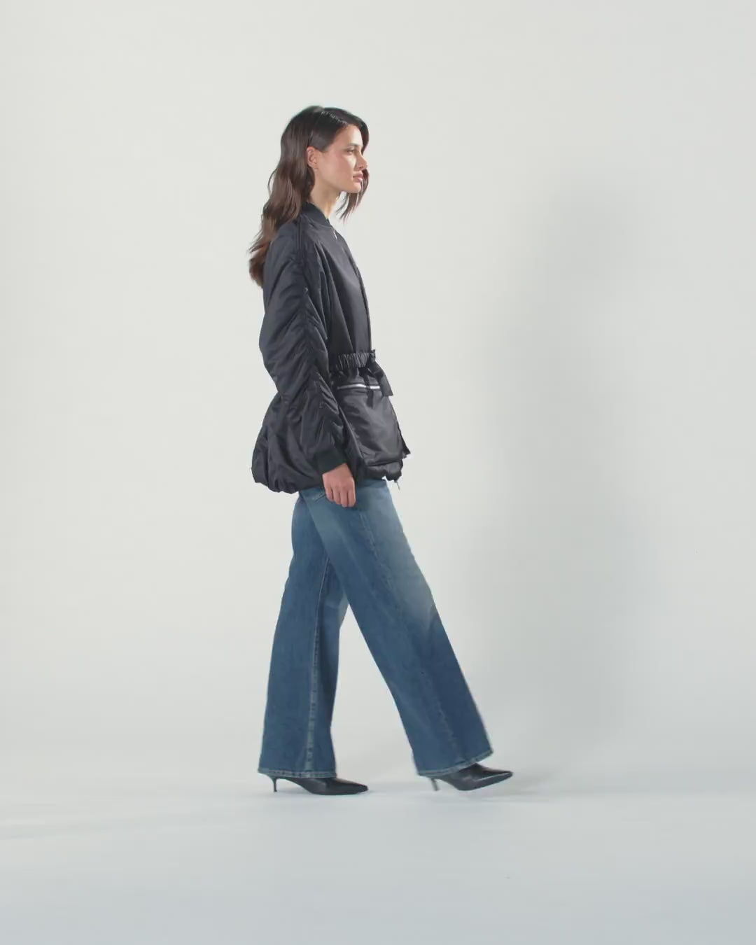 Technical satin jacket with long dropped-shoulder sleeves and utility-style maxi-pockets with zip on the front. The model features typical bomber details, such as the classic rib-knit collar and cuffs, but also flaunts more original accents, such as the elongated silhouette and gathered sleeves. Detachable waist belt embellished with the iconic Love Birds Diamond Cut buckle. Two-way zip fastening on the front. For extra comfort when worn, this bomber jacket is lined with contrasting fabric.
