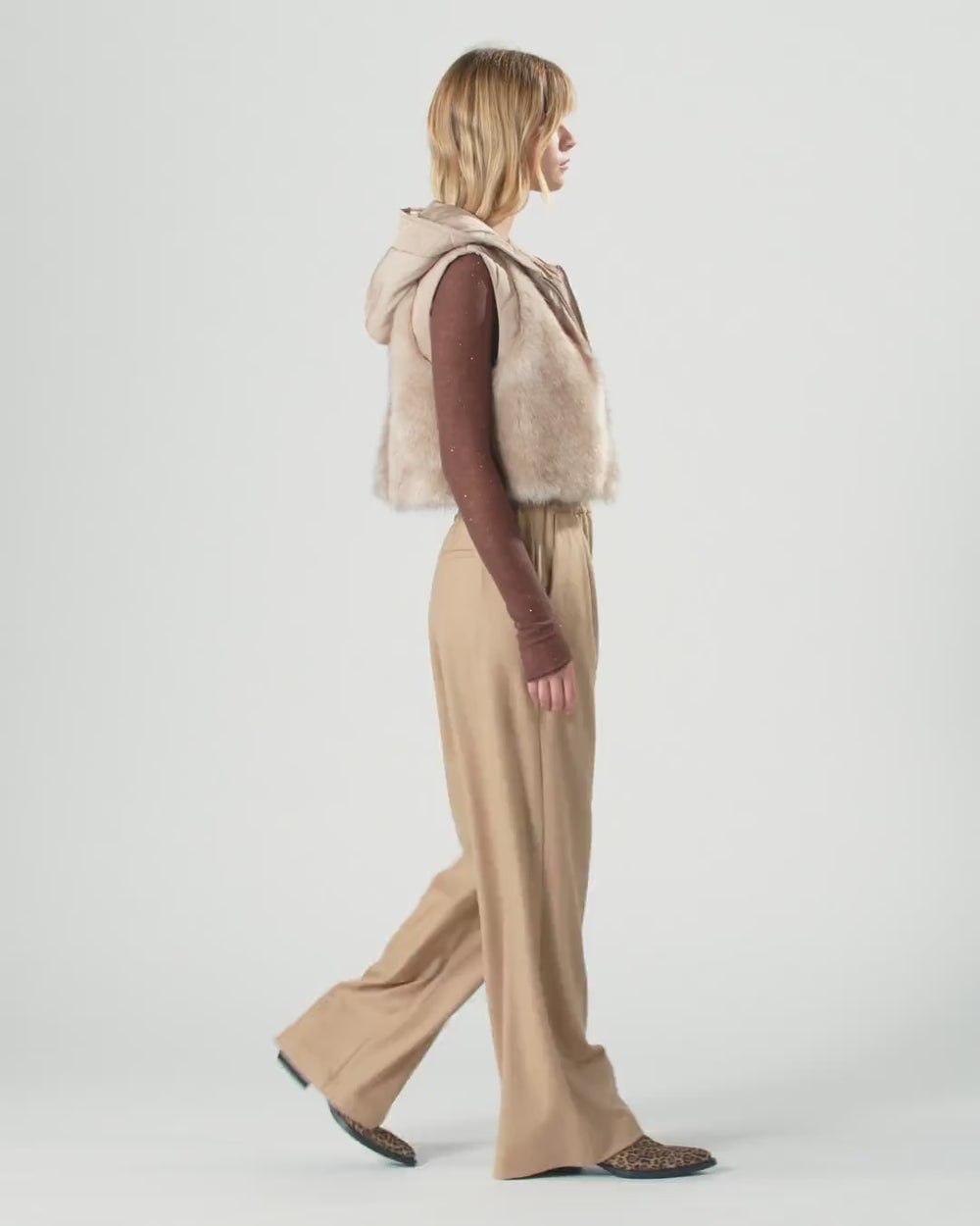 Long trousers made of yarn-dyed wool-blend jersey flannel, a fabric perfect for combining tailoring and comfort, and featuring a wide-leg silhouette with flared leg at the hem. The style combines sartorial style in the details of the rear welt pockets and the typical French pocket, with the sporty comfort of the gathered waist with elastic. Wide-leg trousers are the new must-haves of formal and elegant looks, whether for broken looks or for a new suit concept.