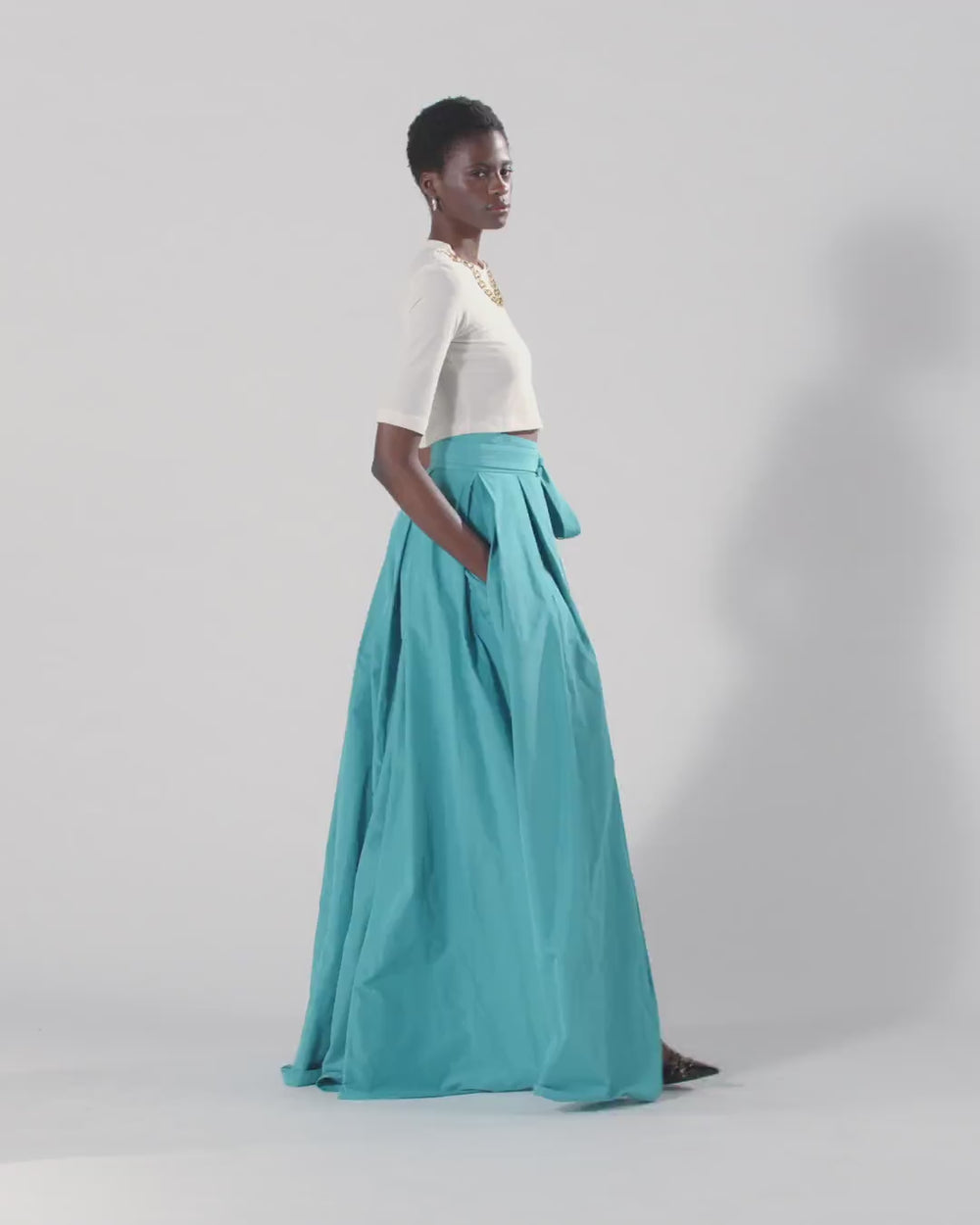 Long and voluminous skirt, featuring a flared cut with wide pleats that give depth and a wrap closure with matching ribbon to be tied at the waist as you wish. The garment is made from taffeta, a glossy fabric with a crisp, structured feel that fully embodies PINKO’s DNA, and it’s the perfect solution for your occasion outfits for the summer season: pair it with the matching crop top for a striking total look, or wear it with a contrasting top if you prefer a mixed, separates-style effect.