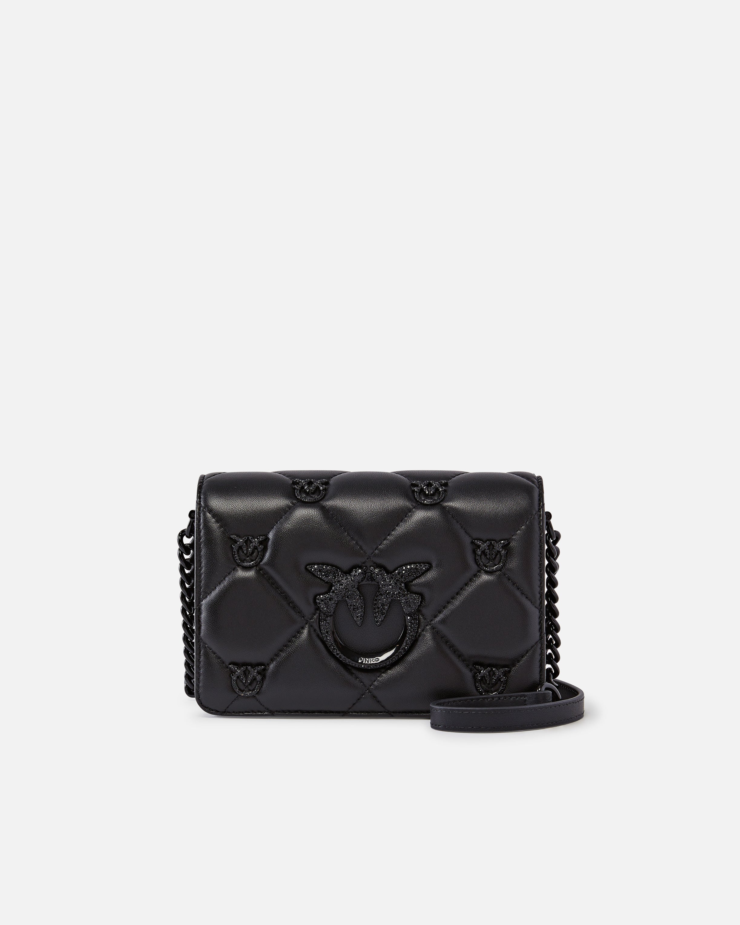 Love Bag Click rigid mini crossbody bag made of soft quilted nappa leather and customised with mini metal bird logo plaques, coated and studded with matching-colour rhinestones, as well as the iconic Love Birds Diamond Cut buckle that completes the magnetic flap fastening. The bag is complete with a strap combined with a metal, coated chain, with a practical pad for more comfortable support on the shoulder. The inside of the bag includes a zipped centre divider pocket to hold your valuables while you wear it. Activate your PINKO bag: verify the authenticity of your product and access a personalised experience by scanning the Love Birds embroidery on the back of the bag with your smartphone!