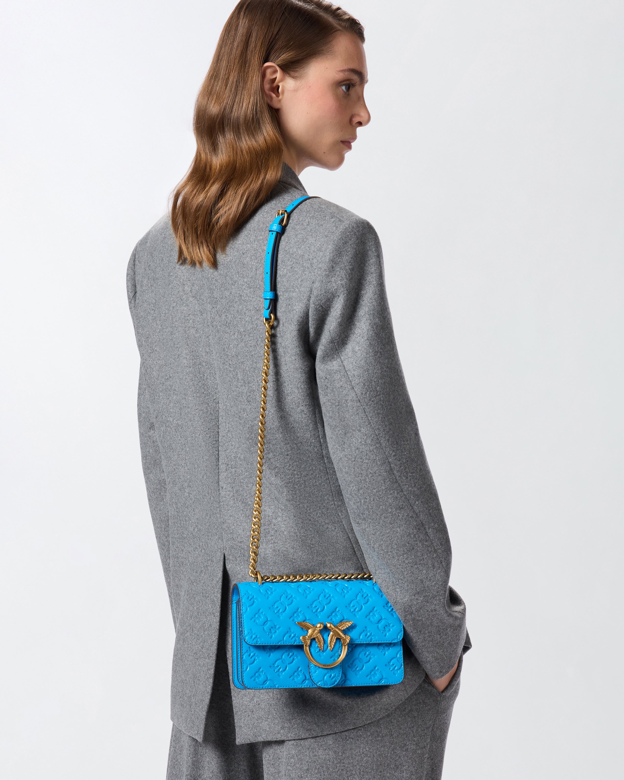 Love Bag mini crossbody bag in soft, silky leather with imprimé Love Birds Monogram motif and antique gold-electroplated Love Birds Diamond Cut buckle. Inside, it has suede lining, a leather slip pocket and a zipped centre divider pocket. The bag is complete with a shoulder strap combining a metal chain and adjustable leather shoulder pad. Activate your PINKO bag: verify the authenticity of your product and access a personalised experience by scanning the Love Birds embroidery on the back of the bag with your smartphone!
