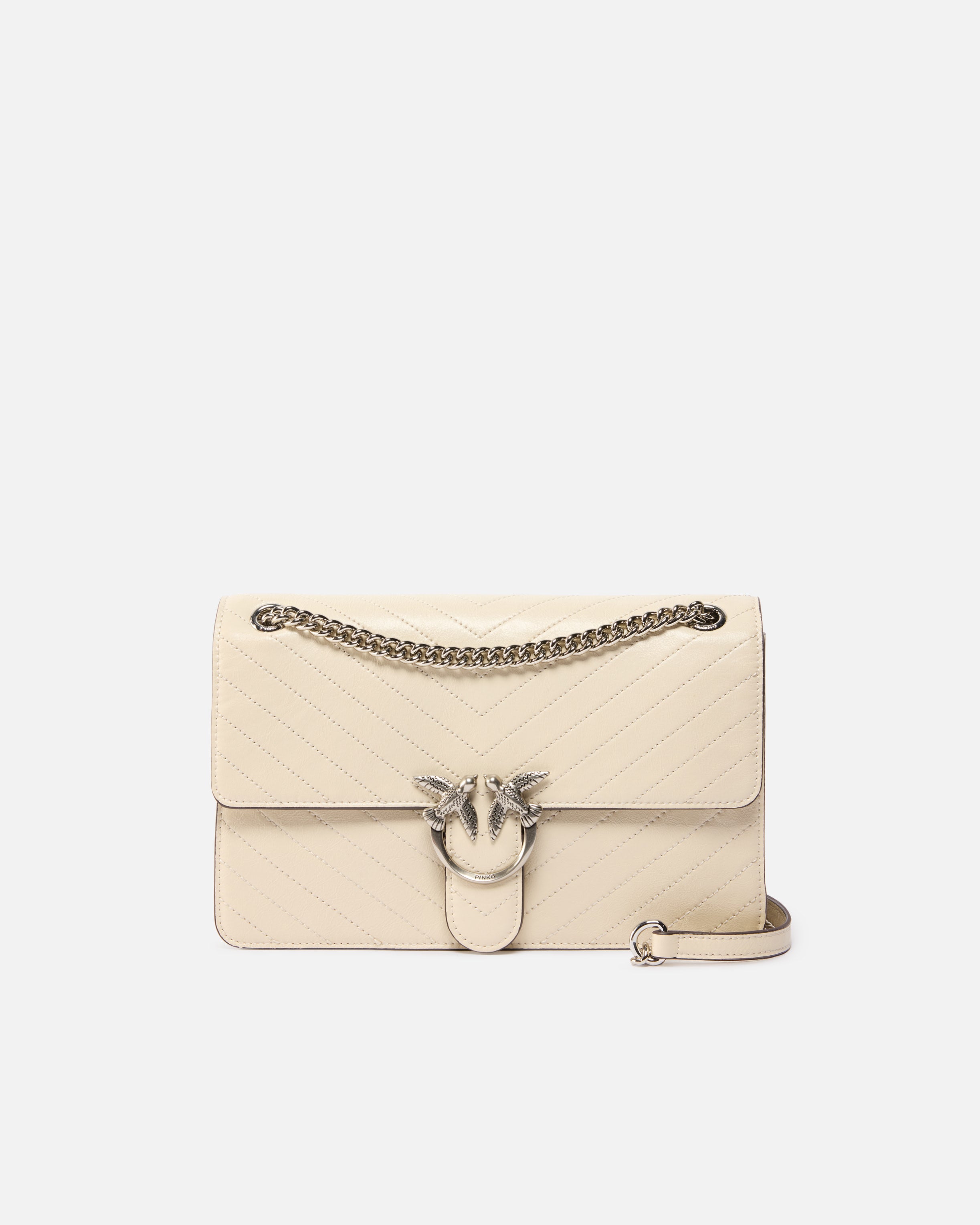 Love Bag One medium, light-structured bag in wrinkled leather embellished with chevron motif. This piece includes a rounded chain shoulder strap and leather shoulder pad, allowing you to carry it in three different ways: by hand, crossbody and on the shoulder. This bag is modern and refined, and the Love Birds Diamond Cut buckle accompanying the strap closure symbolises PINKO's singular style. The accessory features a cotton drill-lined interior and a zipped slip pocket. Activate your PINKO bag: verify the authenticity of your product and access a personalised experience by scanning the Love Birds embroidery on the back of the bag with your smartphone!
