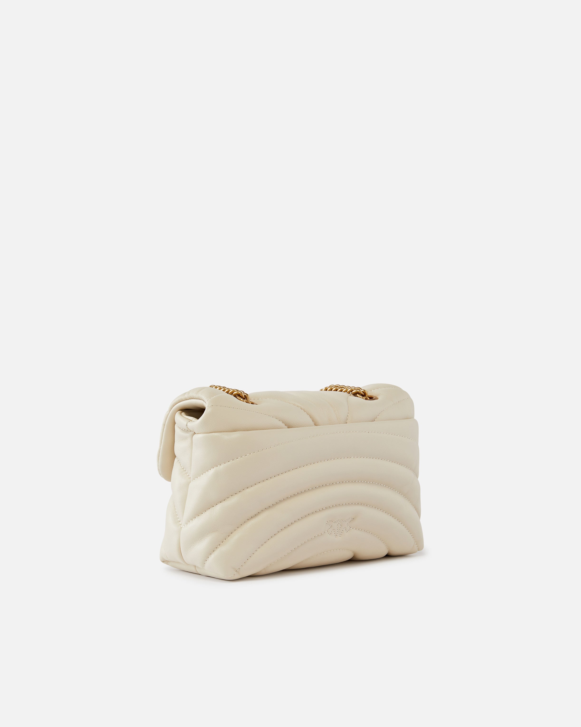 Mini Love Bag Puff small soft crossbody bag in nappa leather with quilting shaped in the characteristic outline of butterfly wings. The sliding metal chain strap with nappa leather shoulder pad can be doubled over to wear the bag on the shoulder. The flap closure is embellished with the iconic antique gold-electroplated metal Love Birds Diamond Cut buckle. The accessory boasts a microsuede-lined interior, complete with a zipped centre divider pocket and an internal pocket for better space management. Activate your PINKO bag: verify the authenticity of your product and access a personalised experience by scanning the Love Birds embroidery on the back of the bag with your smartphone!
