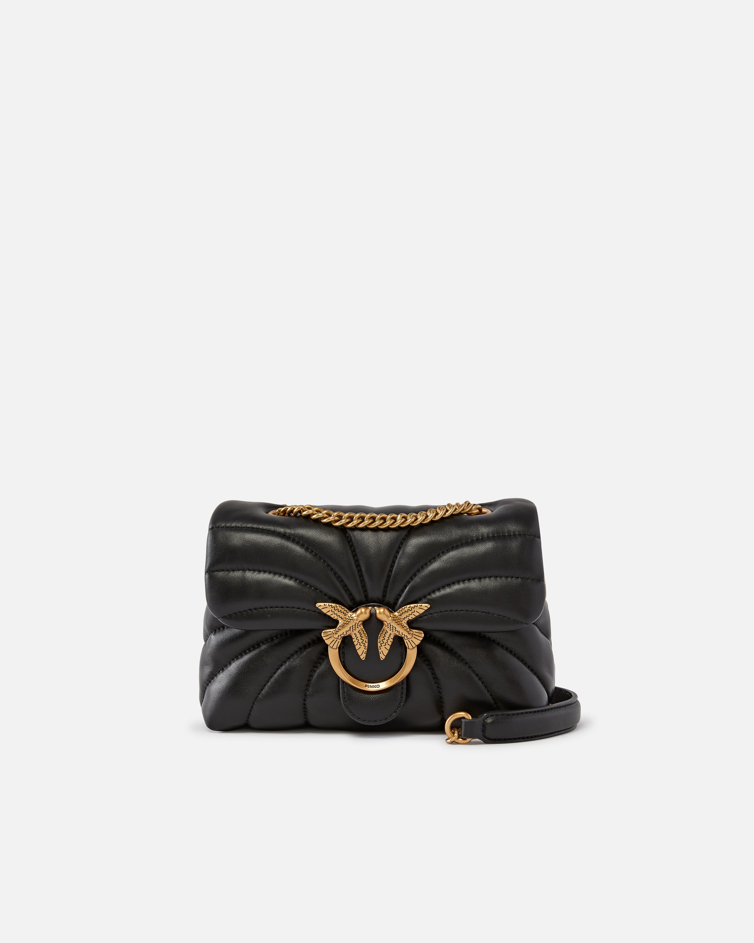 Mini Love Bag Puff small soft crossbody bag in nappa leather with quilting shaped in the characteristic outline of butterfly wings. The sliding metal chain strap with nappa leather shoulder pad can be doubled over to wear the bag on the shoulder. The flap closure is embellished with the iconic antique gold-electroplated metal Love Birds Diamond Cut buckle. The accessory boasts a microsuede-lined interior, complete with a zipped centre divider pocket and an internal pocket for better space management. Activate your PINKO bag: verify the authenticity of your product and access a personalised experience by scanning the Love Birds embroidery on the back of the bag with your smartphone!