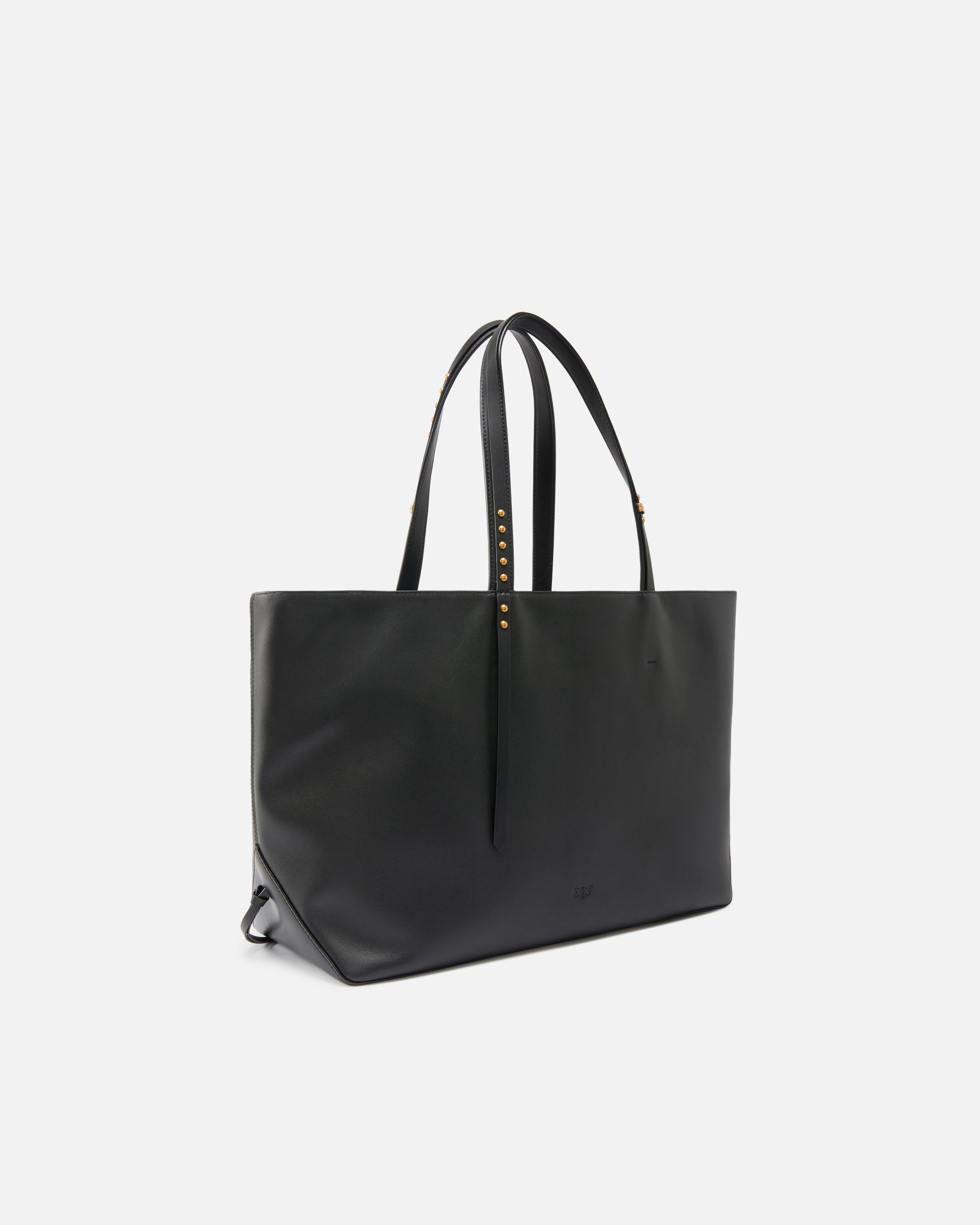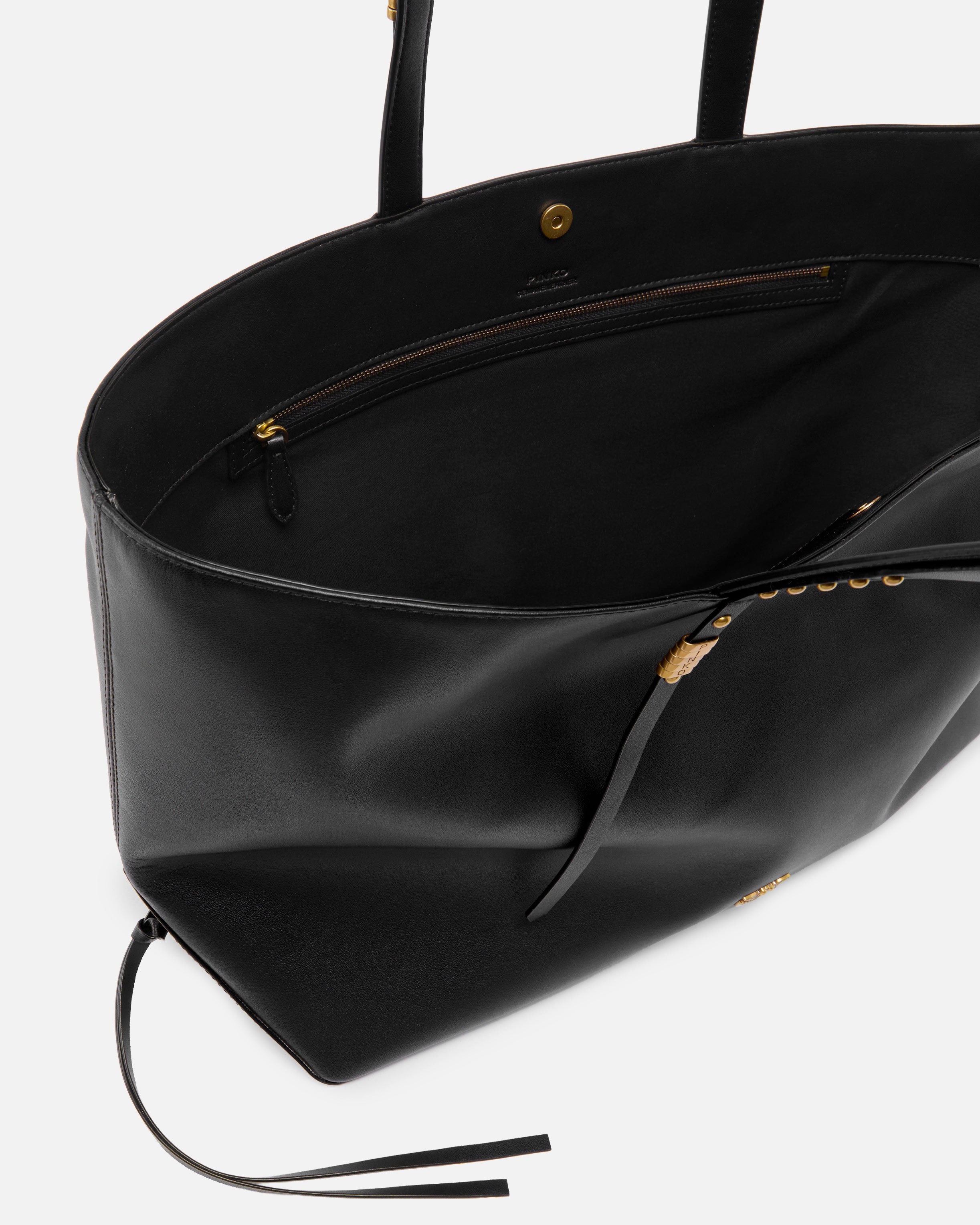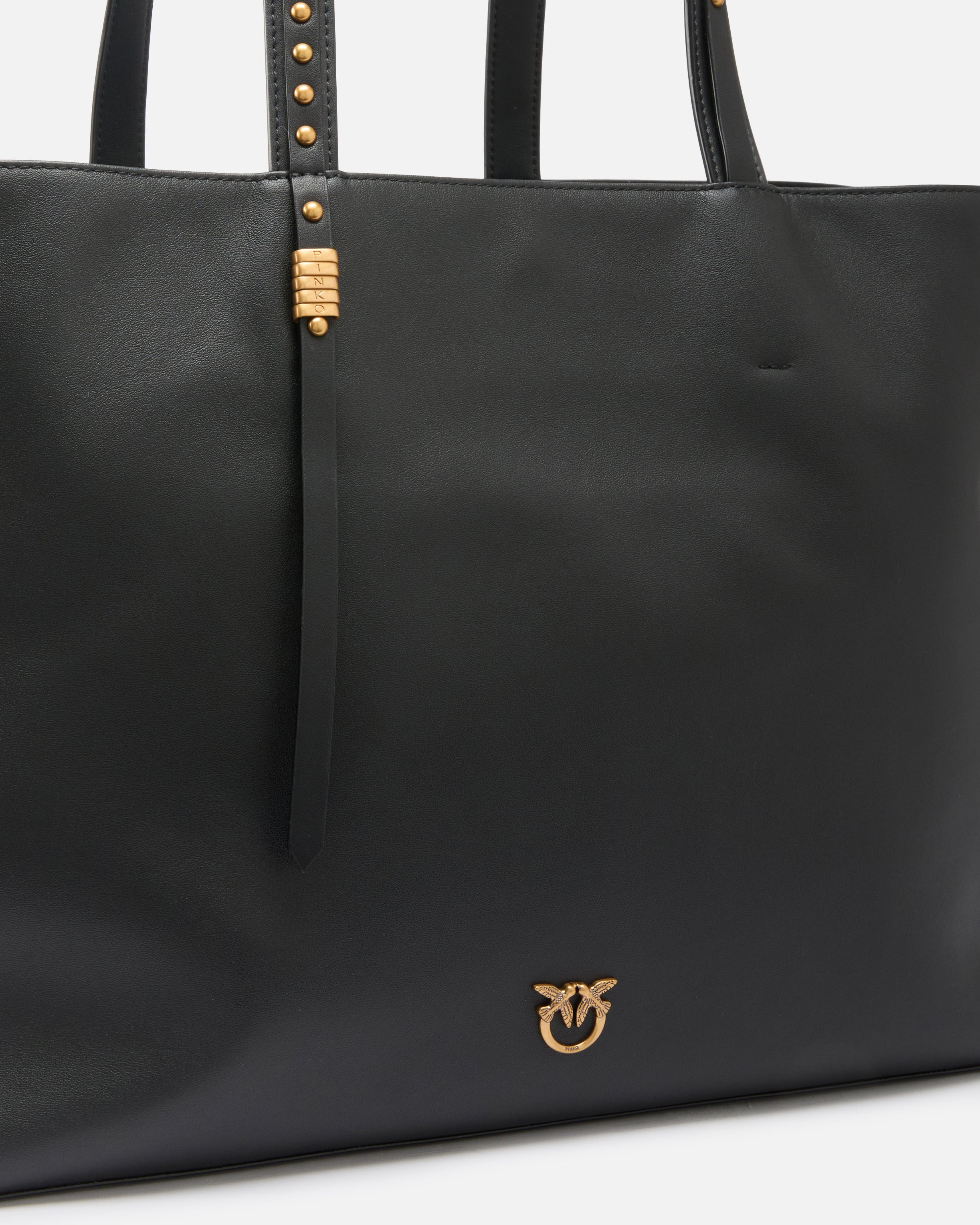 Medium-sized shopper bag with an elongated shape, made from soft leather and customised with metal decorative elements along the upper handles: a series of small round studs and rings arranged to form the PINKO logo lettering. Designed for comfortable shoulder wear thanks to its two handles, the style is enhanced by side straps at the bottom and a small metallic detail depicting the iconic Love Birds Diamond Cut logo on the front. This accessory, perfect for carrying your essentials with you throughout the day, is the solution you've been looking for to give your outfits a touch of elegance without sacrificing functionality. Activate your PINKO bag: verify the authenticity of your product and access a personalised experience by scanning the Love Birds embroidery on the back of the bag with your smartphone! - CABAS CLASSIC BAG
