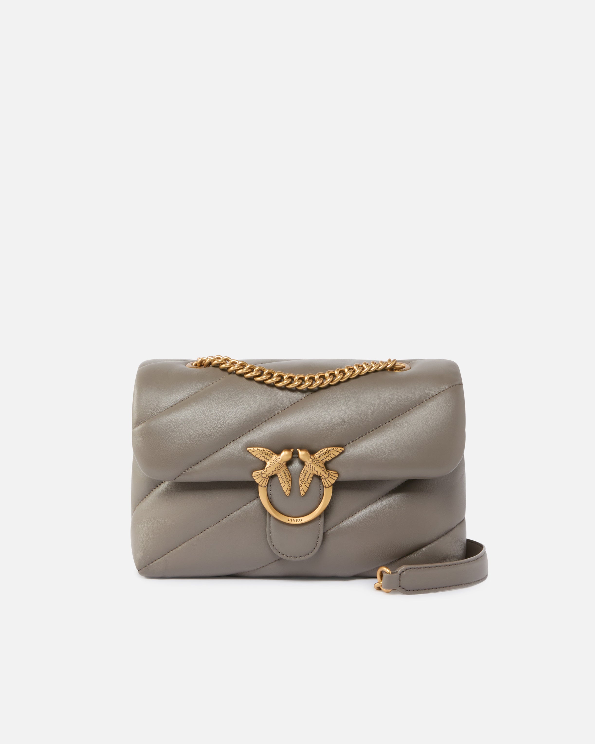 Classic Love Bag Puff in soft nappa leather featuring maxi slanted quilting. The fastening is embellished with the iconic metal Love Birds Diamond Cut buckle. The accessory boasts a microsuede-lined interior, complete with a zipped centre divider pocket and slip pocket. The shoulder strap combines the classic round metal chain with a practical nappa leather shoulder pad. - CLASSIC LOVE BAG PUFF MAXI QUILT