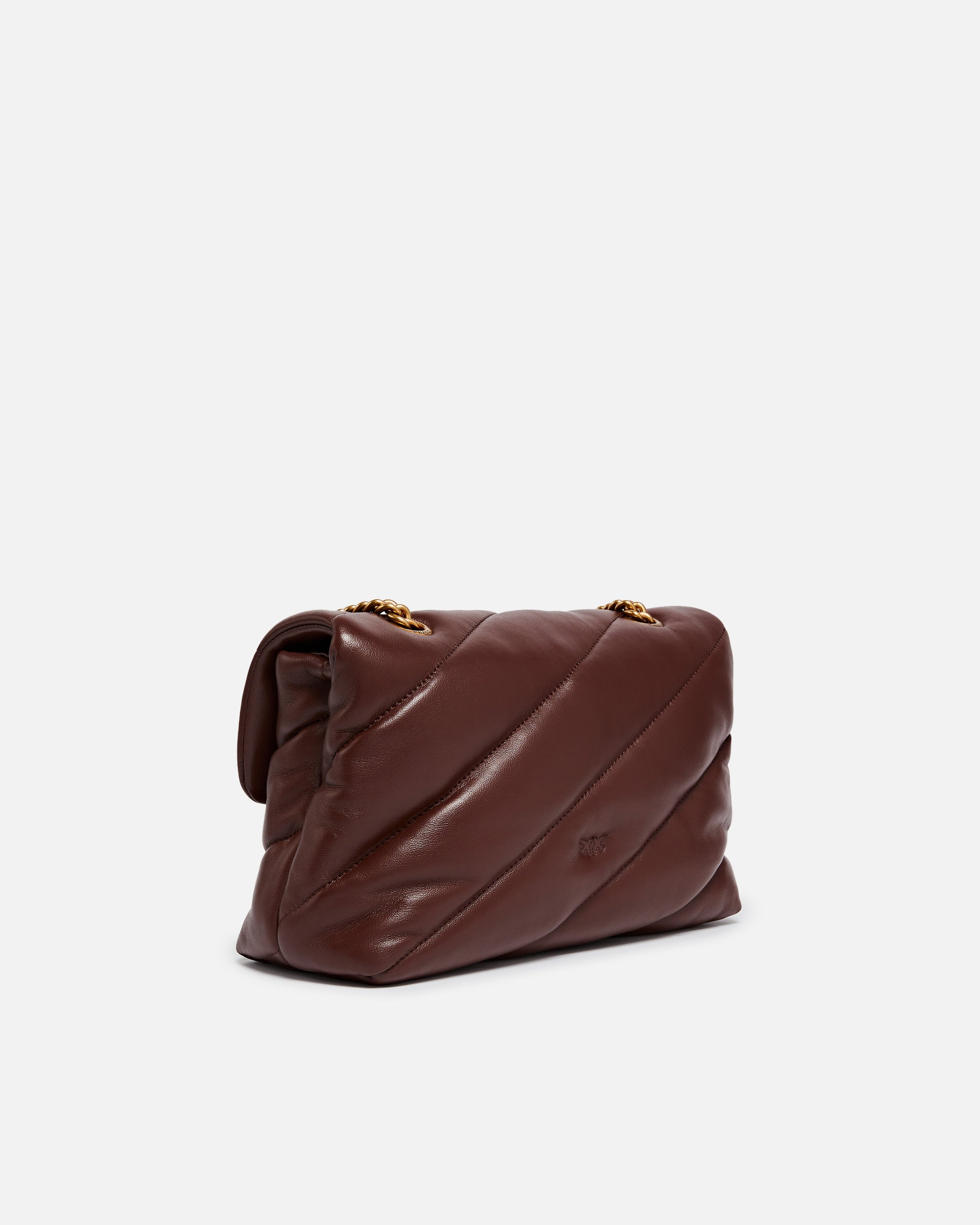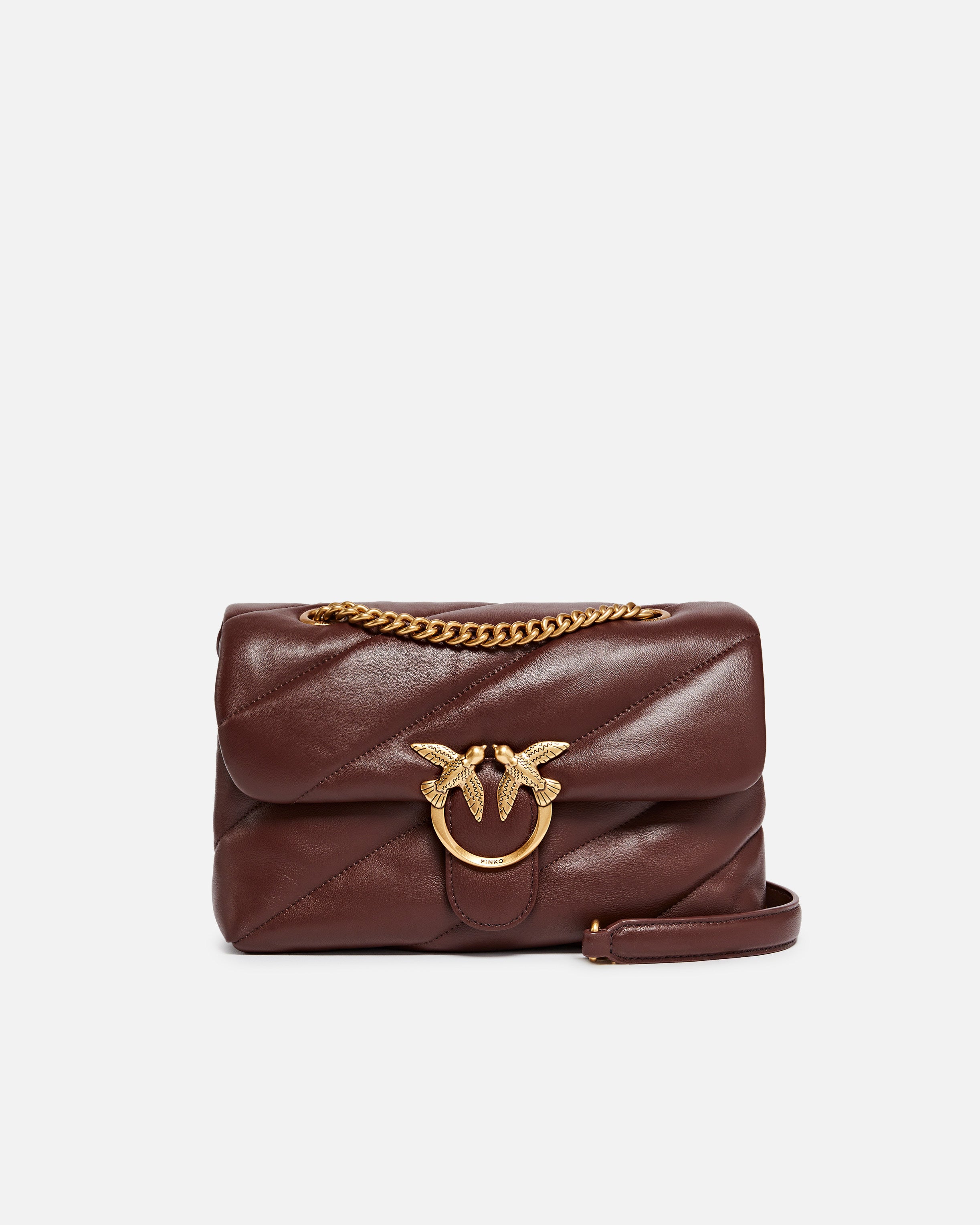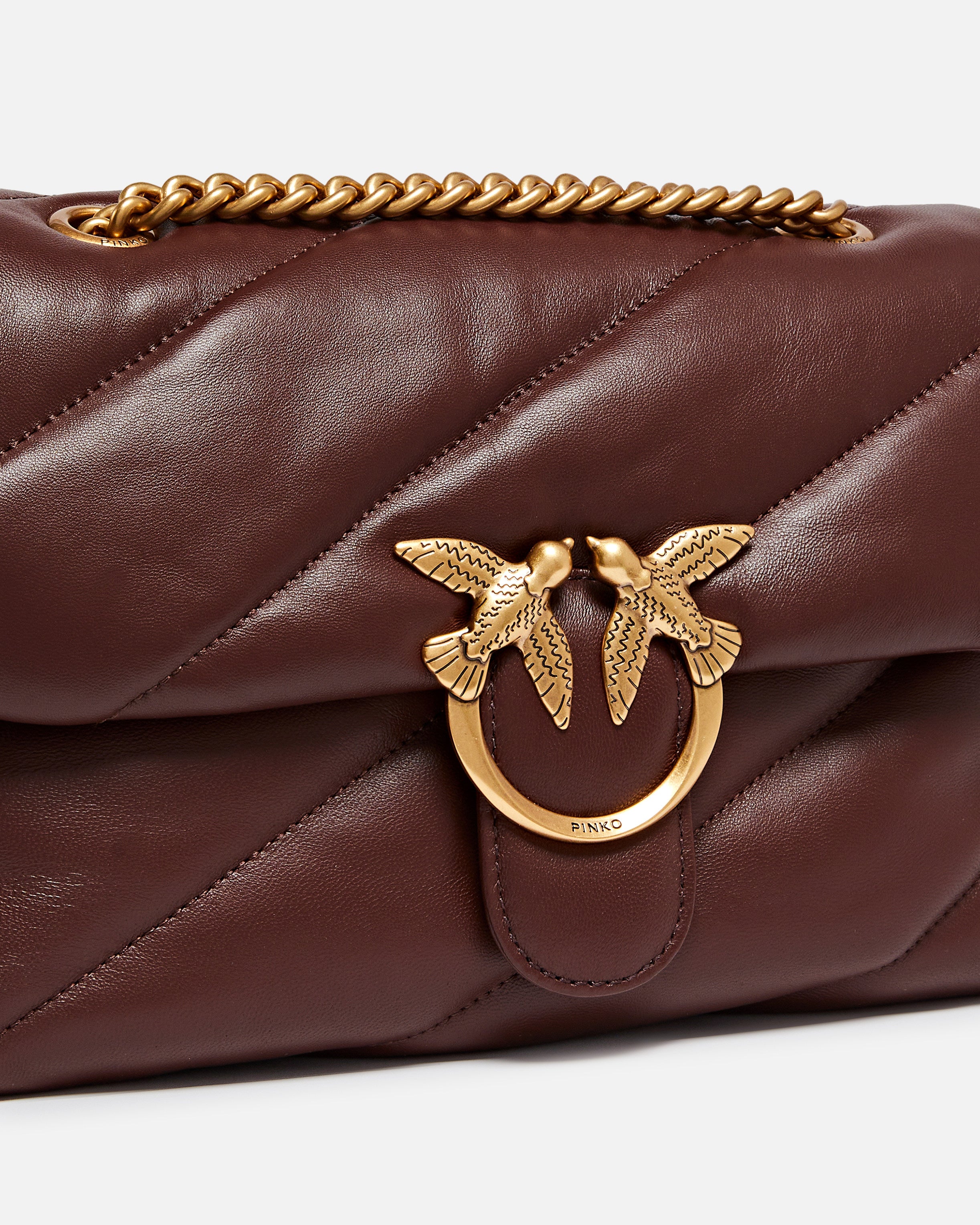 Classic Love Bag Puff in soft nappa leather featuring maxi slanted quilting. The fastening is embellished with the iconic metal Love Birds Diamond Cut buckle. The accessory boasts a microsuede-lined interior, complete with a zipped centre divider pocket and slip pocket. The shoulder strap combines the classic round metal chain with a practical nappa leather shoulder pad. - CLASSIC LOVE BAG PUFF MAXI QUILT
