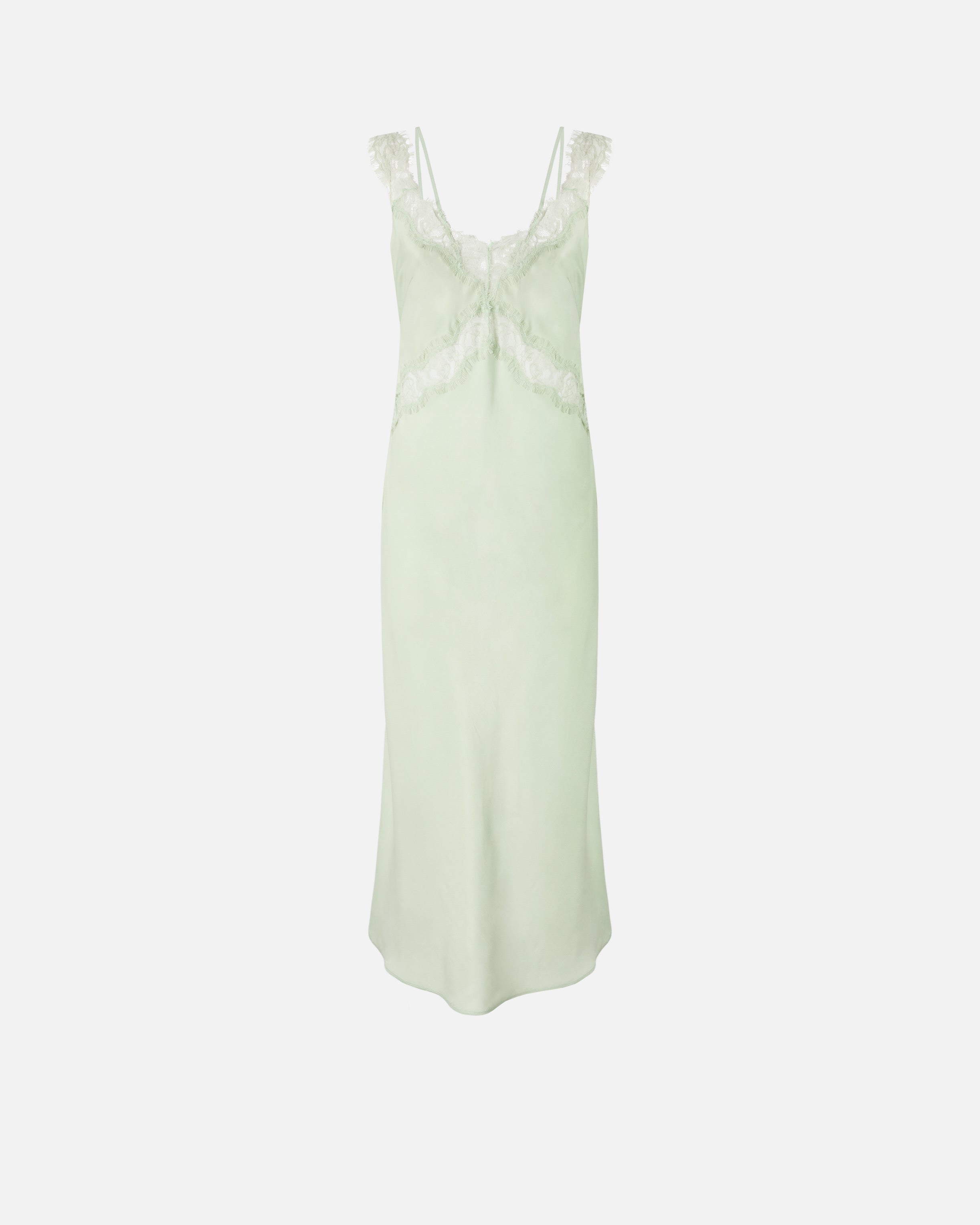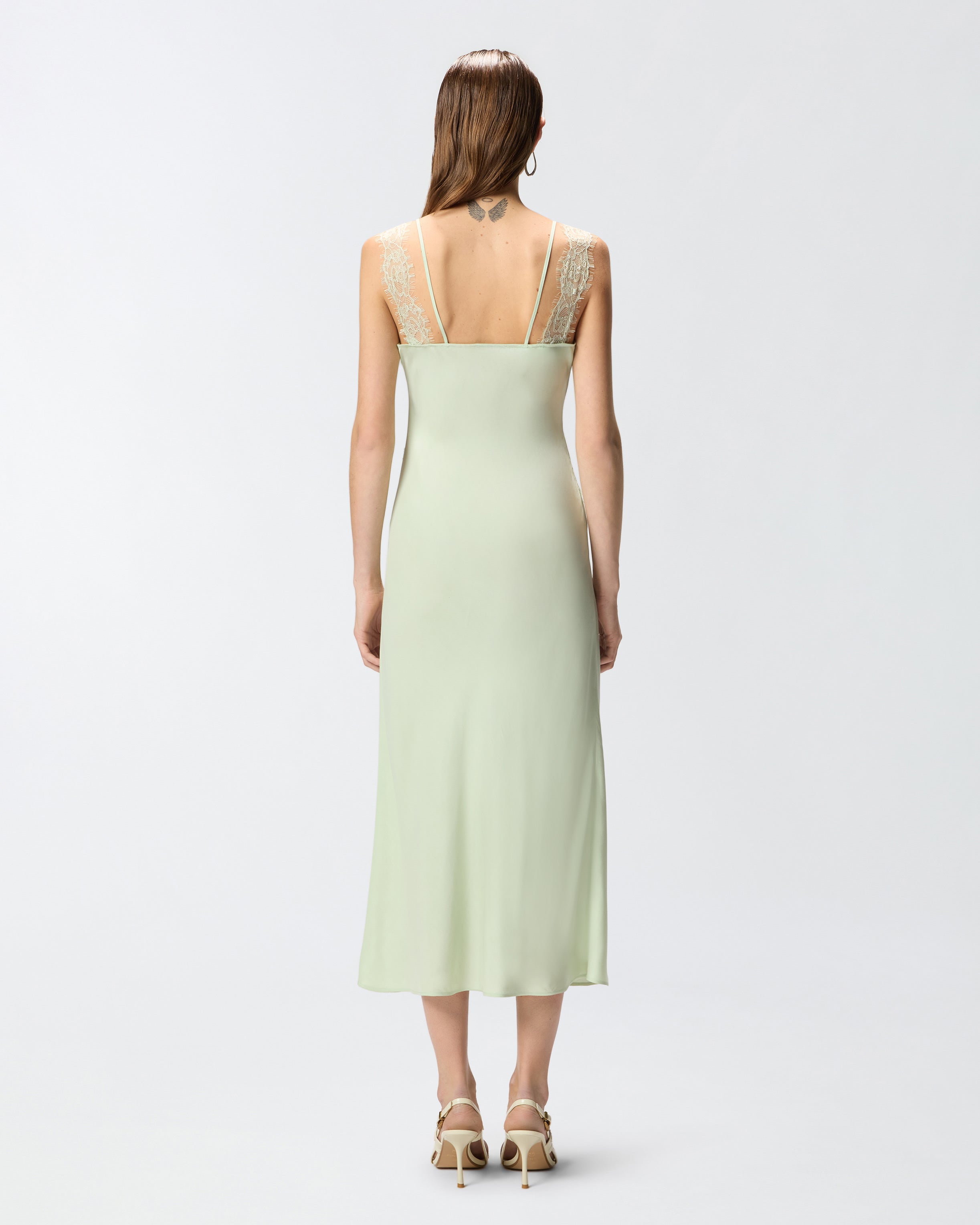 Slim-fitting midi dress with a slightly wavy hem, made of viscose twill, a fluid and resistant fabric that is perfect for following the silhouette naturally. The sleeveless garment offers a PINKO reinterpretation of the lingerie style through refined inlaid lace bands that cross the front, outline the V-neck and continue in the form of shoulder straps. This elegant dress with a touch of sensuality, which is ideal for exclusive events, ceremonies and special evenings, is complete with two thin straps coordinated to the main fabric to be worn both visible and hidden. - ANISE DRESS