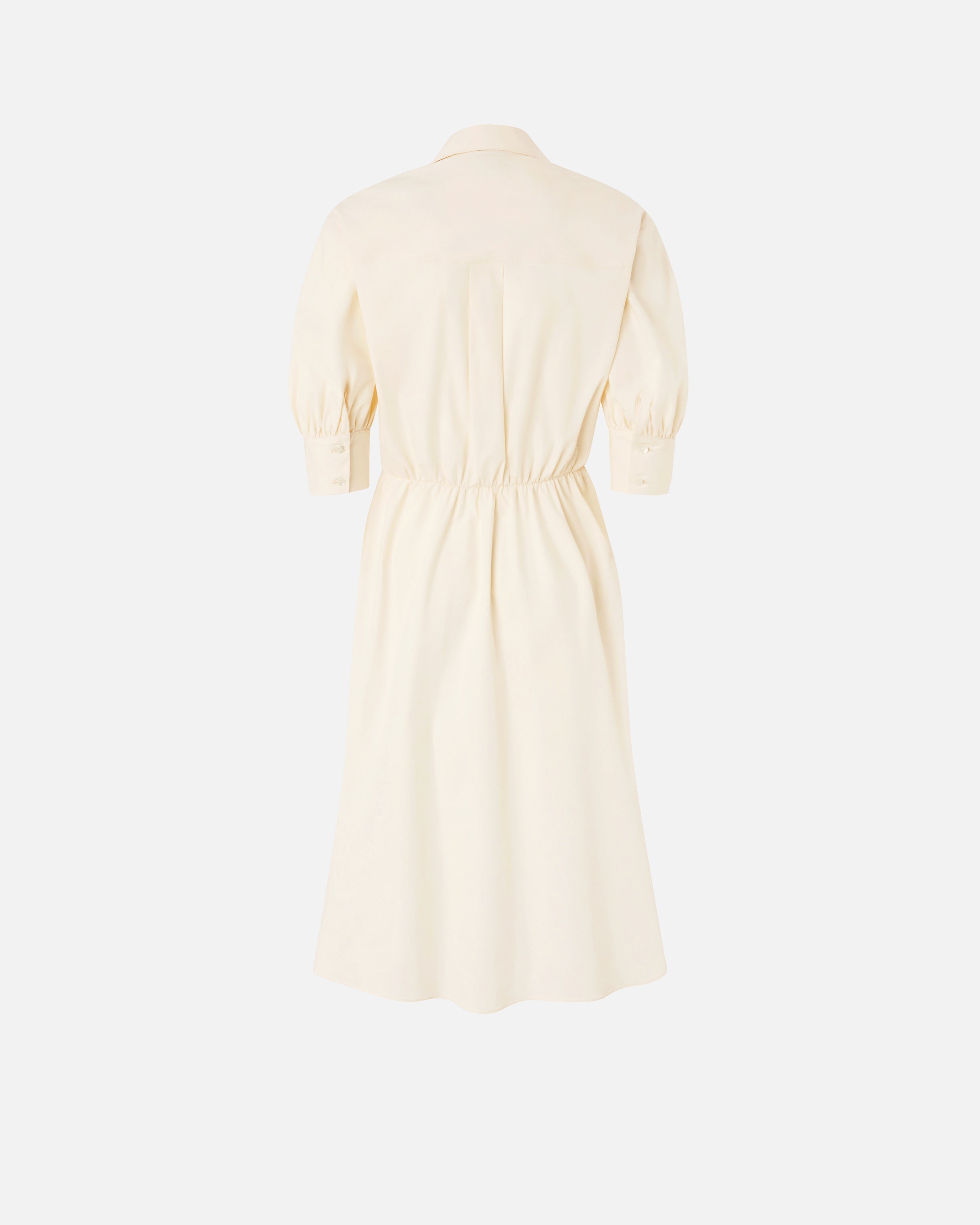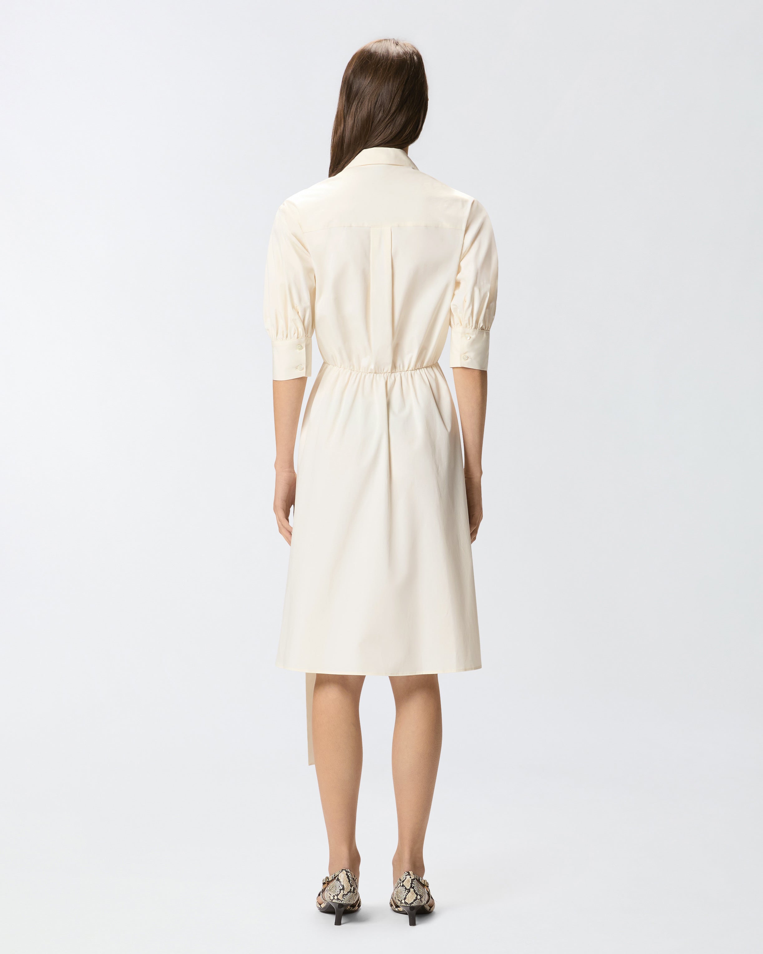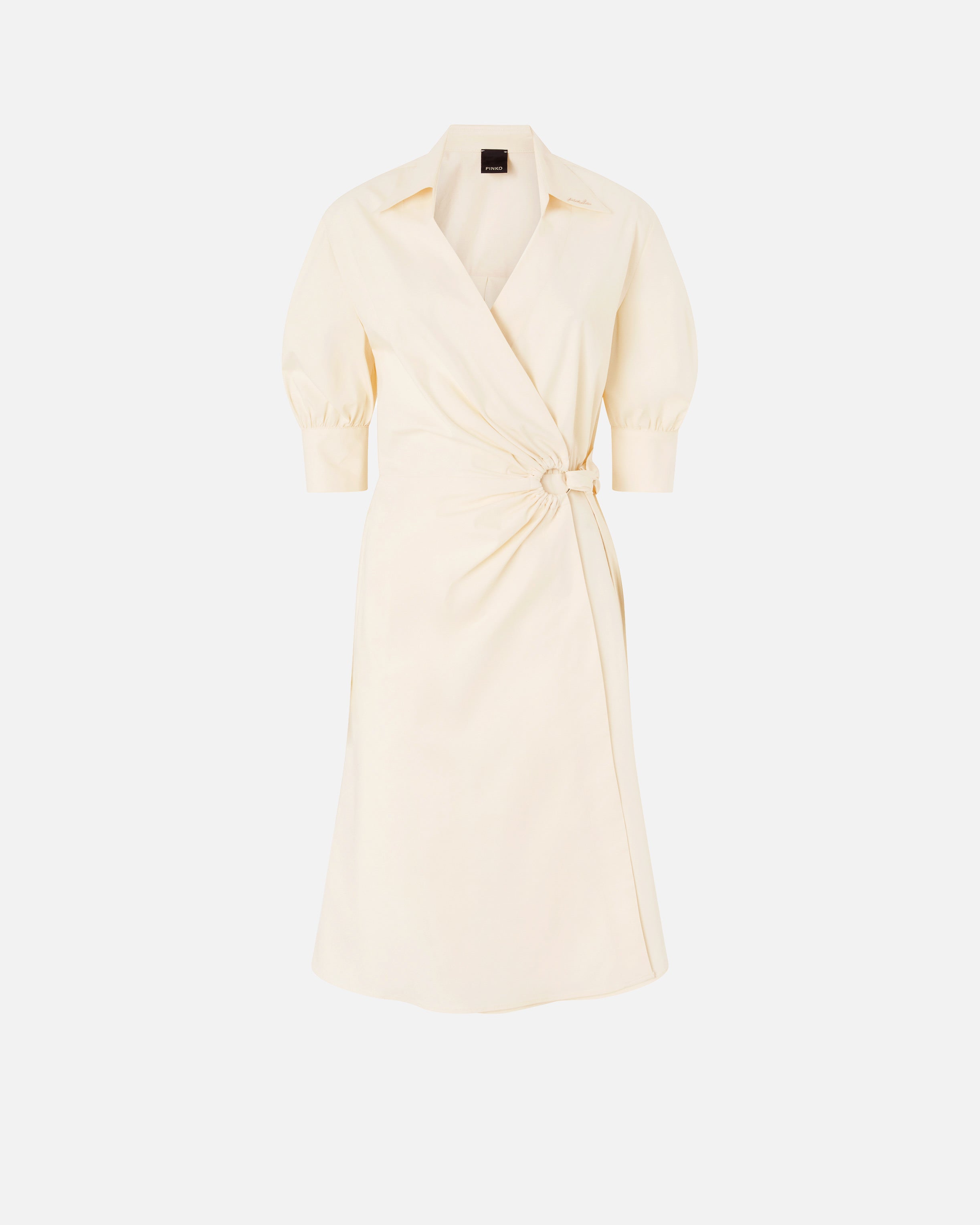Midi dress with bodice featuring short balloon sleeves with buttons at the end and shirt collar with V-shaped opening and PINKO logo lettering embroidered in italics. This garment is made from comfortable cotton poplin with a soft yet compact feel, made extra special by the wraparound design, fastened on one side with a soft ribbon threaded through the ring detail. This dress, complete with an elastic insert and gathering on the back of the waist and a refined double-pleated rear yoke, is unrivalled in its versatility, perfect for various occasions day or night. - ALINE DRESS