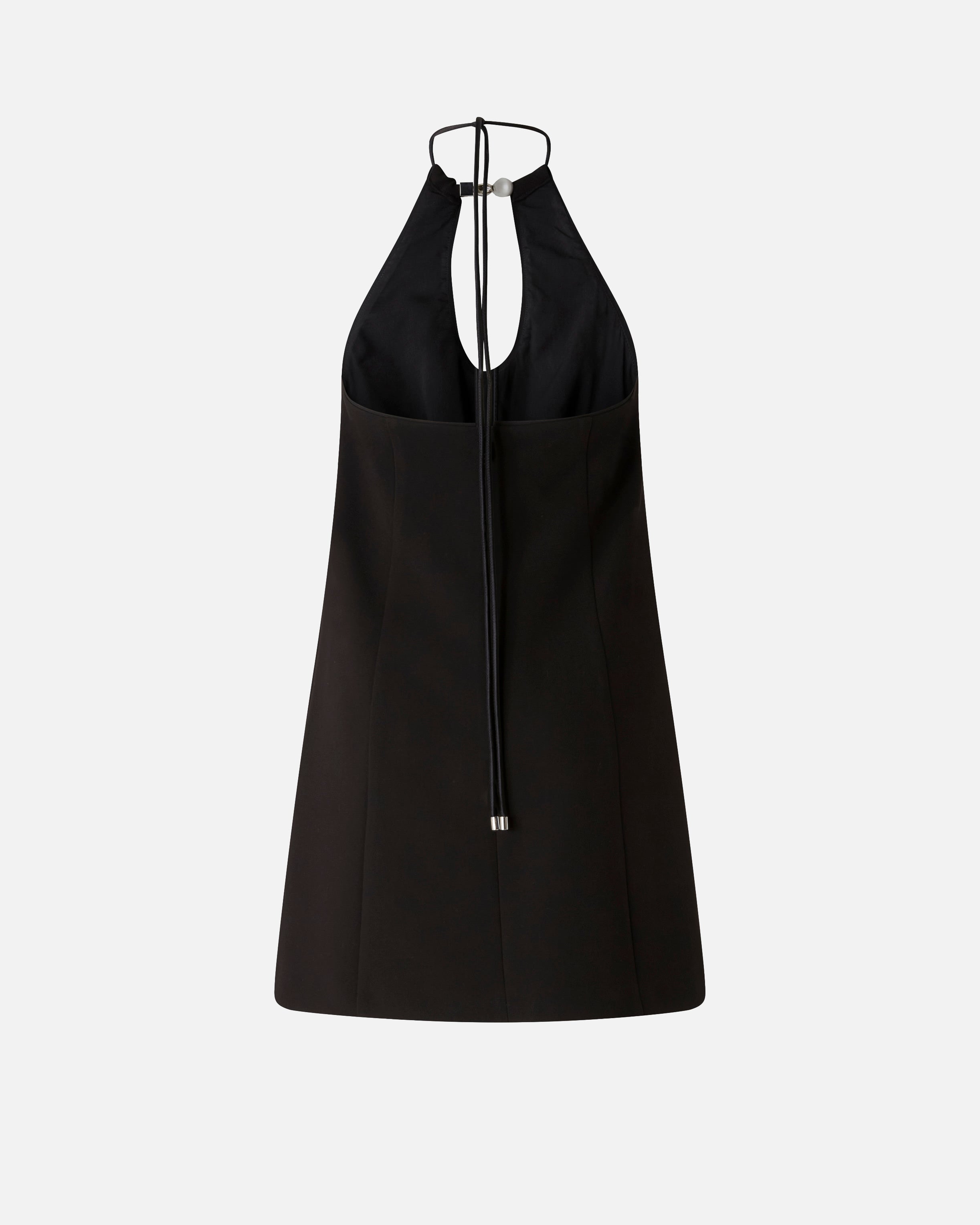 Short, flared dress with keyhole neck, back zip and invisible pockets. A touch of sensuality is provided by the bared back, which is caressed by the tie on the neck that falls free, creating movement. The technical viscose fabric manages to combine softness and fluidity to create a sophisticated texture that offers optimal comfort and fit, without losing the structured appearance of the design. The clean, modern lines of the design are embellished by distinctive accents, such as the pearl and metal bejewelled details on the choker. Liven up your special occasions and elegant soirées with this evening dress, designed to make your femininity stand out, especially when paired with high-heeled pumps.