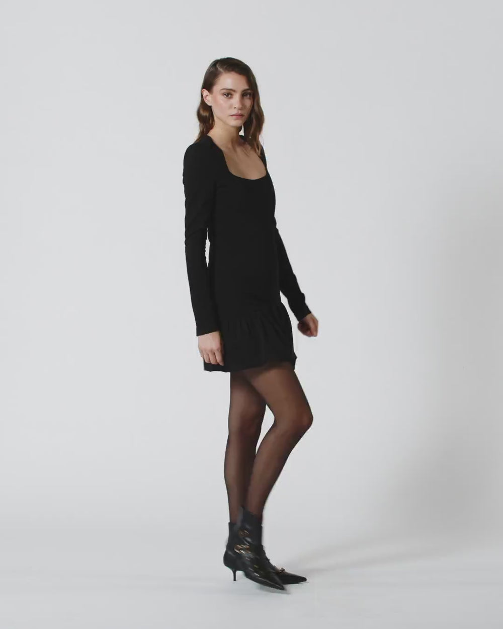 Short dress in full Milano-knit stretch viscose fabric. This knit fabric is particularly comfortable and stands out for its compact hand, which goes perfectly with the style’s fitted, slim fit. The garment is completed by long sleeves, a square neckline and an asymmetrical flounce on the hem that creates a loose skirt. Invisible zip fastening on the back.