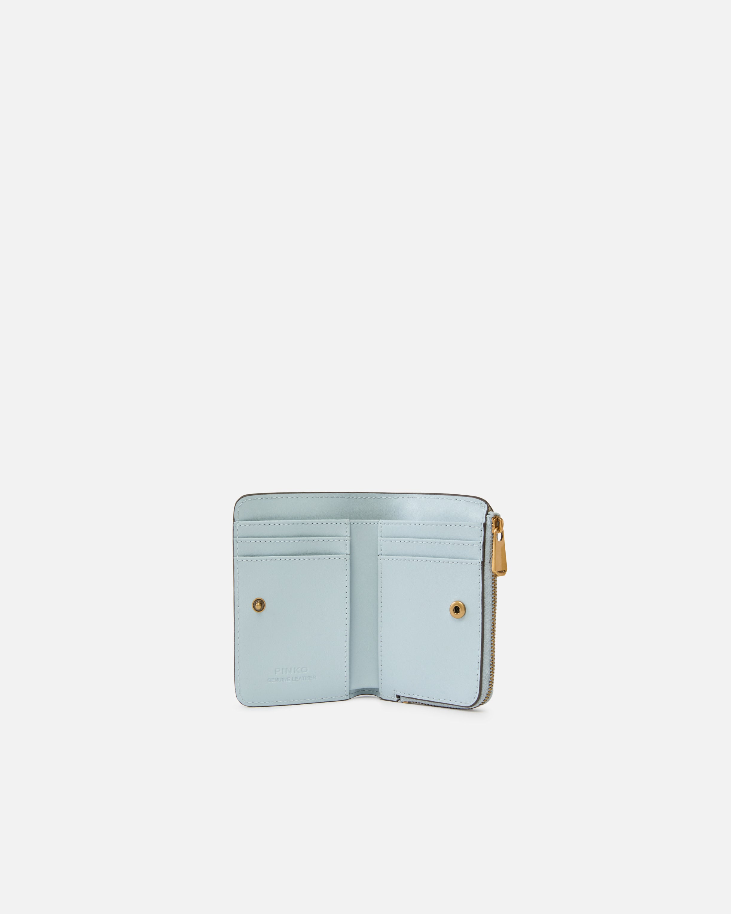 Compact and multifunctional small rectangular wallet in soft, silky leather with a smooth texture. Inside, the accessory is well organised with several slots for cards and documents, while the outside features a a zippered coin compartment and is customised with a metal plaque sporting the iconic Love Birds Diamond Cut logo. Fastened with an inner button to maintain its compact shape, this wallet is ideal for even the smallest bags. Activate your PINKO accessory: verify the authenticity of your product and access a personalised experience by scanning the Love Birds embroidery on the back with your smartphone! - MINI WALLET