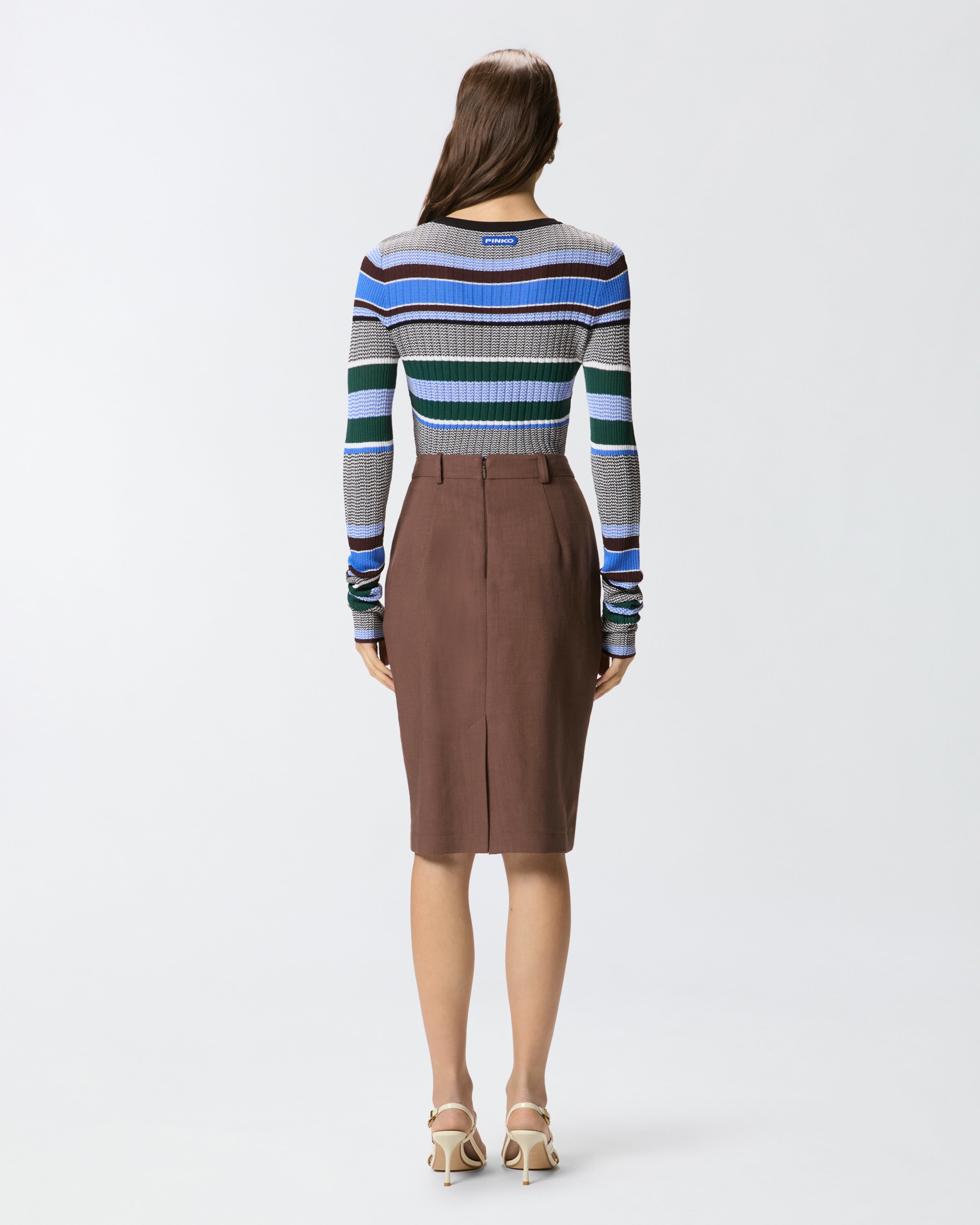 Long-sleeved and slim-fitting crew-neck sweater. Perfect for breathing life into new daytime looks, this model is made from ribbed knit viscose fabric—a particularly stretchy and comfortable material designed to caress the body in a natural way—and is customised with a multicoloured pattern with stripes that differ in thickness, lending a dynamic edge and extra movement. The final touch is given by the label with PINKO logo lettering on the back.