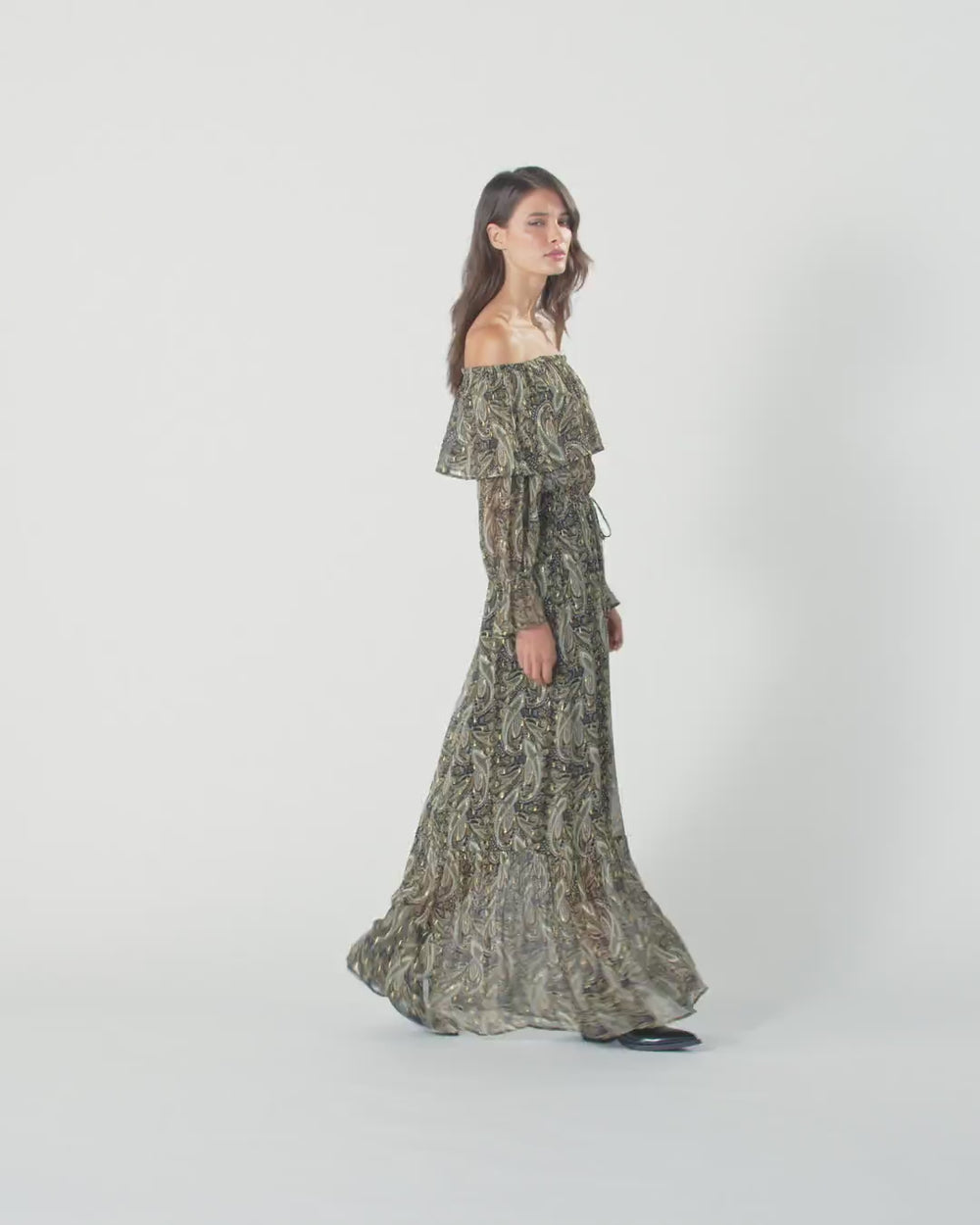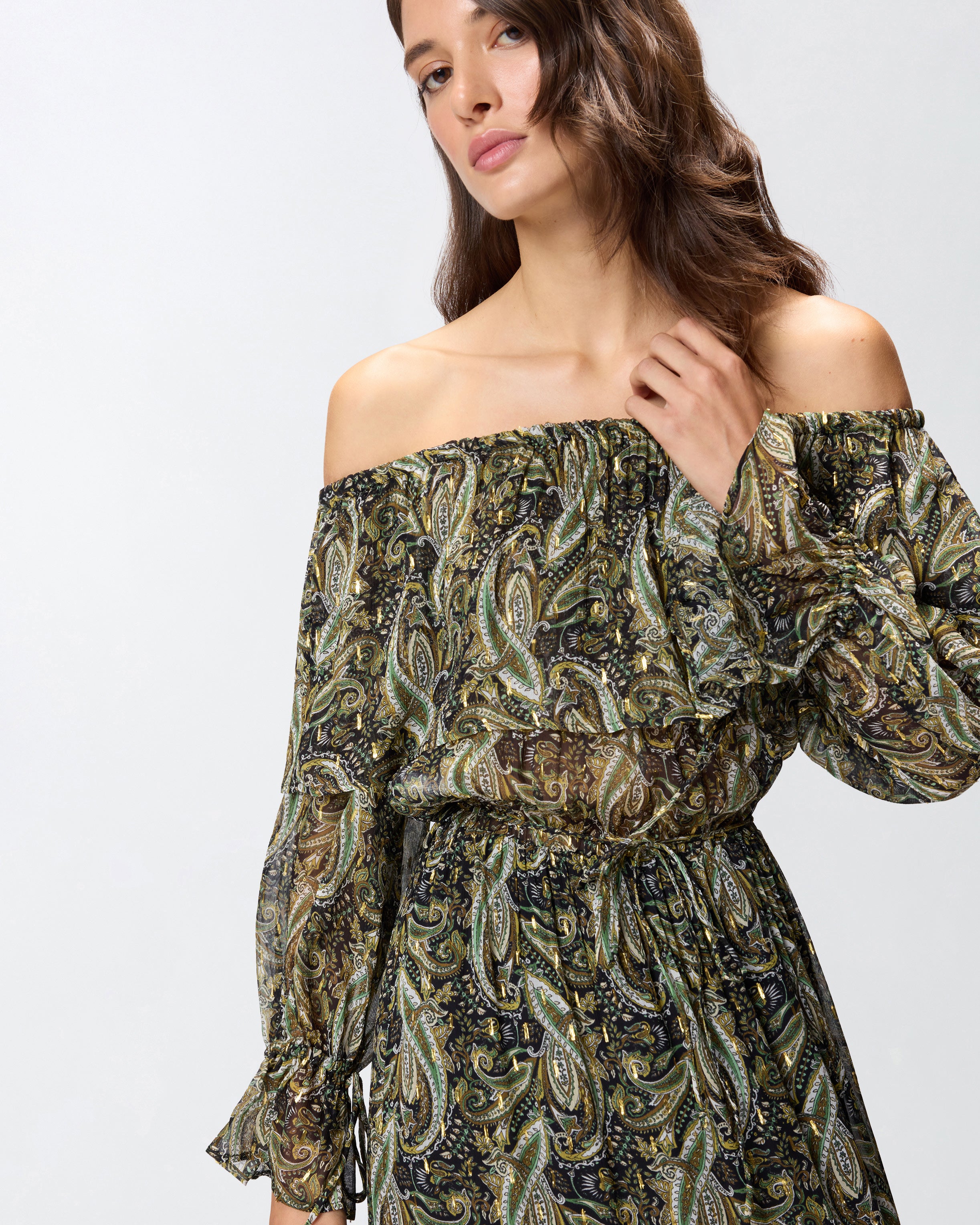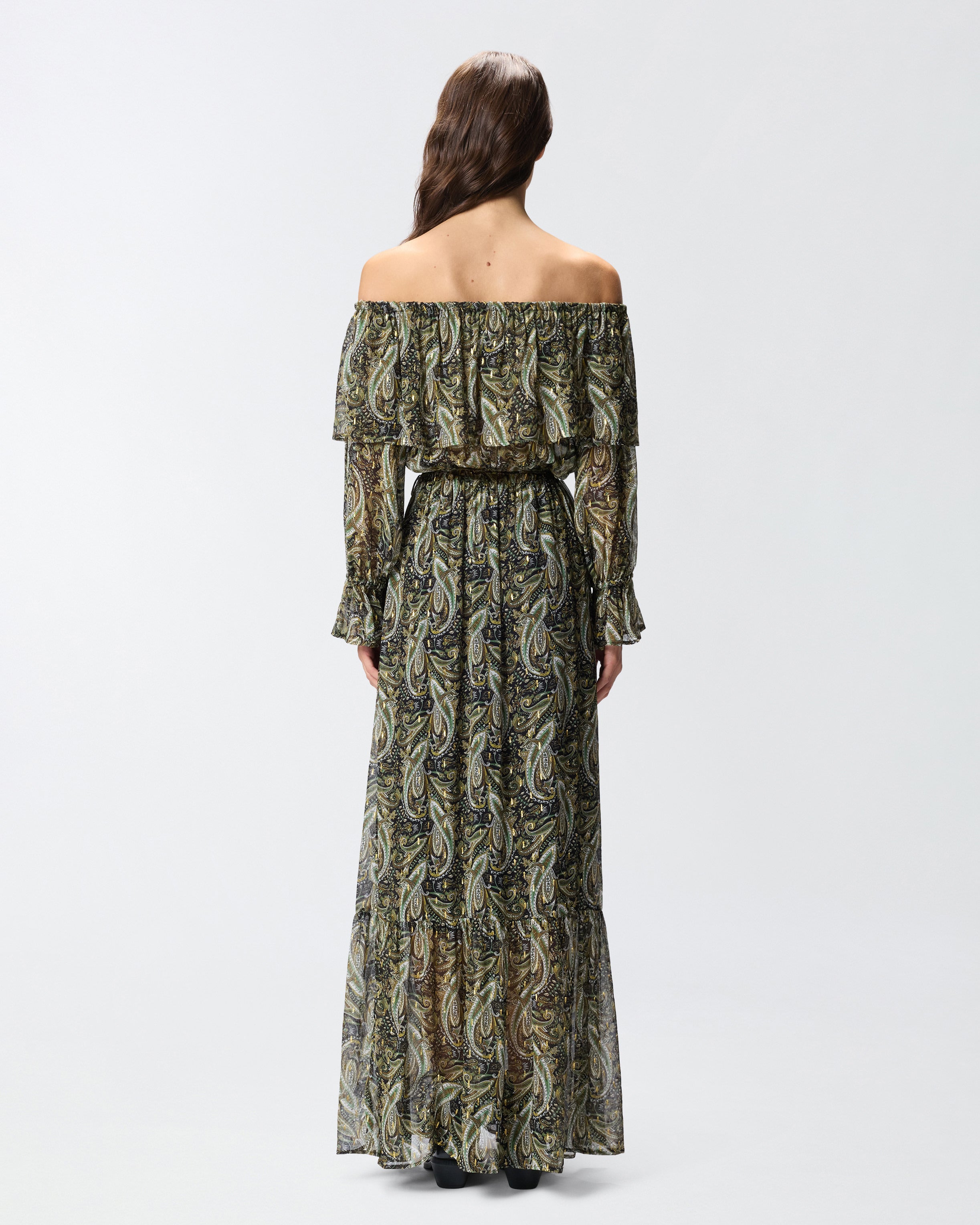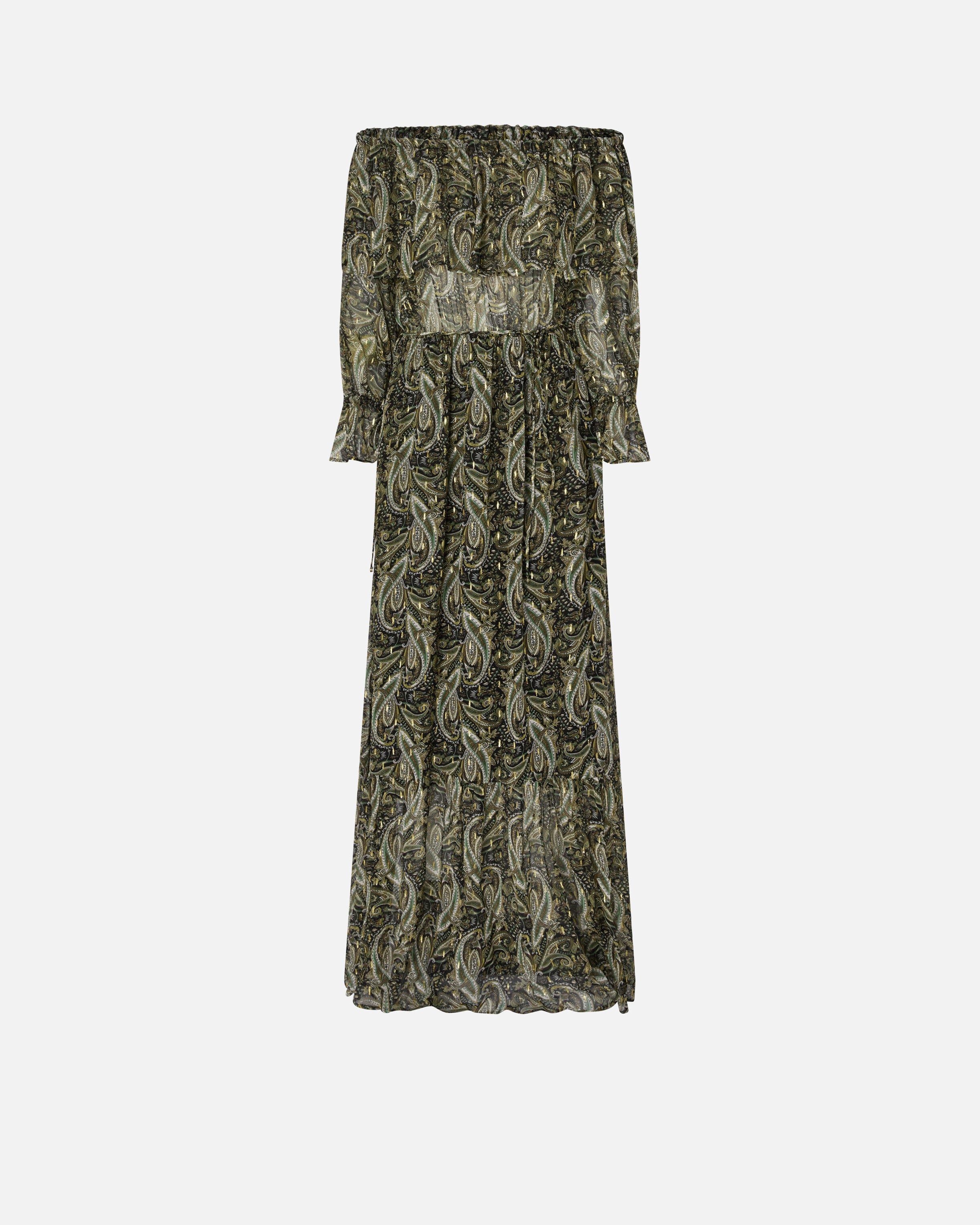 Off-the-shoulder long dress with long, ruffled-end sleeves and wide flounced skirt. This piece is made from lightweight semi-sheer viscose crepon and is embellished with a sophisticated cashmere-inspired print with metallic-thread detailing for extra radiance. The light weight and playful, feminine sheer effects make this women's dress the ideal choice for a boho-chic evening look.