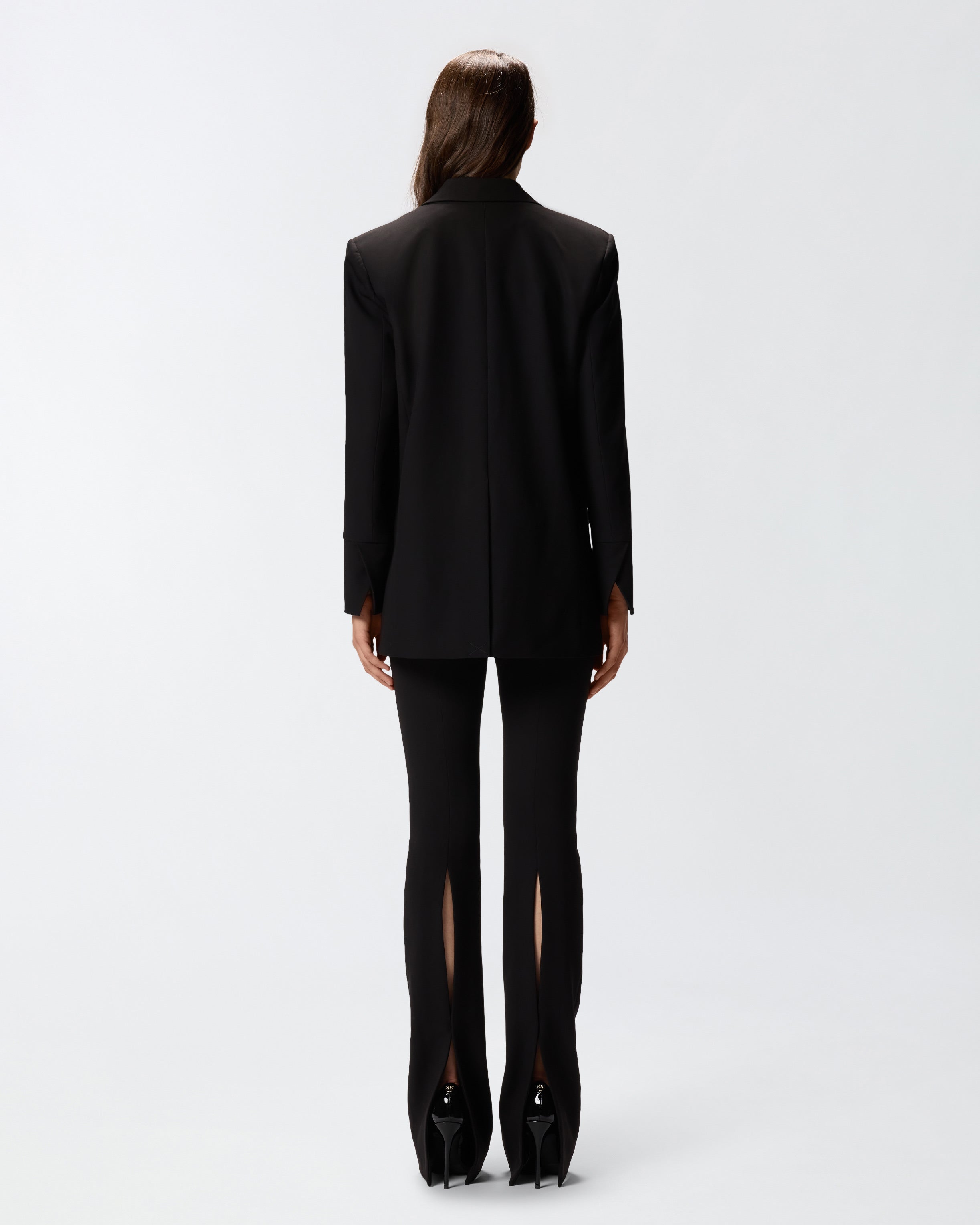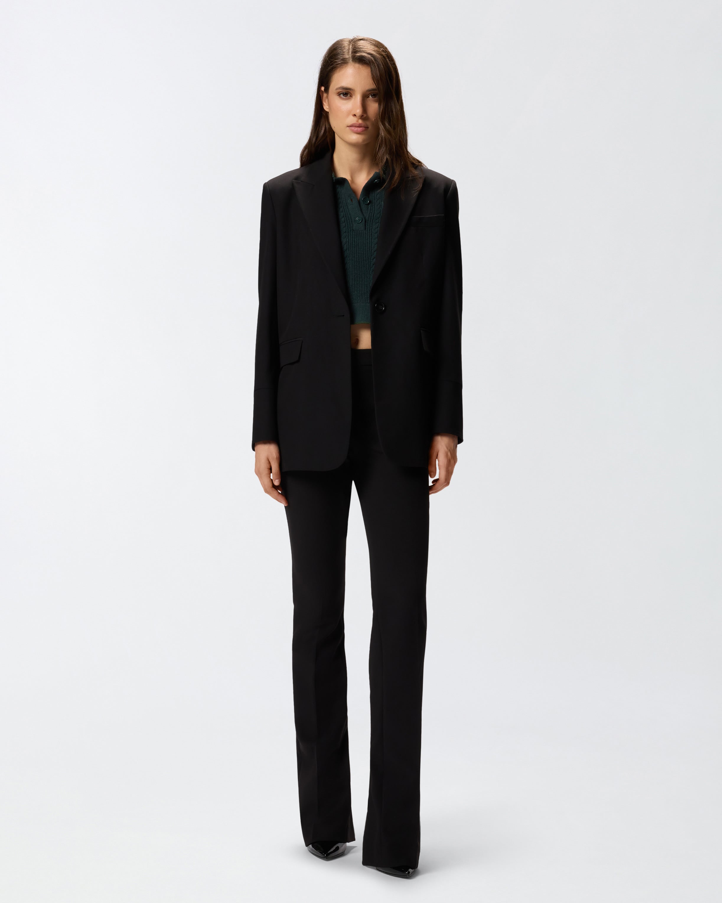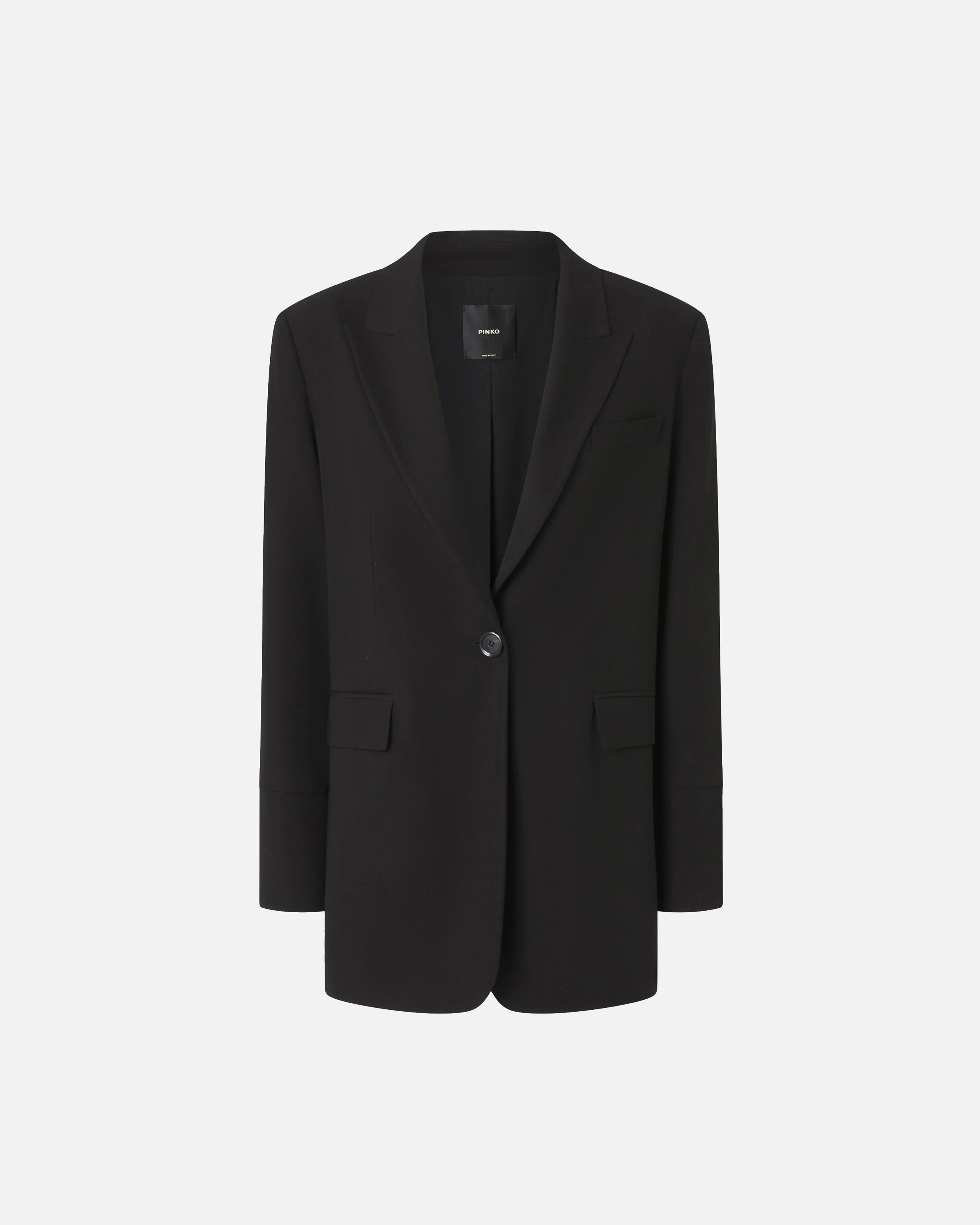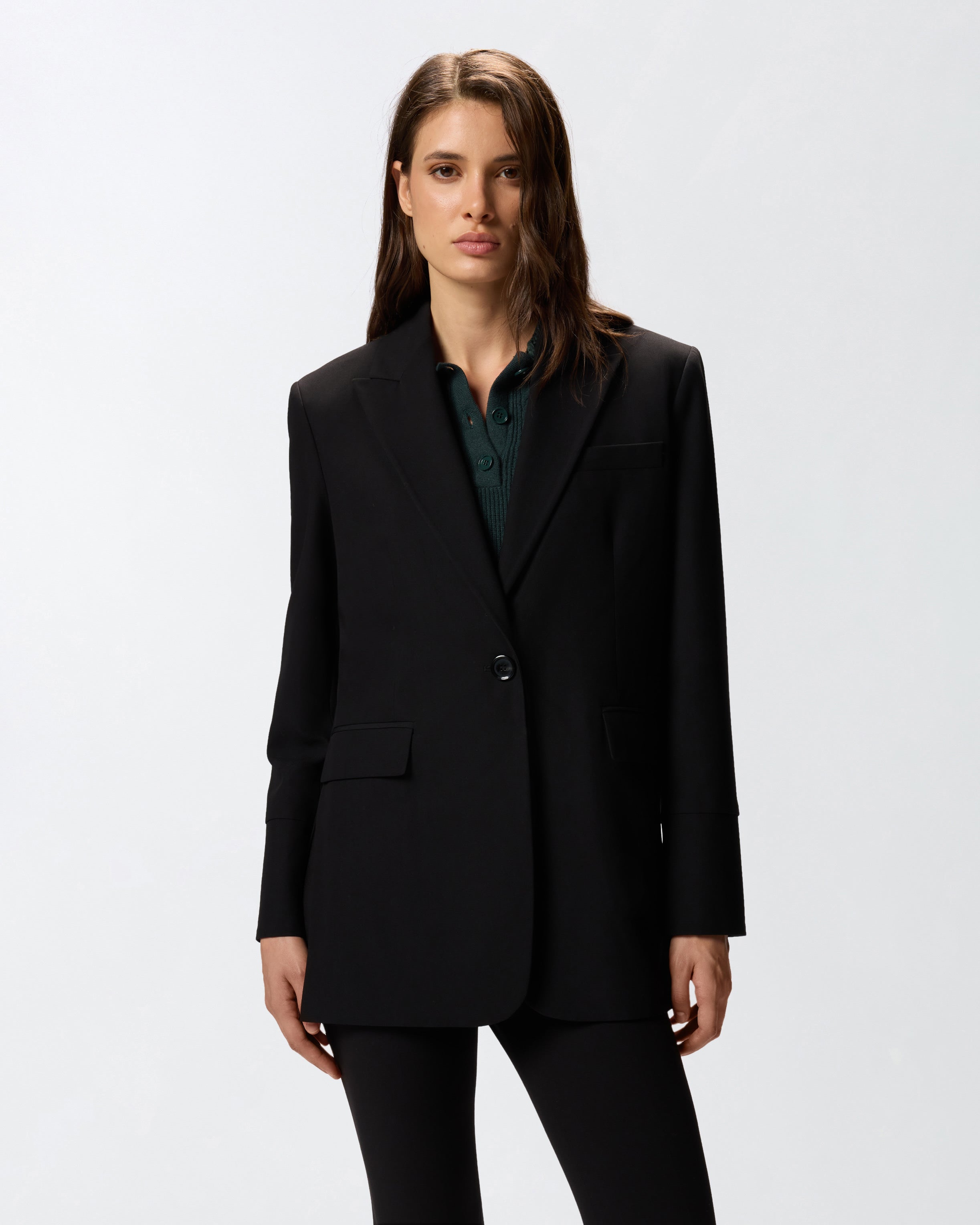 Oversized single-breasted blazer with a straight cut, a lapel collar, front flap pockets and a welt breast pocket. The garment is made from a stretch viscose fabric with a distinctly fluid feel. The inner fabric lining ensures maximum comfort when worn. Pair the jacket with the trousers in the same fabric for a refined suit to wear to ceremonies and special occasions.