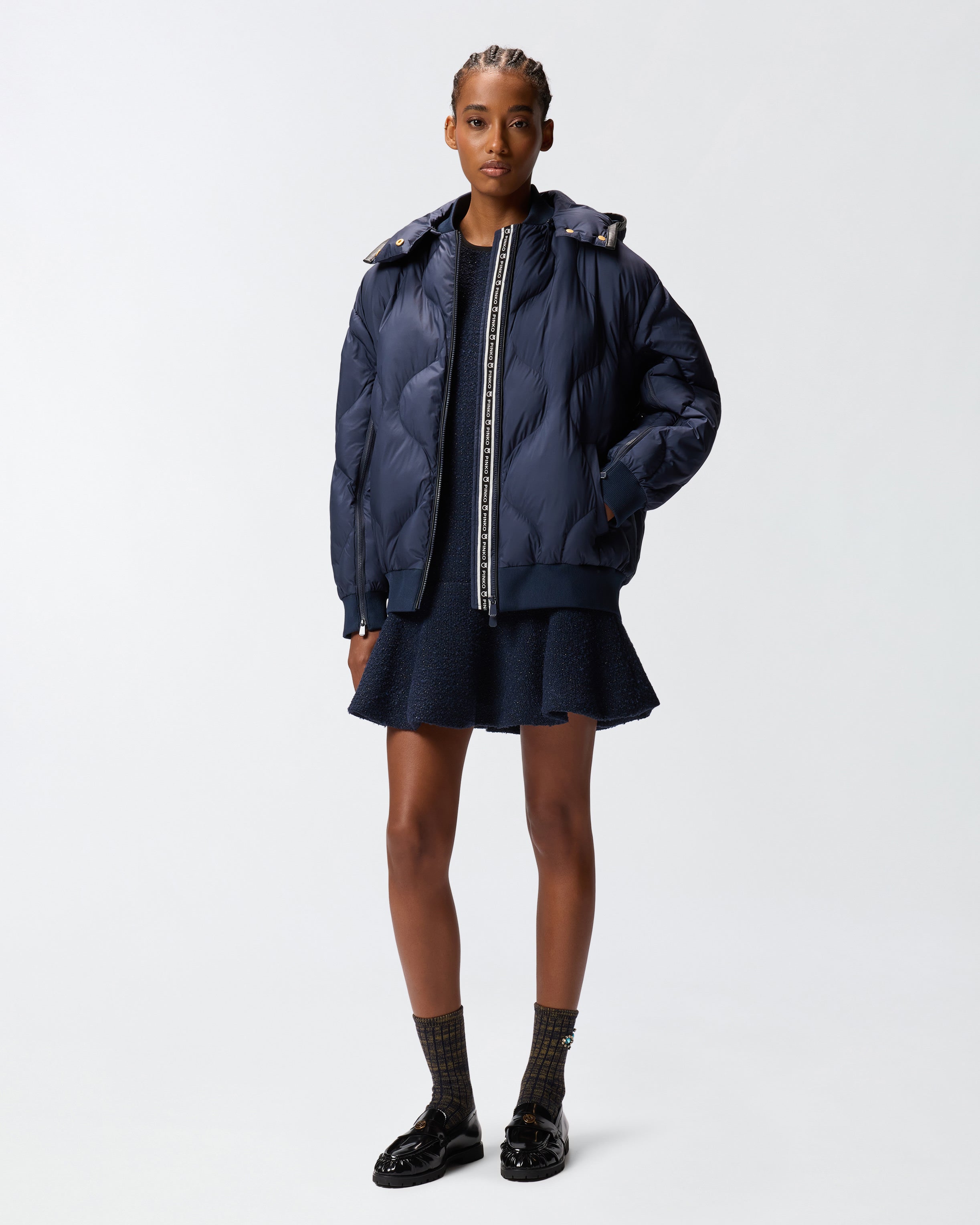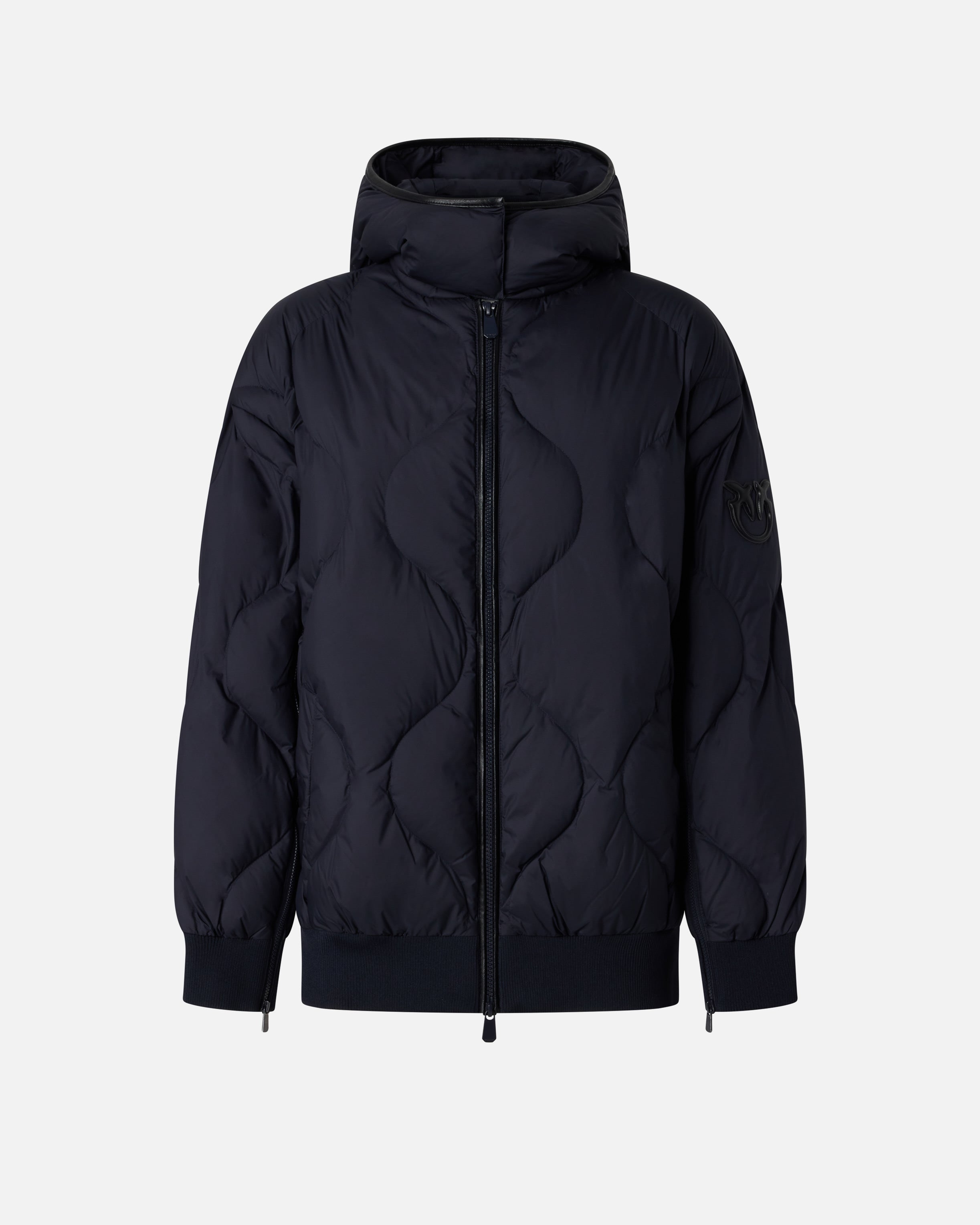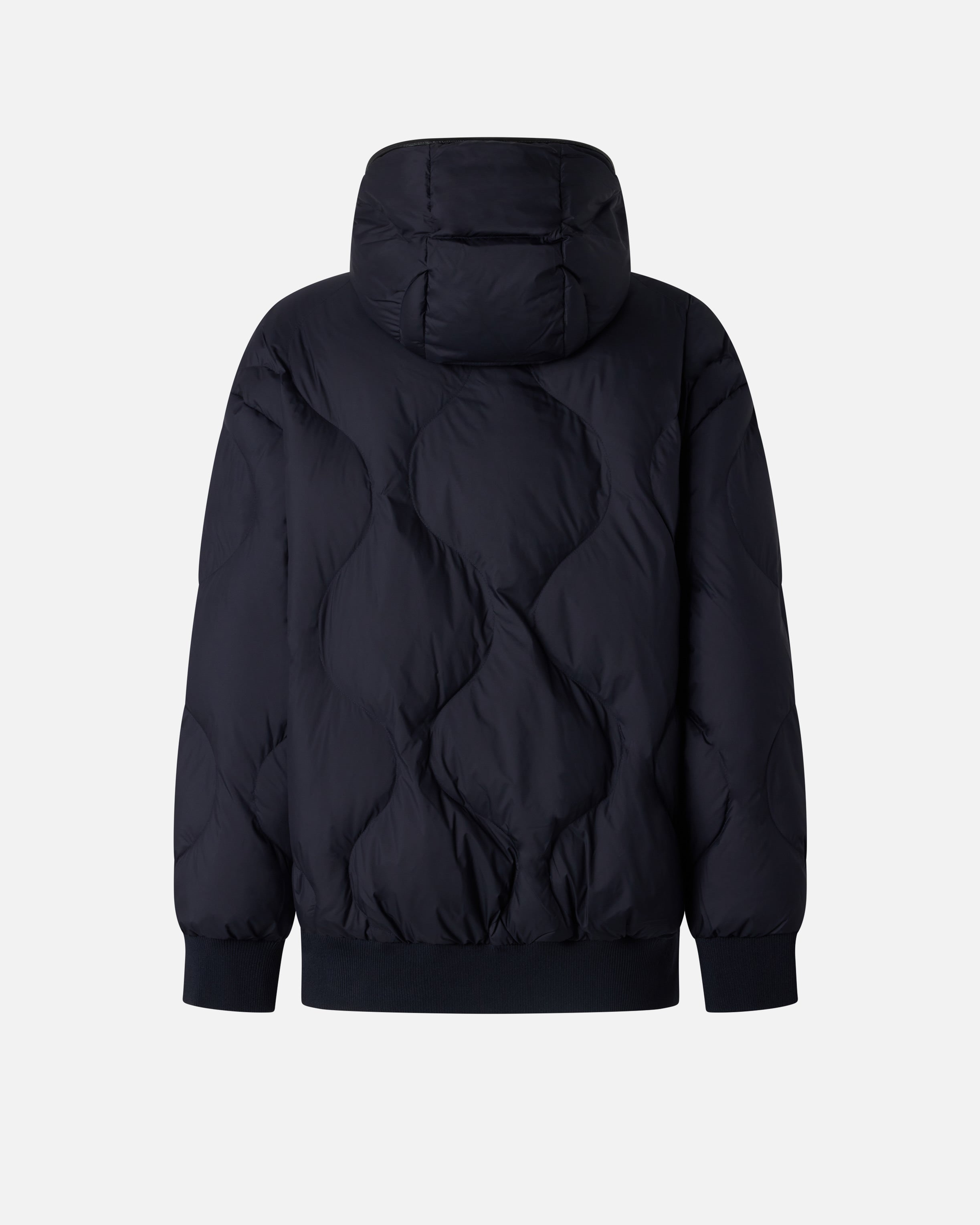 Padded bomber jacket with onion quilting made from comfortable and durable technical canvas and finished with a rib-knit collar, cuffs and hem. The design features a detachable zip-off hood and long sleeves that can be opened by zip to turn the garment into a cape. It is completed by coated-effect finishes on the edge of the hood and along the front fastening with two-way zip. The perfect piece to face the first cold spells with a touch of style that has not sacrificed comfort.