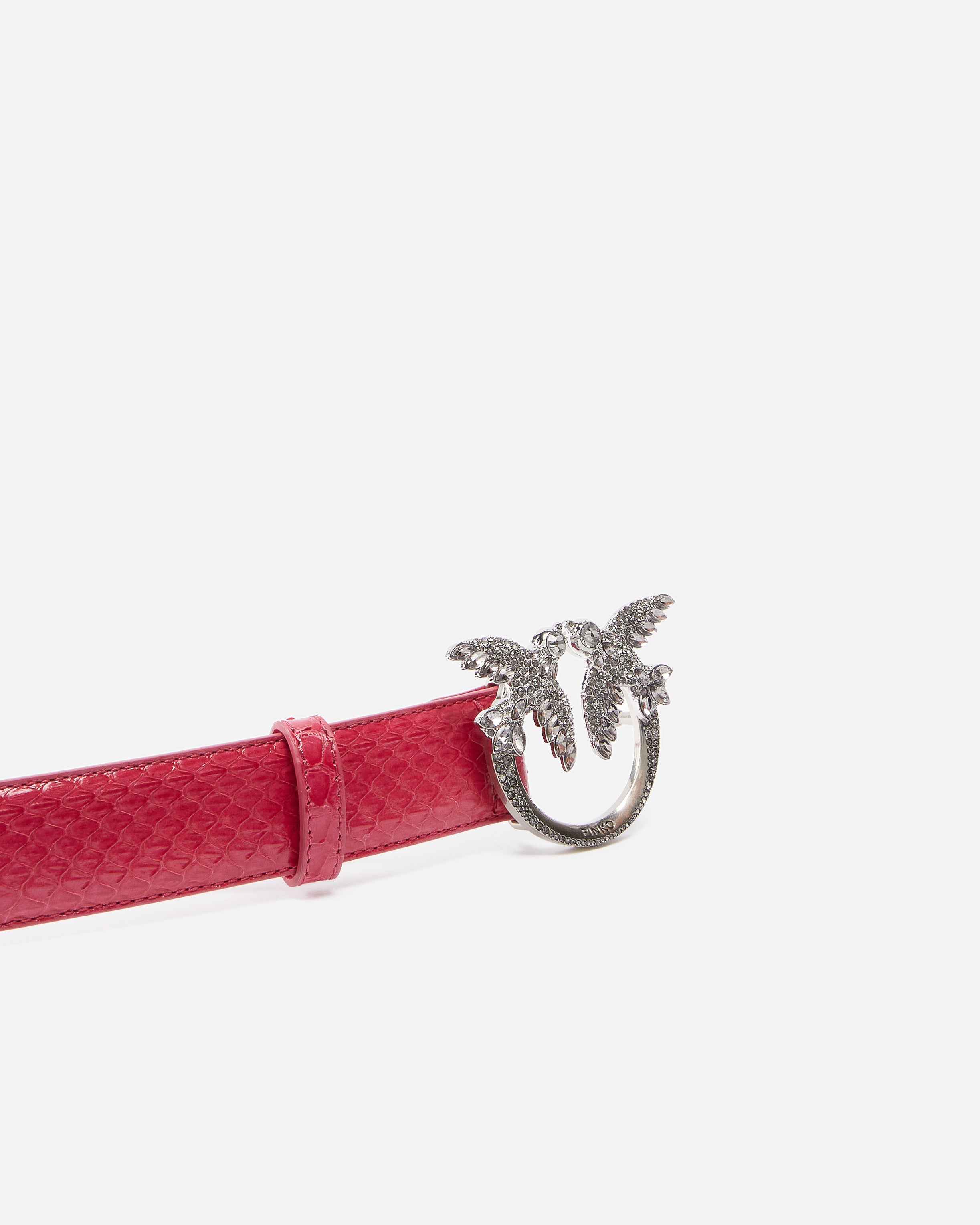 Women's 3-cm-wide belt crafted from fine ayers python skin with a special and refined glossy finish. The belt may display natural imperfections, which come from the leather itself and the hand-crafted application process: these characteristics are not to be considered a defect, but rather details that make every model distinctive and unique. The interior of the belt is crafted from smooth leather, while the fastening is embellished with a mini buckle with the metal Love Birds Diamond Cut logo, embellished with pavé crystals, to add a sparkling accent to your evening looks. The accessory is part of the Limited Edition special capsule collection which comprises PINKO Galleria-exclusive limited-edition models.
