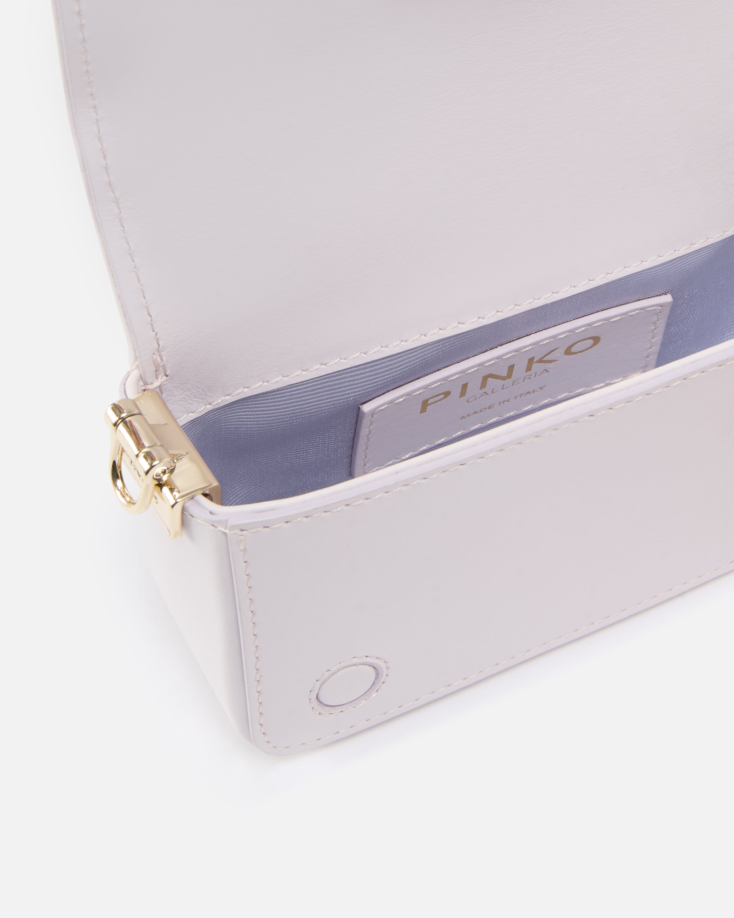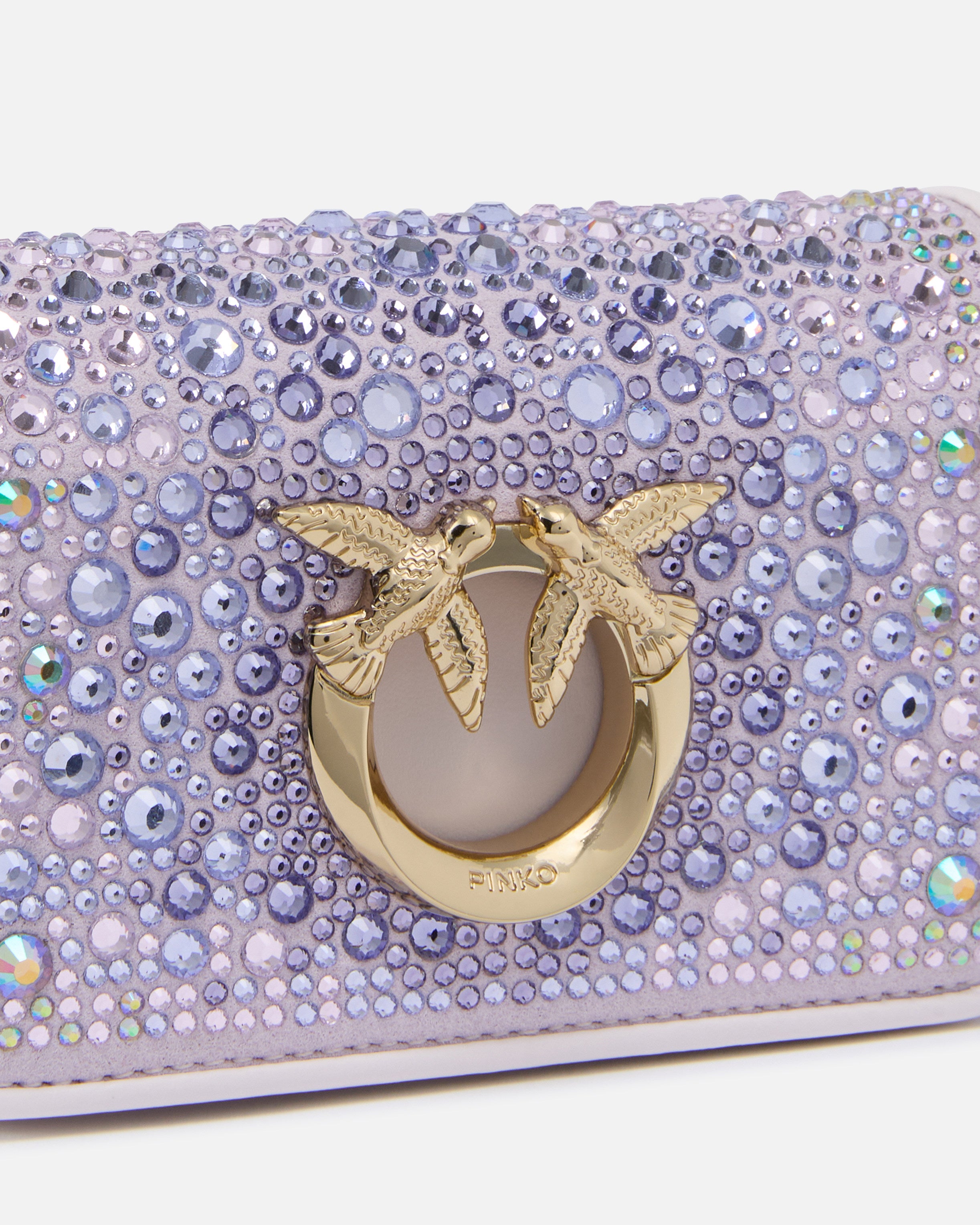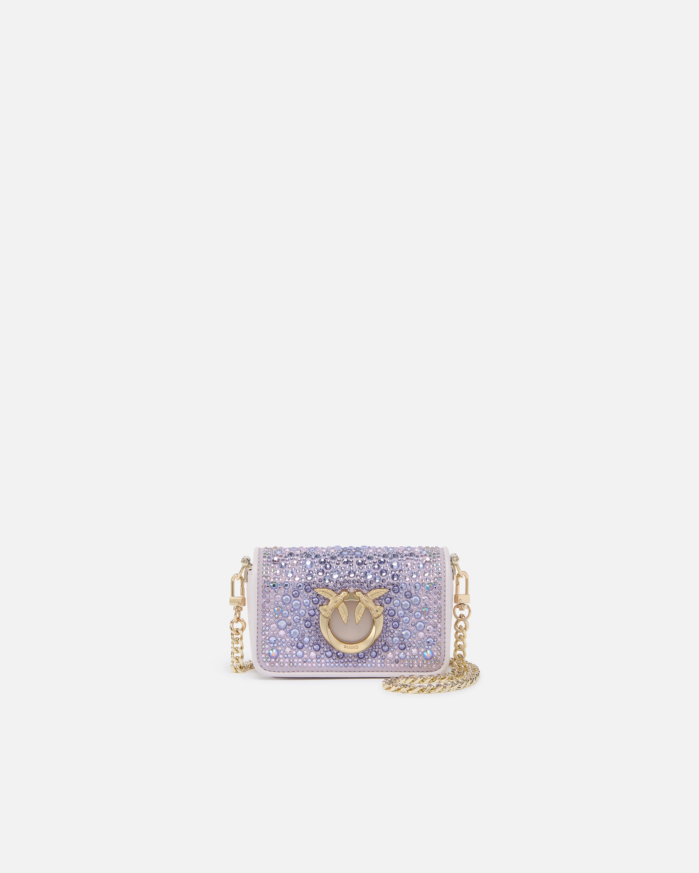 Micro Love Bag Click comprising imperfection-concealing brushed leather, in addition to suede which boasts a placed distinctive nuance, in line with the design created specifically by the PINKO team. All-over heat-transferred crystal appliqués: these comprise Europe-sourced round crystals with 8 ultra-bright facets, affixed in a secure and long-lasting way by means of the provided glue. The crystals - which come in four different sizes - are positioned, covered with a tissue and heat-pressed for several minutes. The concealed press-stud fastening is embellished by the iconic metal Love Birds Diamond Cut buckle with cut-out effect. The shoulder strap combines the classic round-link chain with a practical, adjustable leather pad. The bag is part of the Limited Edition special capsule collection which comprises PINKO Galleria-exclusive limited-edition models. Use the special NFC chip to enjoy a special experience, specific to the bag you have just bagged!