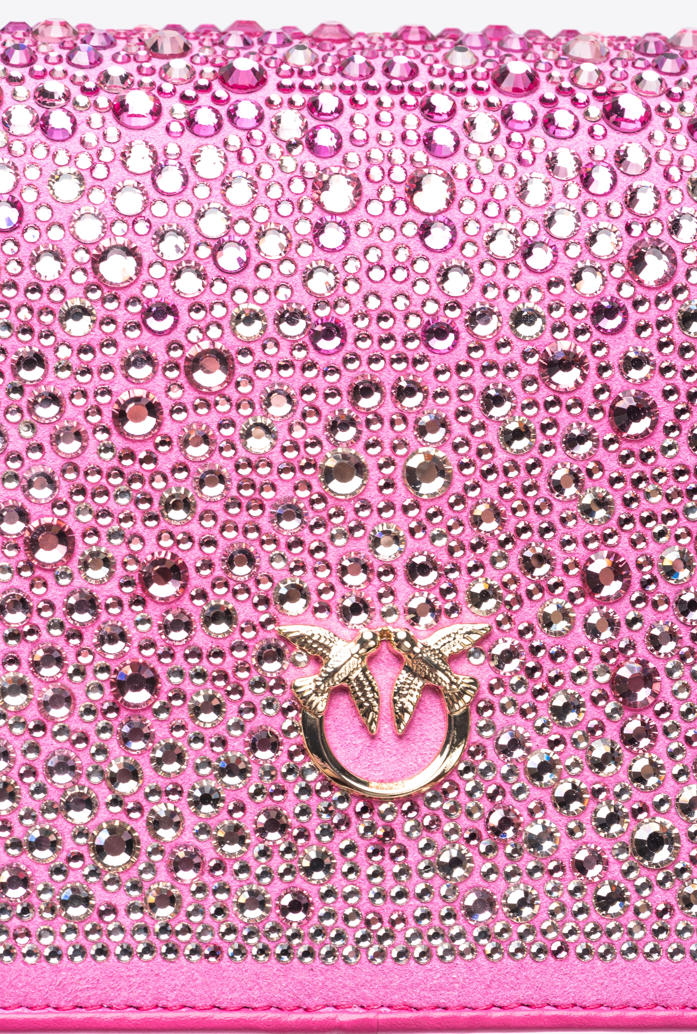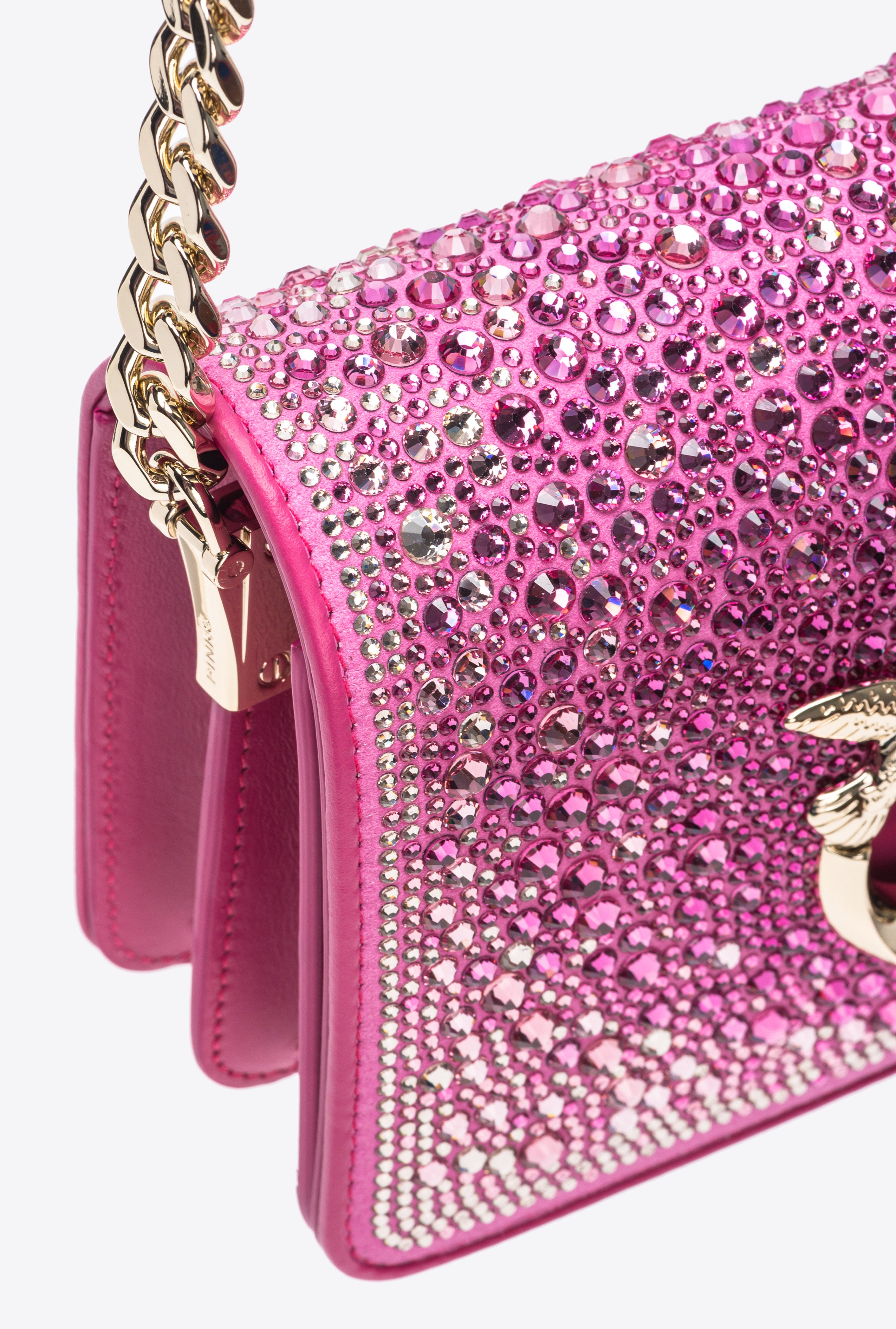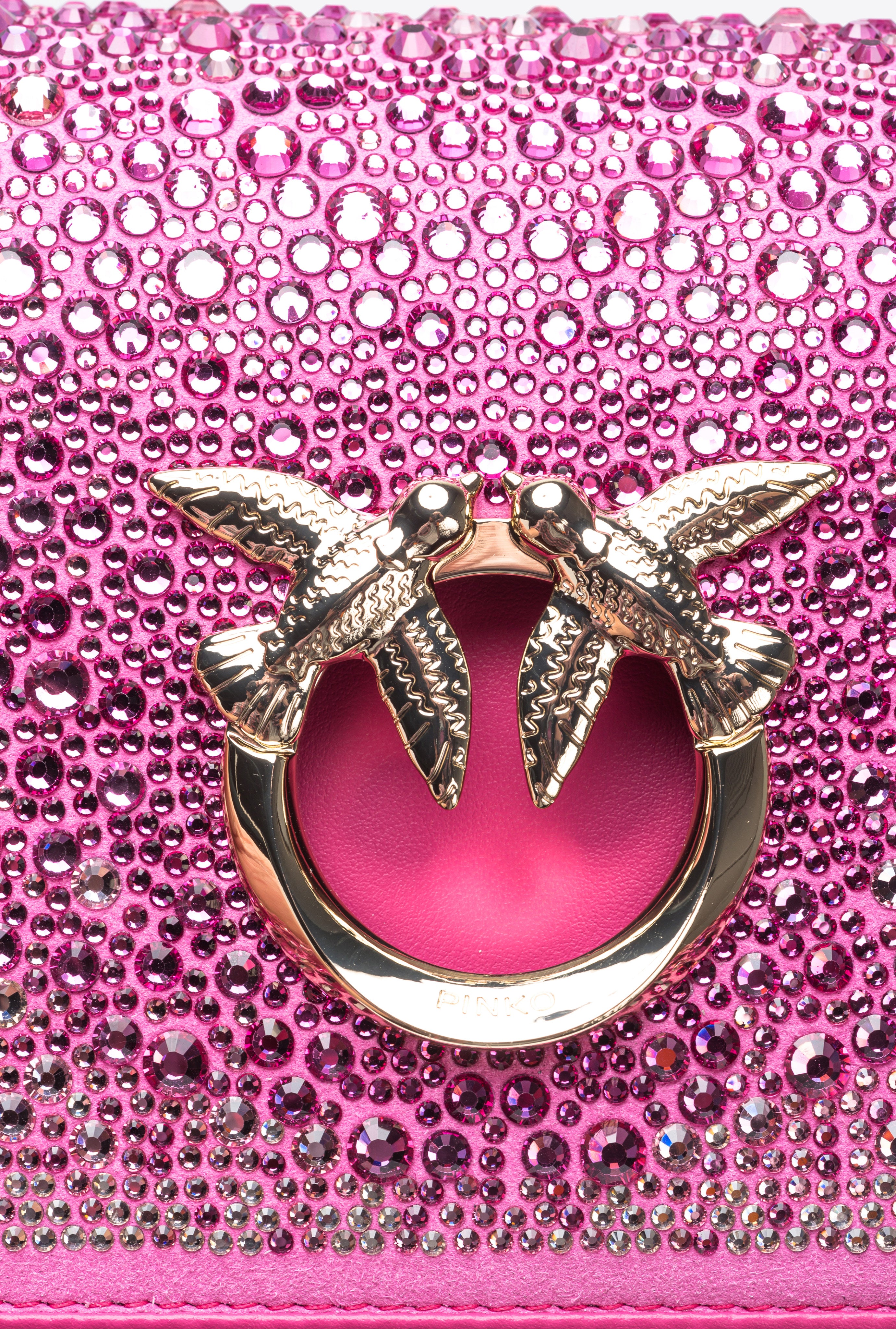 Mini Love Bag Click comprising imperfection-concealing brushed leather, in addition to suede which boasts a placed distinctive nuance, in line with the design created specifically by the PINKO team. All-over heat-transferred crystal appliqués: these comprise Europe-sourced round crystals with 8 ultra-bright facets, affixed in a secure and long-lasting way by means of the provided glue. The crystals - which come in four different sizes - are positioned, covered with a tissue and heat-pressed for several minutes. The concealed press-stud fastening is embellished by the iconic metal Love Birds Diamond Cut buckle with cut-out effect. The shoulder strap combines the classic round-link chain with practical leather shoulder padding. The bag is part of the Limited Edition special capsule collection which comprises PINKO Galleria-exclusive limited-edition models. Use the special NFC chip to enjoy a special experience, specific to the bag you have just bagged!