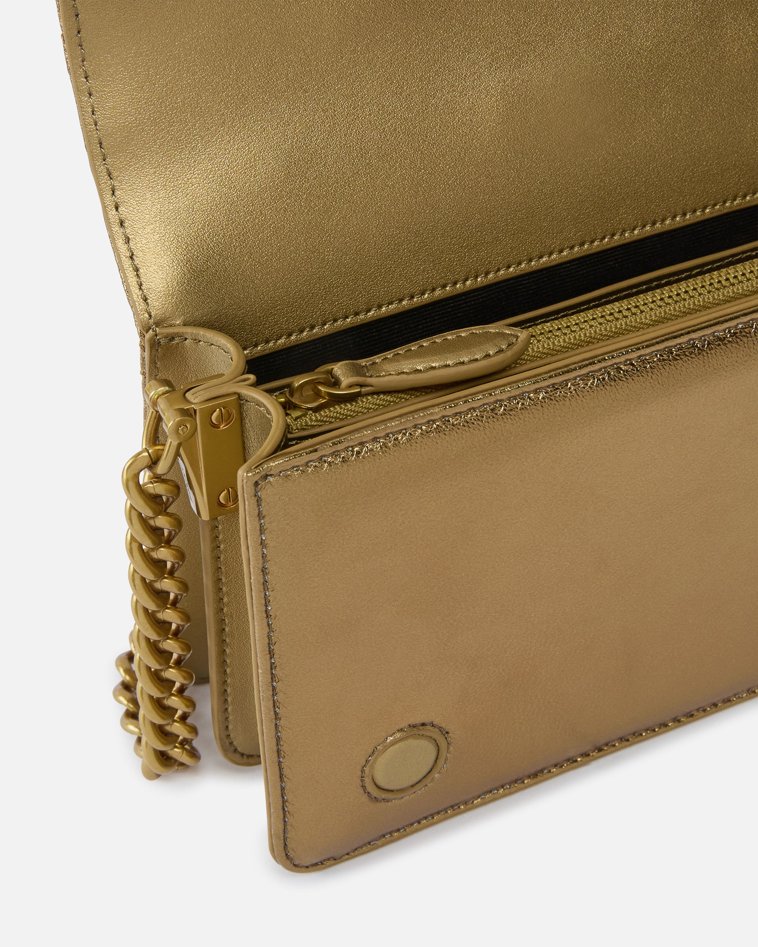 Mini Love Bag Click crossbody bag in metallic nappa leather with a gold finish and diamond quilting dotted with small Love Birds Diamond Cut logo tags featuring sparkling rhinestones, which pair with the branded buckle that finishes off the fastening. The contrasting fabric-lined interior includes a practical zipped centre divider pocket for better organisation of the space. The mini bag is complete with an attached shoulder strap that combines the classic golden metal chain with a practical leather shoulder pad for greater comfort when carried. The bag is part of the Limited Edition special capsule collection which comprises PINKO Galleria-exclusive limited-edition models. Use the special NFC chip to enjoy a special experience, specific to the bag you have just bagged!