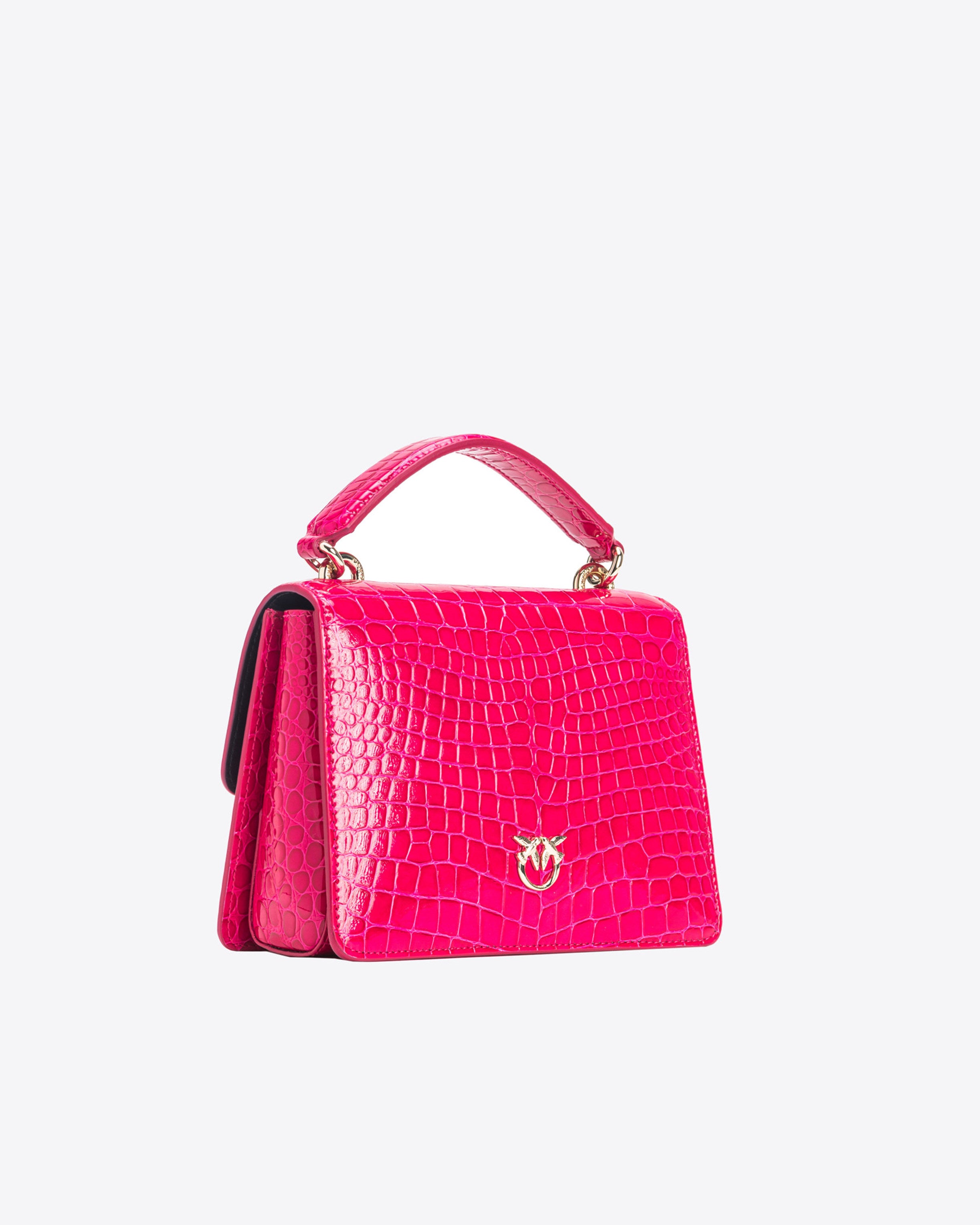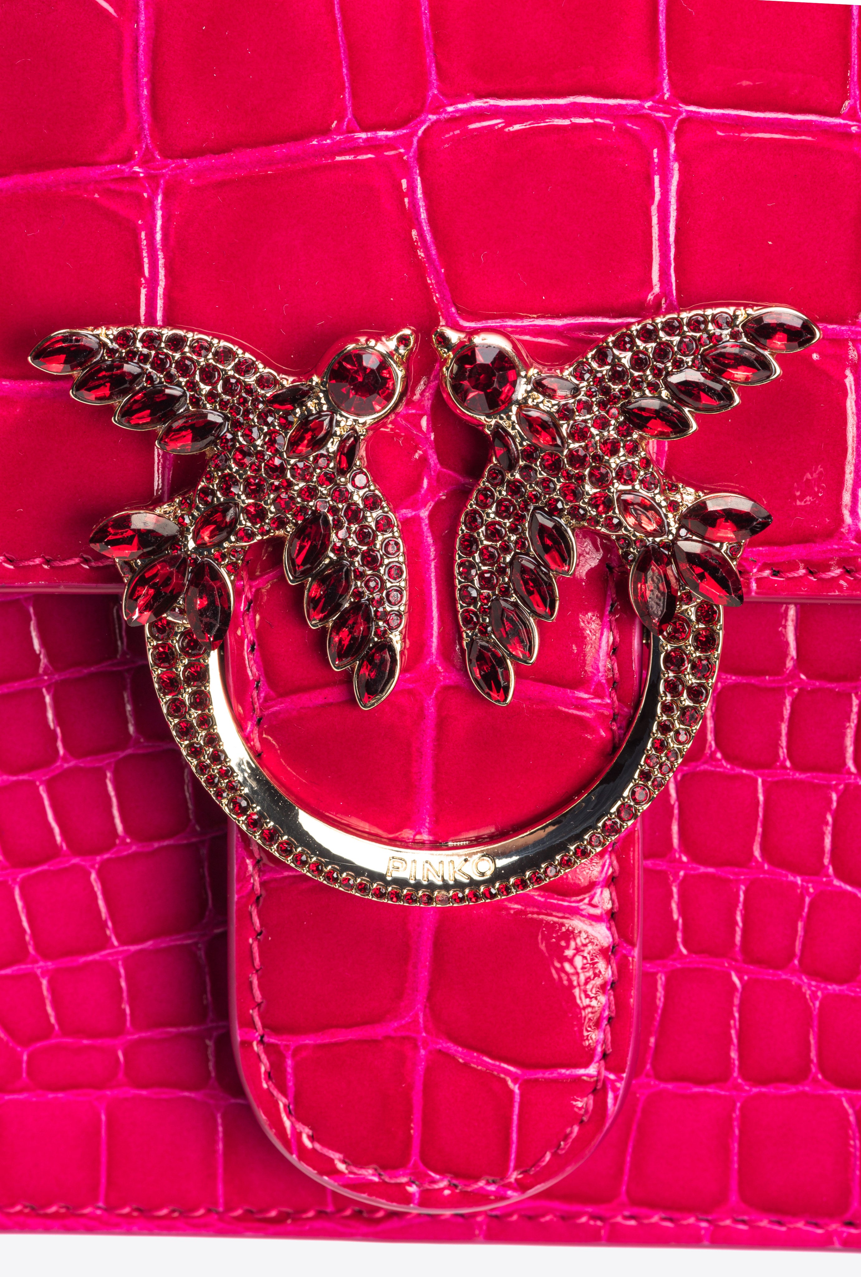 Mini Love Bag One Top Handle Light with light, deconstructed design, made from coloured crocodile-print leather with a strikingly shiny finish. The fastening is complete with the iconic light gold-electroplated metal Love Birds Diamond Cut buckle embellished with matching-colour pavé-set stones. Inside, it has fabric lining and a zipped slip pocket. Single top handle and small clasp-detachable shoulder strap with chain and adjustable leather pad. The bag is part of the Limited Edition special capsule collection which comprises PINKO Galleria-exclusive limited-edition models. Use the special NFC chip to enjoy a special experience, specific to the bag you have just bagged!