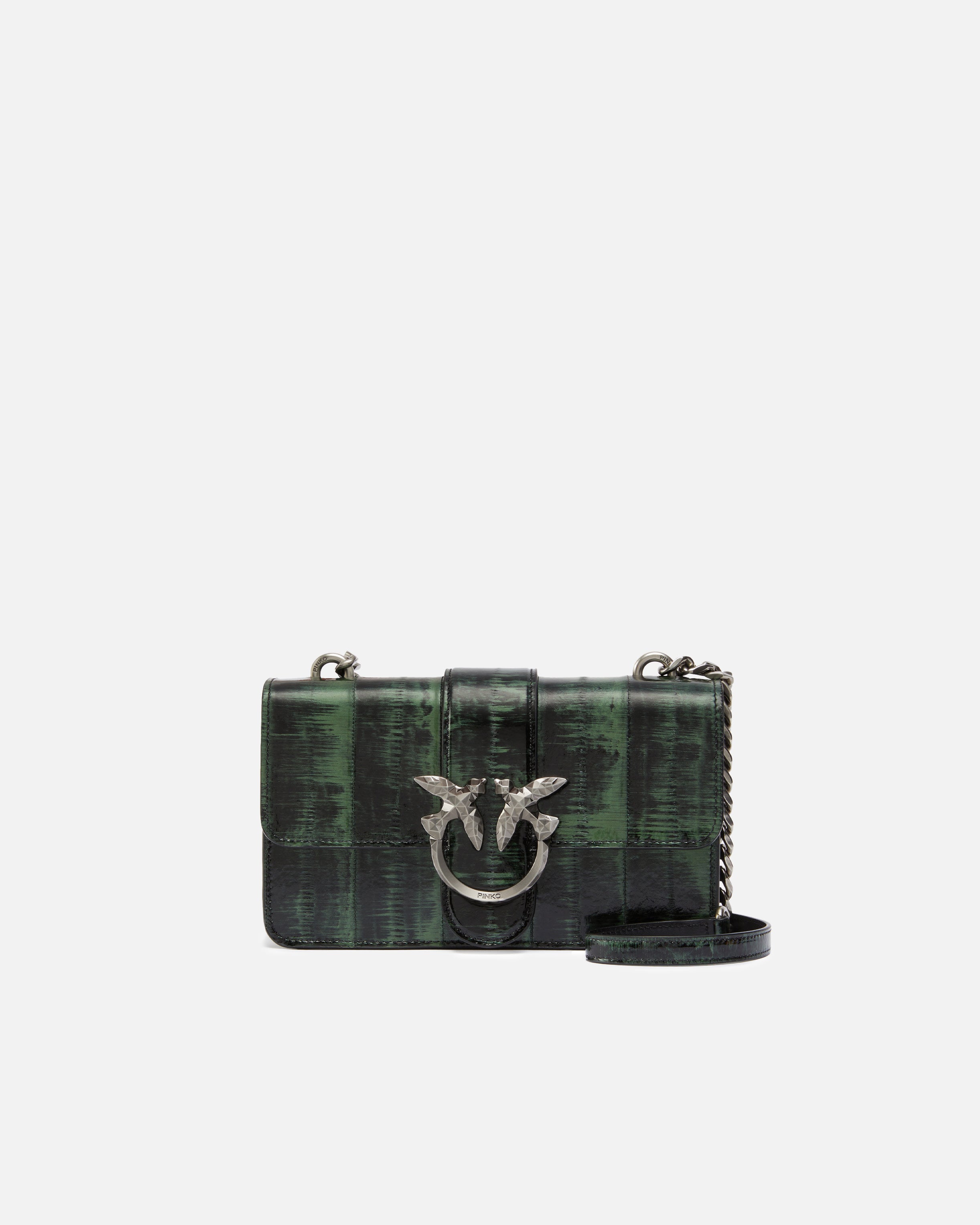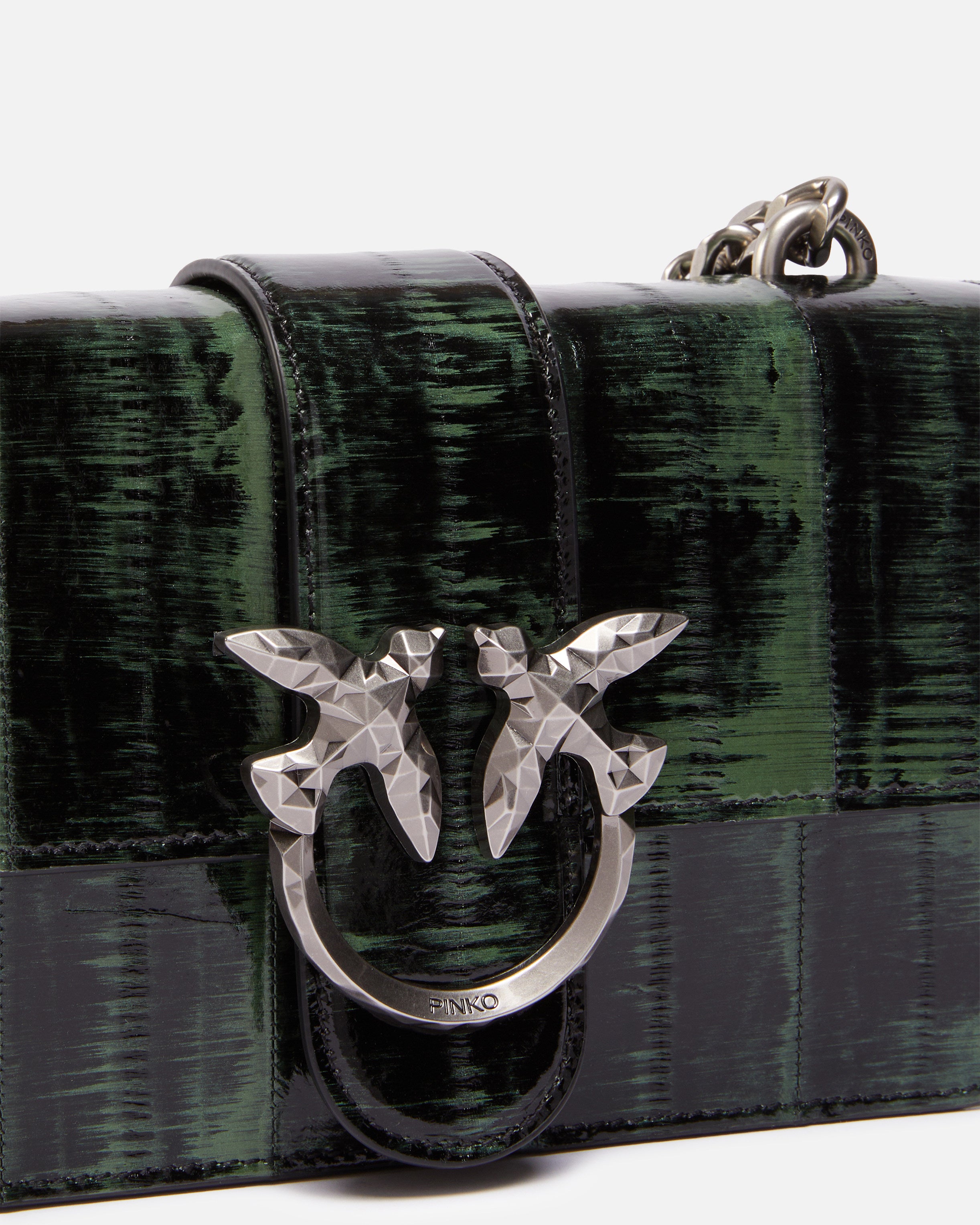 Mini Love Bag crossbody bag crafted from eel skin with a strikingly subtle yet durable and exquisite texture and finished with an ombre effect. The skins, which are small in size, are sewn together to create larger pieces that the desired panels are then cut from. Any marks, scarring and colour differences between the pieces of leather should be considered features that make each bag unique. The fastening of the bag is complemented by the strap and iconic metal buckle embellishment with the Love Birds Diamond Cut logo with an engraved faceted effect. The shoulder strap paired with the bag combines the classic round-link chain with a practical, adjustable leather pad for more comfortable on-the-shoulder wear. The bag is part of the Limited Edition special capsule collection which comprises PINKO Galleria-exclusive limited-edition models. Use the special NFC chip to enjoy a special experience, specific to the bag you have just bagged!