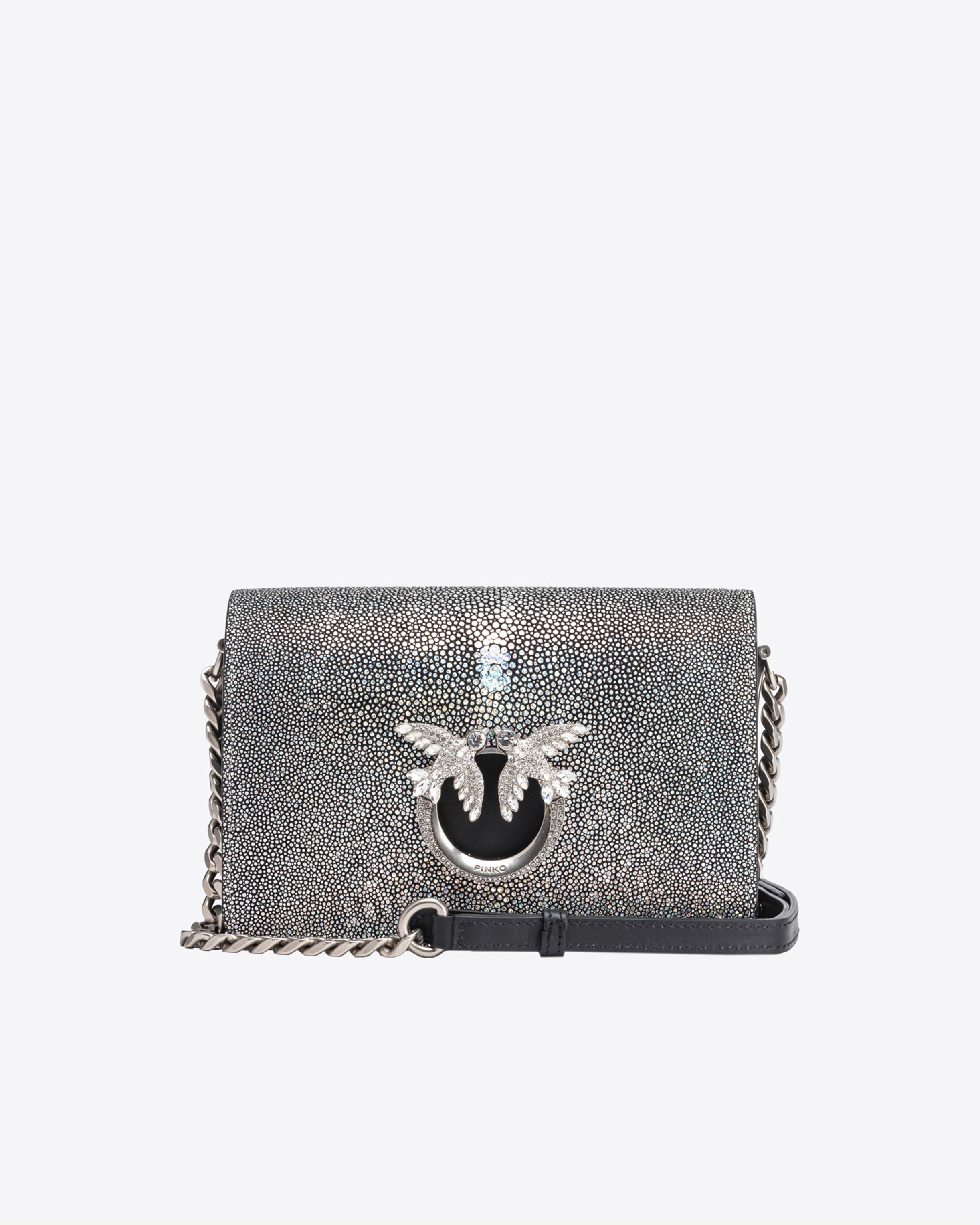Mini Love Bag Click in buffed stingray leather, which is slightly coarse to the touch and very shiny. The concealed press-stud fastening is accompanied by the iconic Love Birds Diamond Cut metal buckle, complete with a cut-out effect and pavé rhinestone detail. Inside, it features contrasting lining, a slip pocket and a zipped divider pocket. The shoulder strap combines the classic round-link chain with a practical, adjustable leather pad. The bag is part of the Limited Edition special capsule collection which comprises PINKO Galleria-exclusive limited-edition models. Use the special NFC chip to enjoy a special experience, specific to the bag you have just bagged!