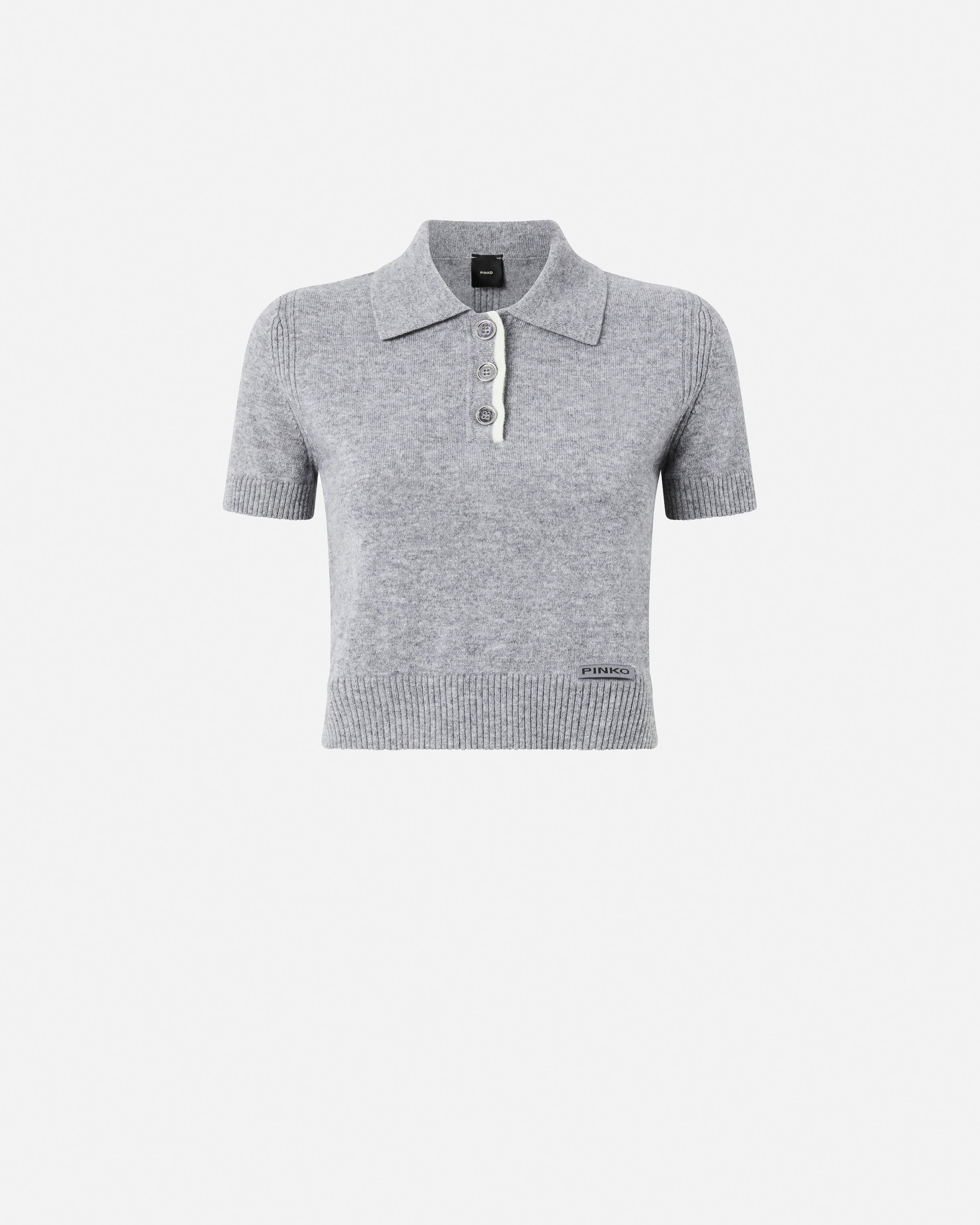 Short slim-fit polo-style sweater in soft merino wool and cashmere-blend yarn. The style is completed by the ribbed sleeve trims and hem, and the tone-on-tone label with the PINKO lettering logo on the left side of the chest. The contrasting yarn elegantly highlights the three-button placket. The piece has undergone finishing tests to minimise the possible formation of pilling, ensuring greater fabric softness and durability. The quality fabric and versatile design will create endless looks.