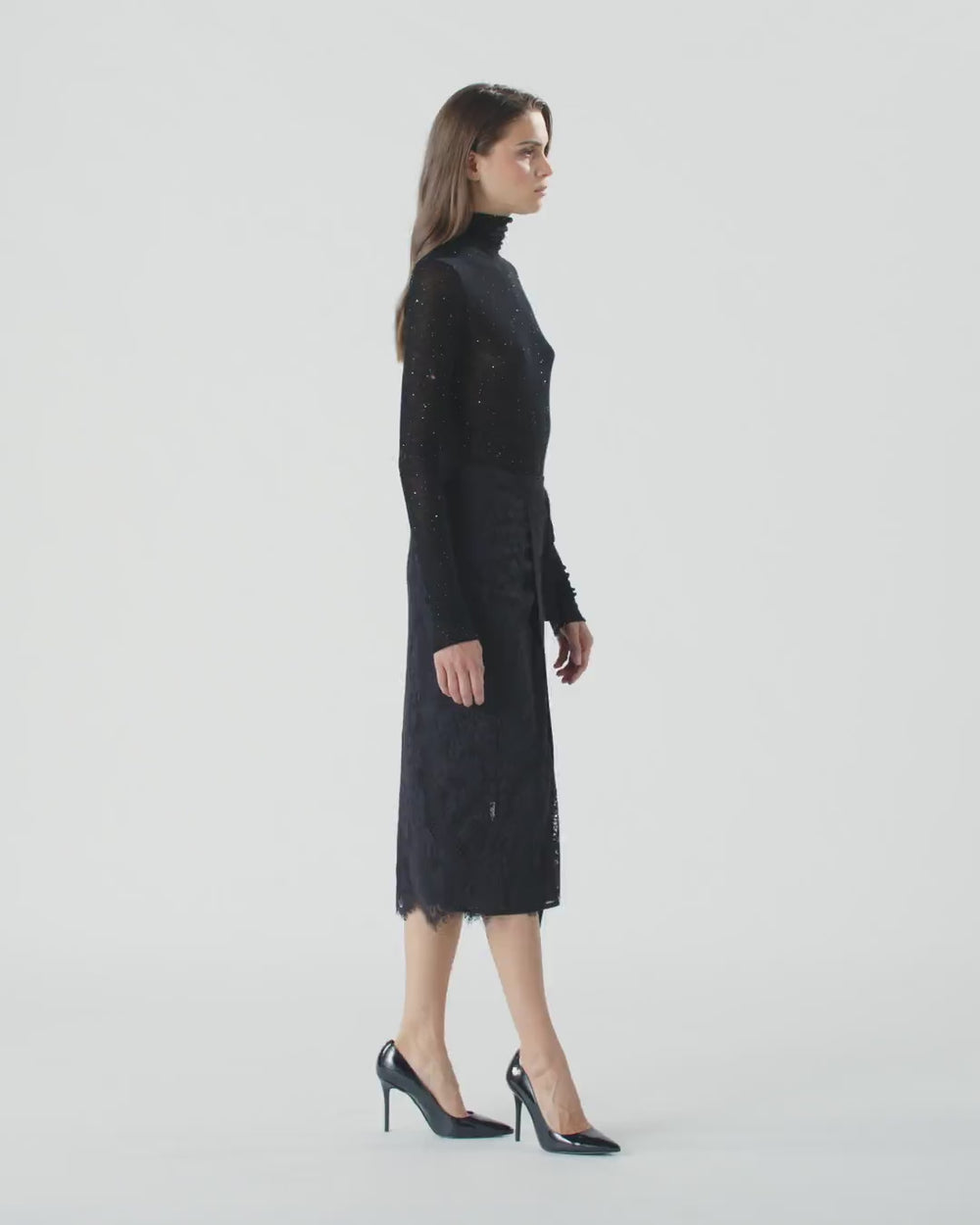 Pencil skirt with a wrap design completed by a ribbon that ties into a bow on the side. This piece is made from refined rebrodé lace that gently descends beyond the hem, and is finished with a belt and plain fabric trims. Lined model. Pair this pencil skirt with the lace bodysuit in the same colour for a bold, feminine head-to-toe look.