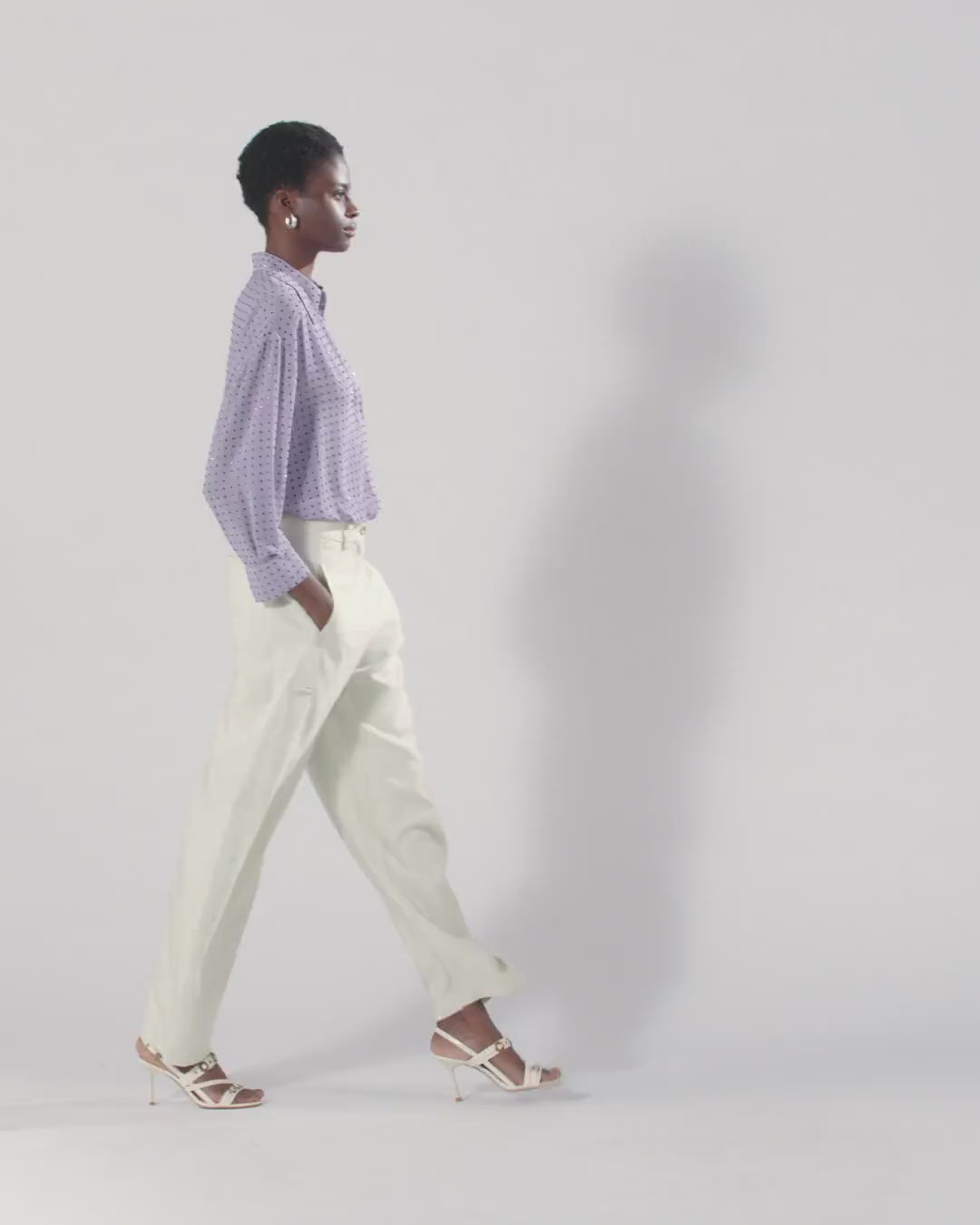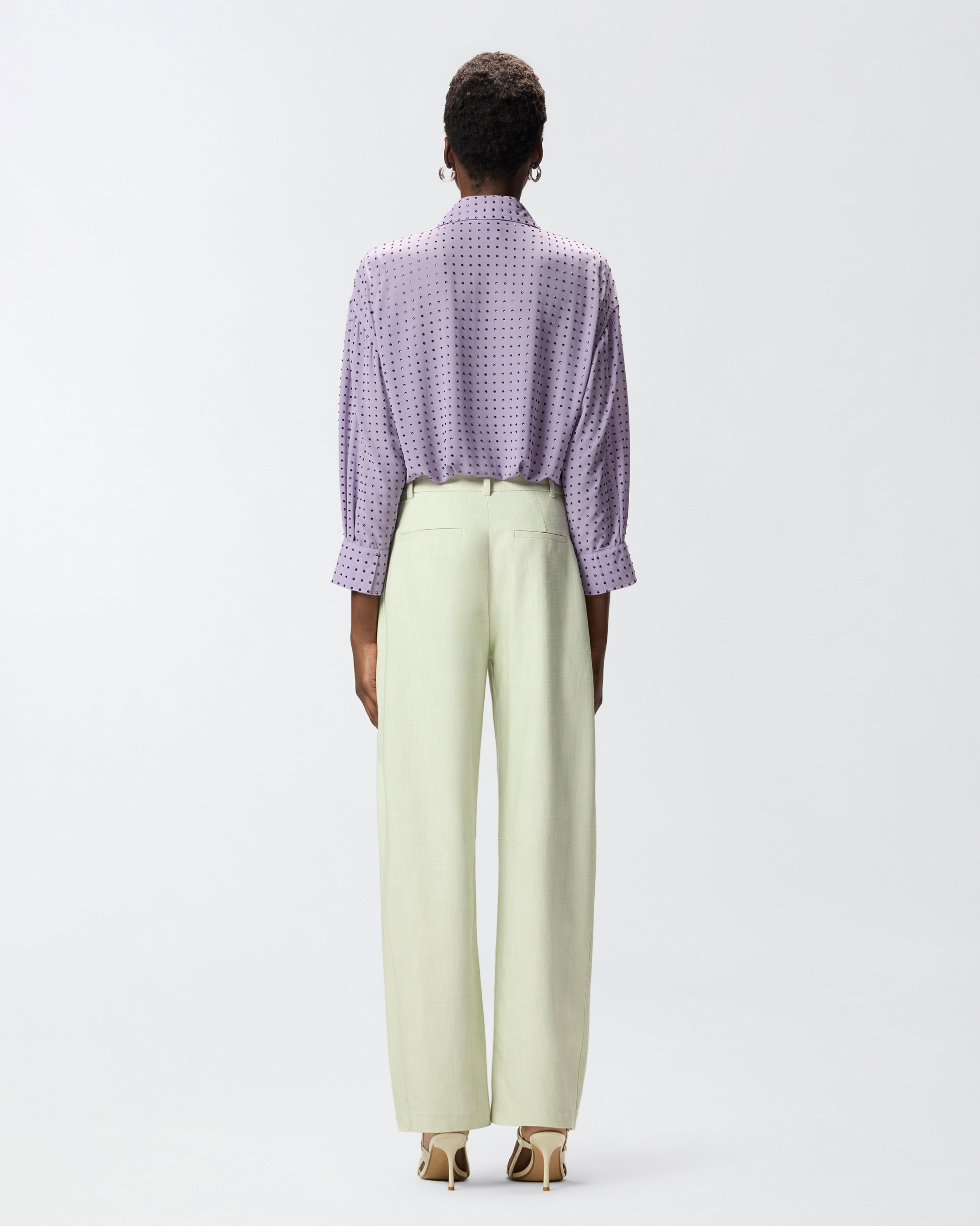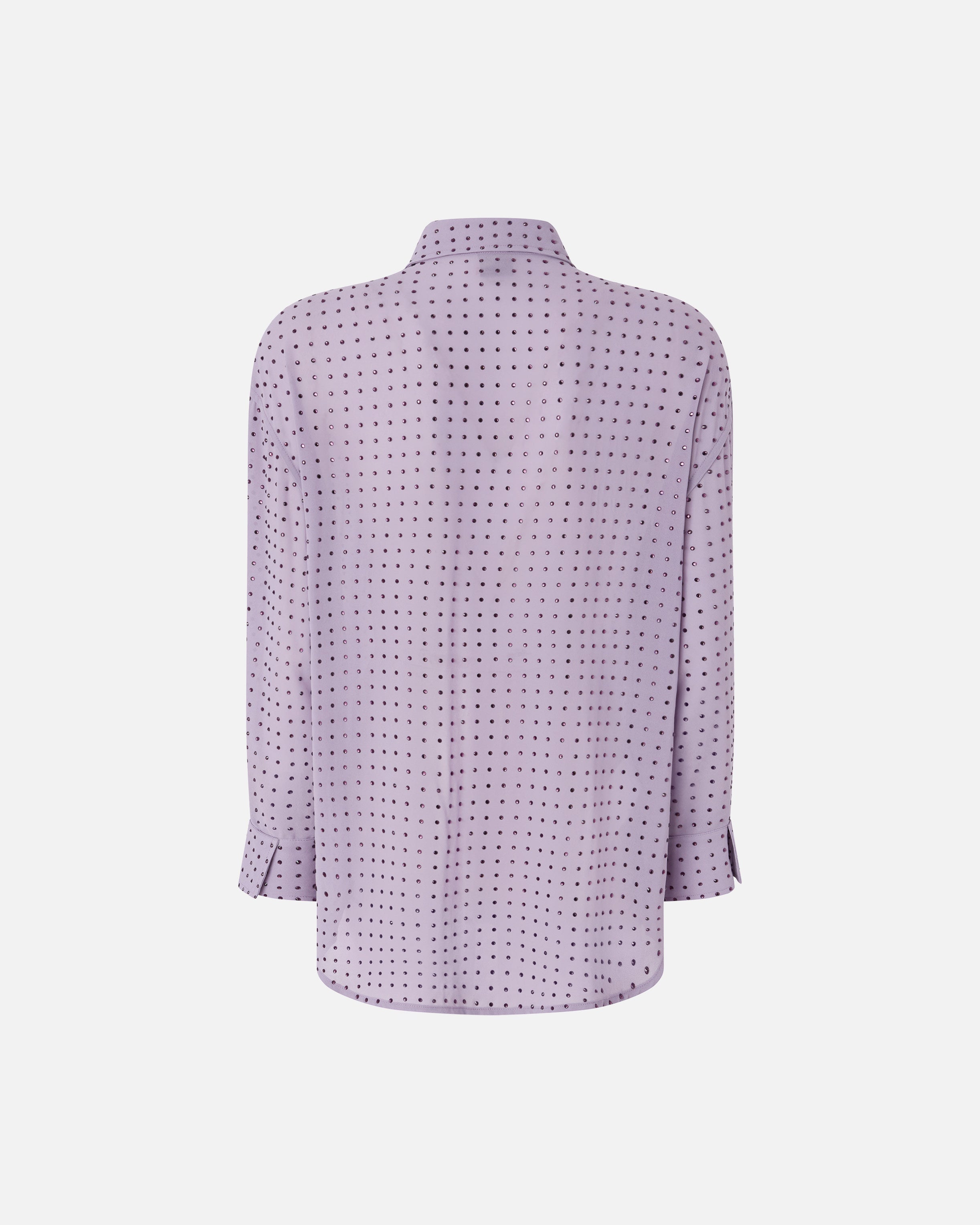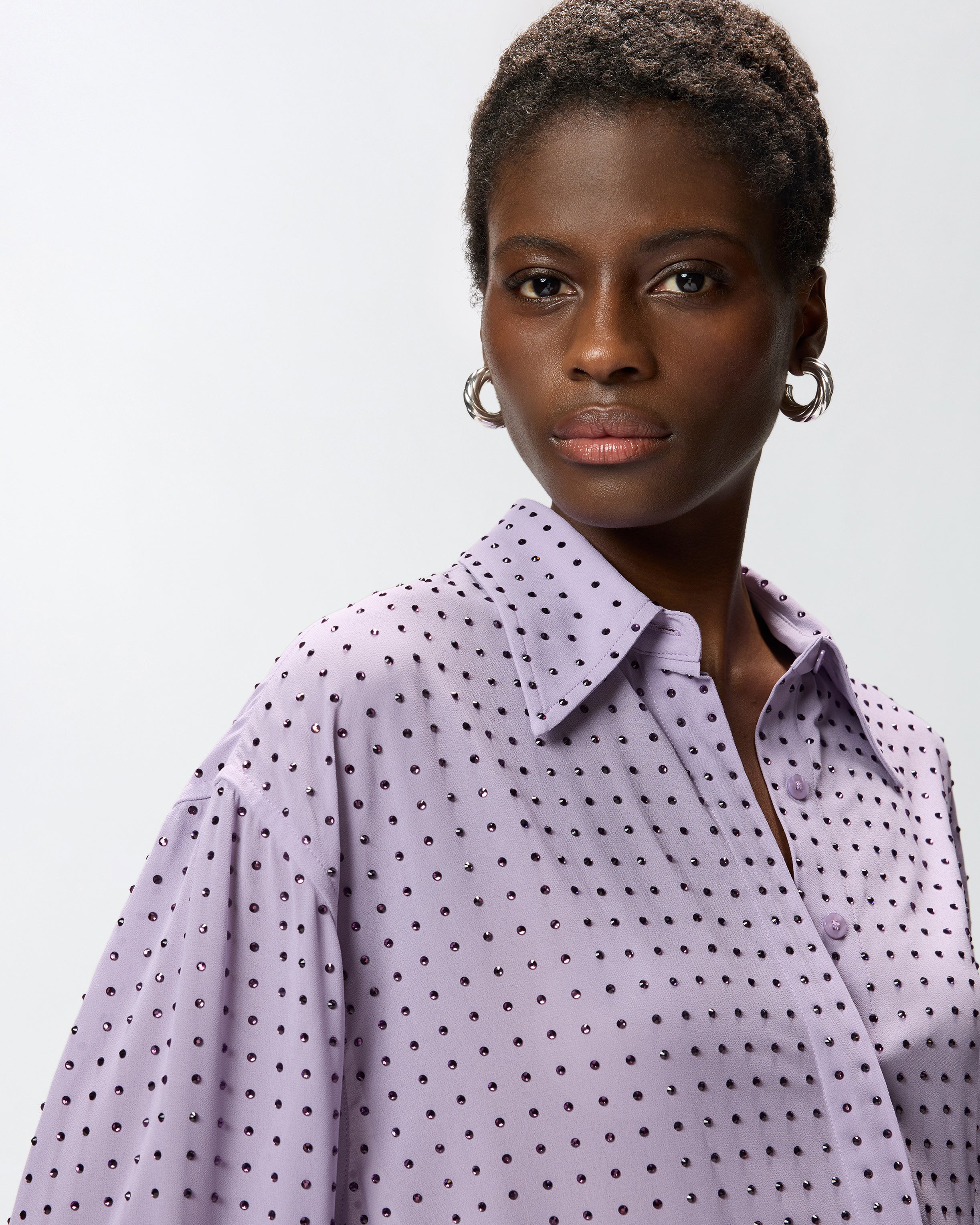Straight-cut shirt with a slightly more voluminous upper, featuring a classic collar and long sleeves with dropped shoulders and cuffs. Made from georgette fabric with a refined matte finish, which delicately caresses the body and delivers a light, fluid silhouette, this model is embellished with shiny rhinestones dotted all over in a way that encapsulates PINKO's DNA as a brand. The shirt is complete with a concealed front fastening with only the top button visible, to offer a touch of discreet functionality without interrupting the continuity of the decoration. - OLIVA SHIRT