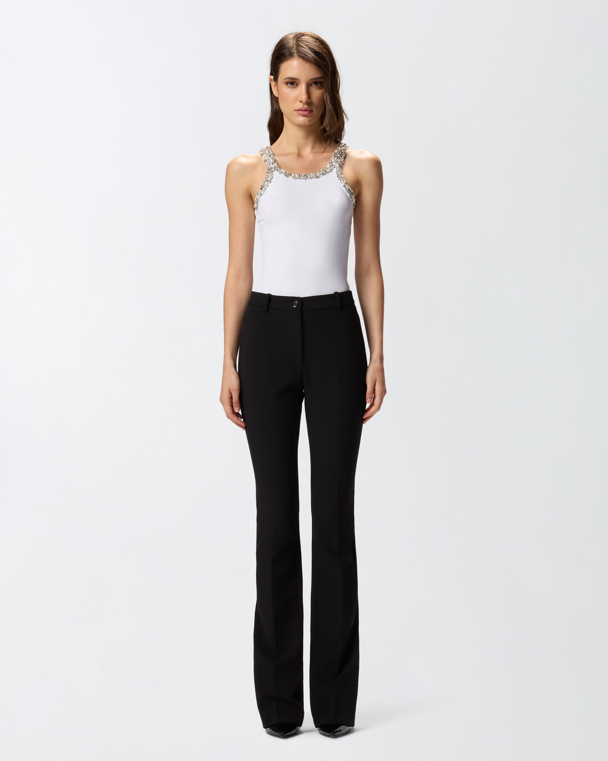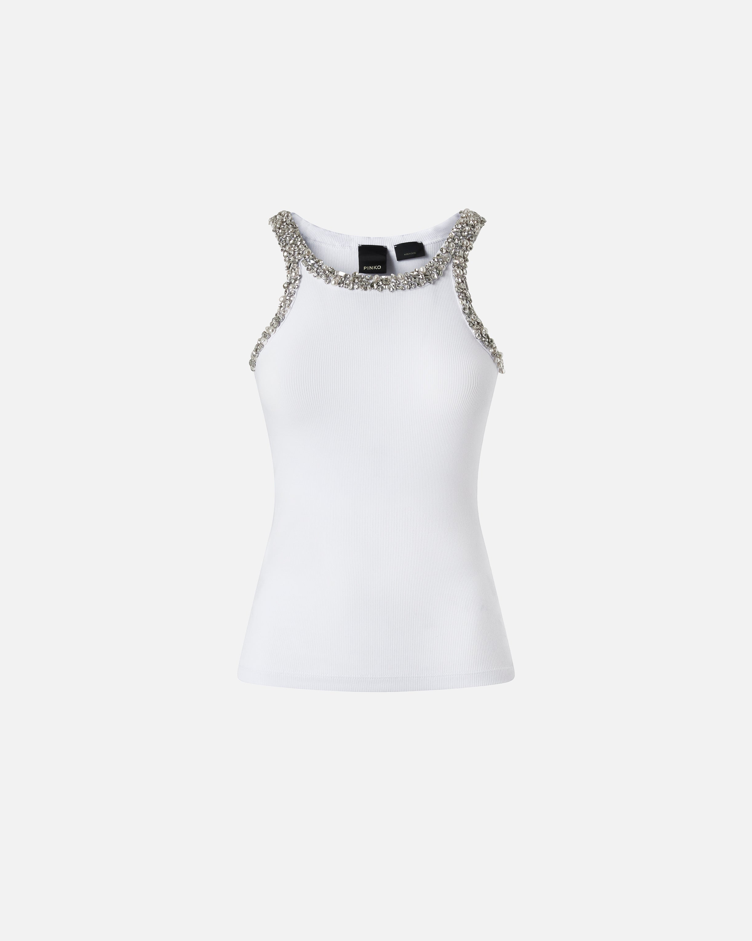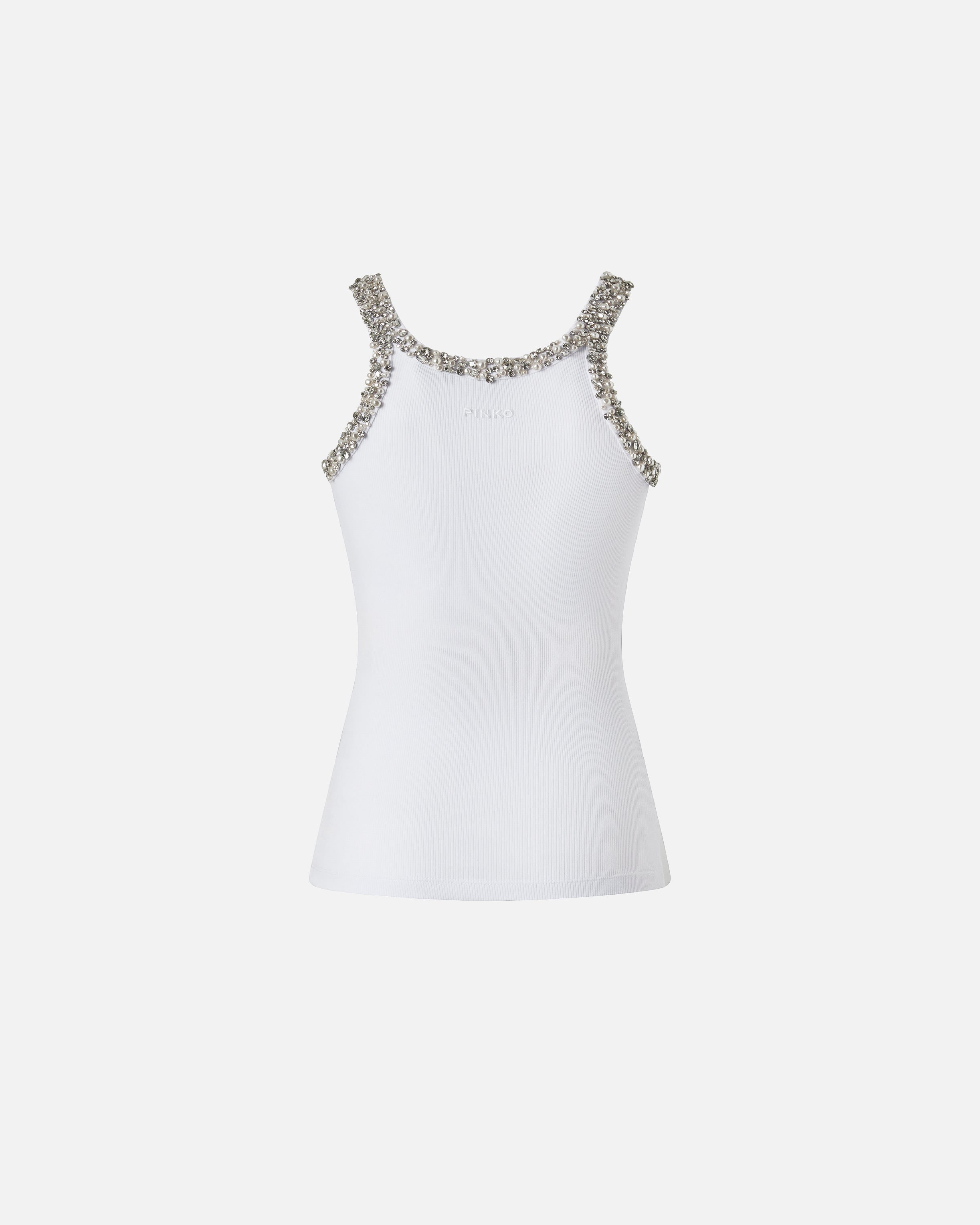 Vest top in ribbed cotton jersey. The front and back necklines and straps are covered with expertly embroidered crystals, rhinestones and glass details that add shimmer and exquisiteness to the garment. Make any outfit extra elegant and feminine with this top, which is perfect to wear under a jacket, paired with either tailored trousers or even a pair of special jeans.