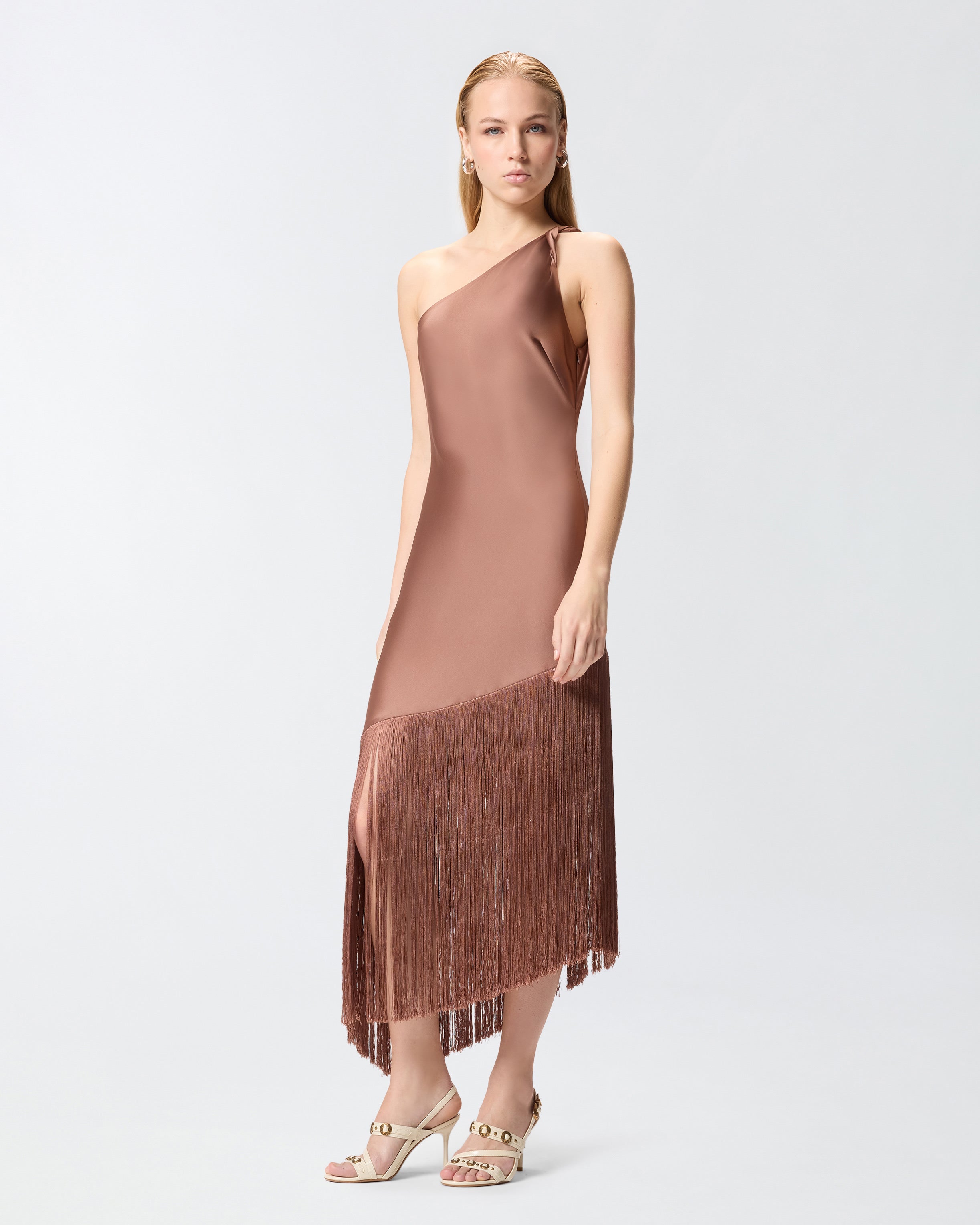 Mini dress with asymmetric hem and flowing silhouette, made from shiny, silky satin. This garment boasts a sleeveless one-shoulder design with draped strap, and is enhanced by long, thick fringes at the bottom that sway with every step. Thanks to the smooth, elegant feel of the fabric and the glamorous, theatrical character of the embellishment, this dress will make you the undisputed queen at exclusive parties and special occasions. This item is complete with an invisible side zip to help put it on.