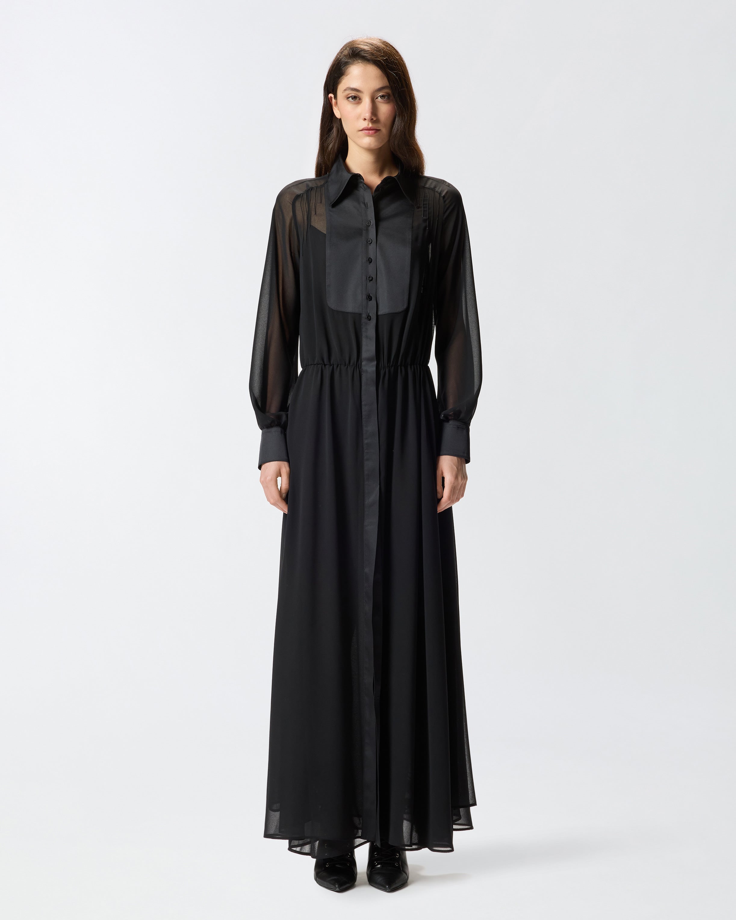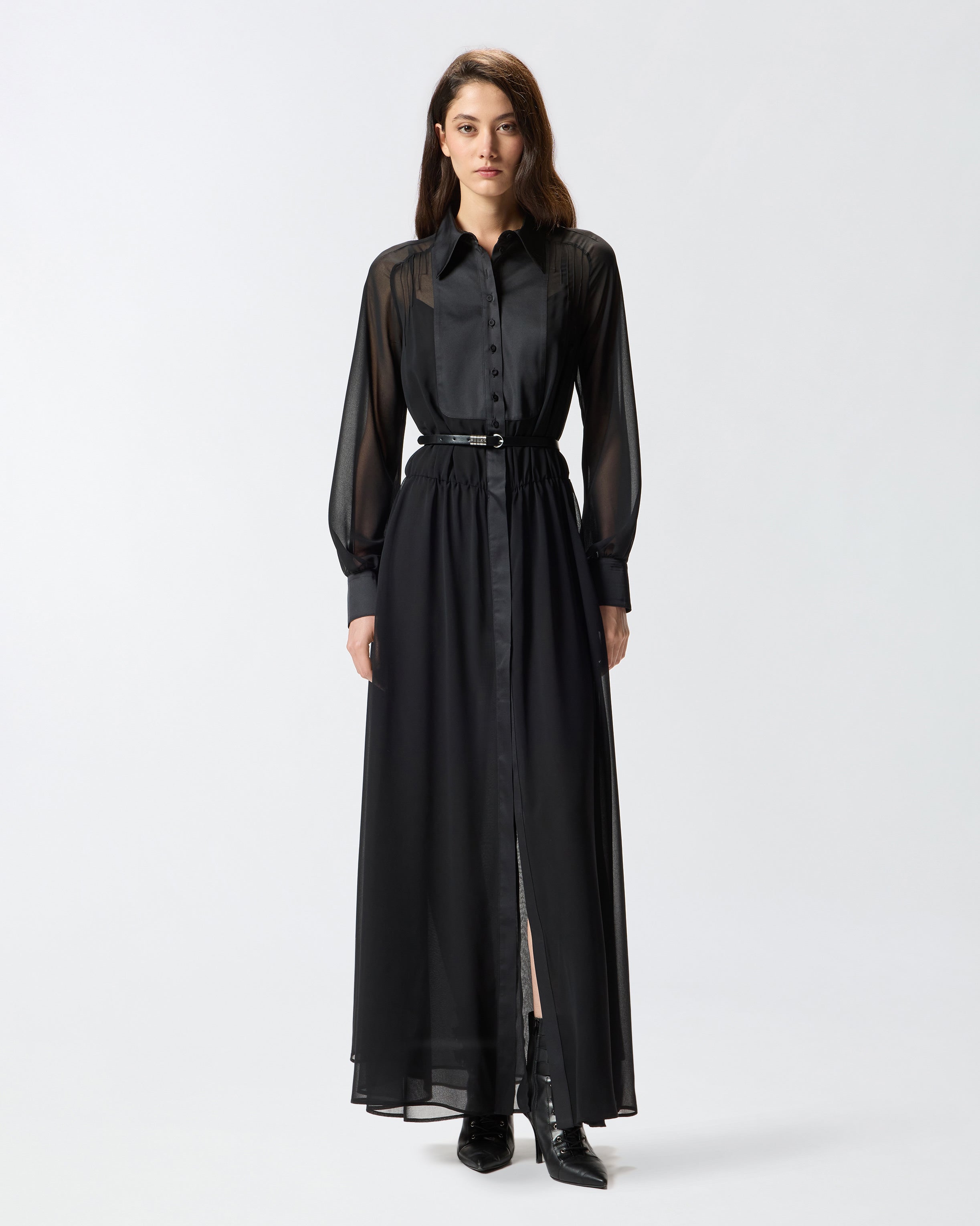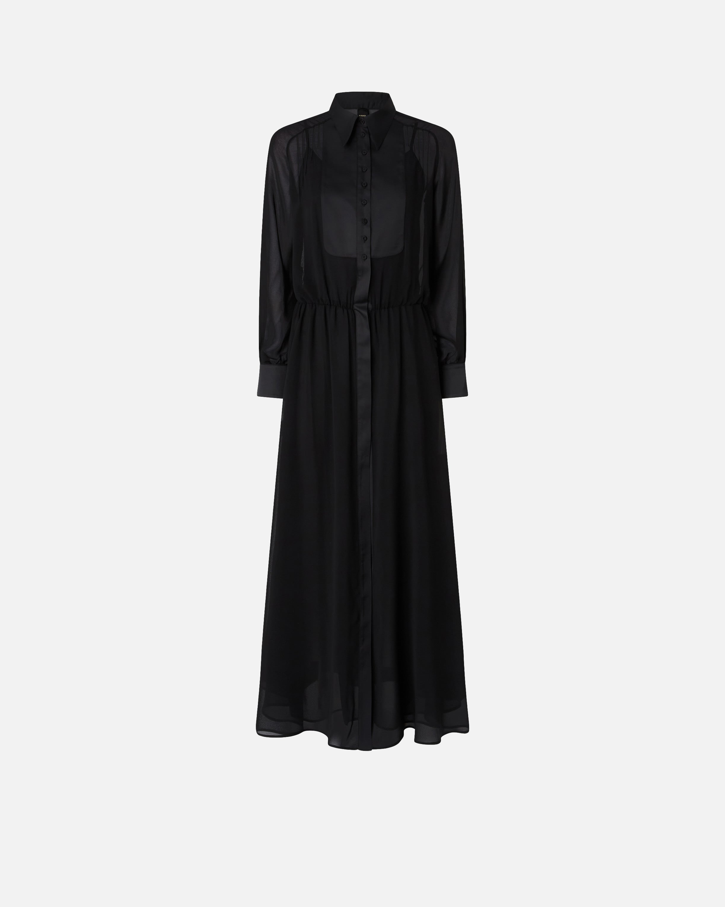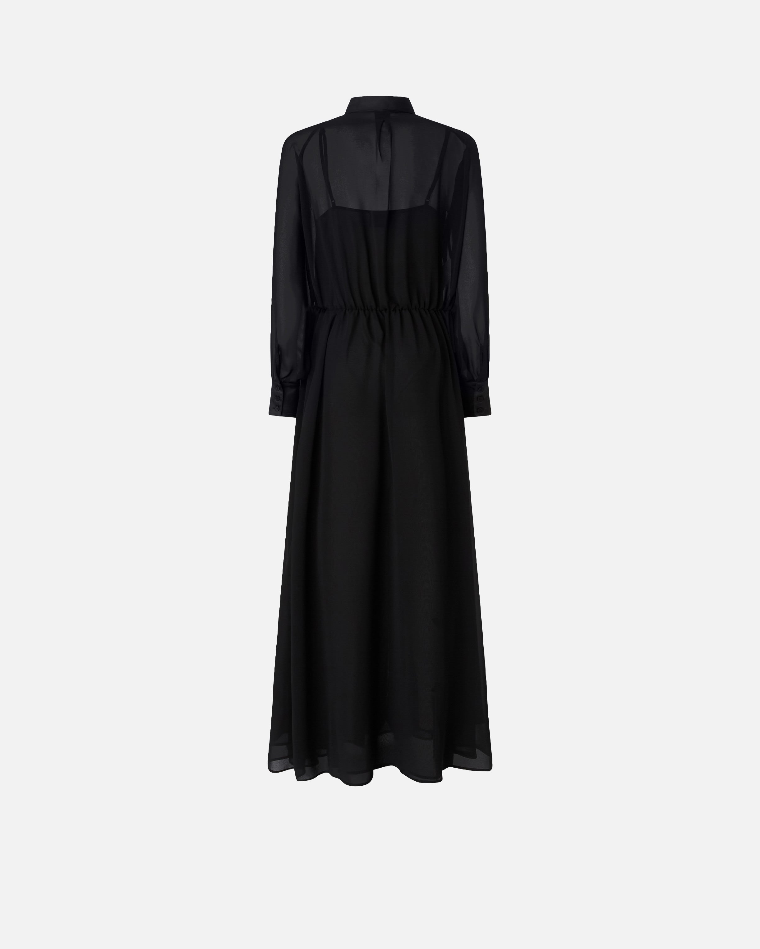 Long relaxed-fit shirt dress with long balloon sleeves. This piece is made from semi-sheer georgette fabric, features satin-effect inserts on the shirt-style collar, front button placket and cuffs, and comes with a slip dress with spaghetti straps to help offset the see-through effect. Be daring and wear this simple yet sensual dress for special evenings too.