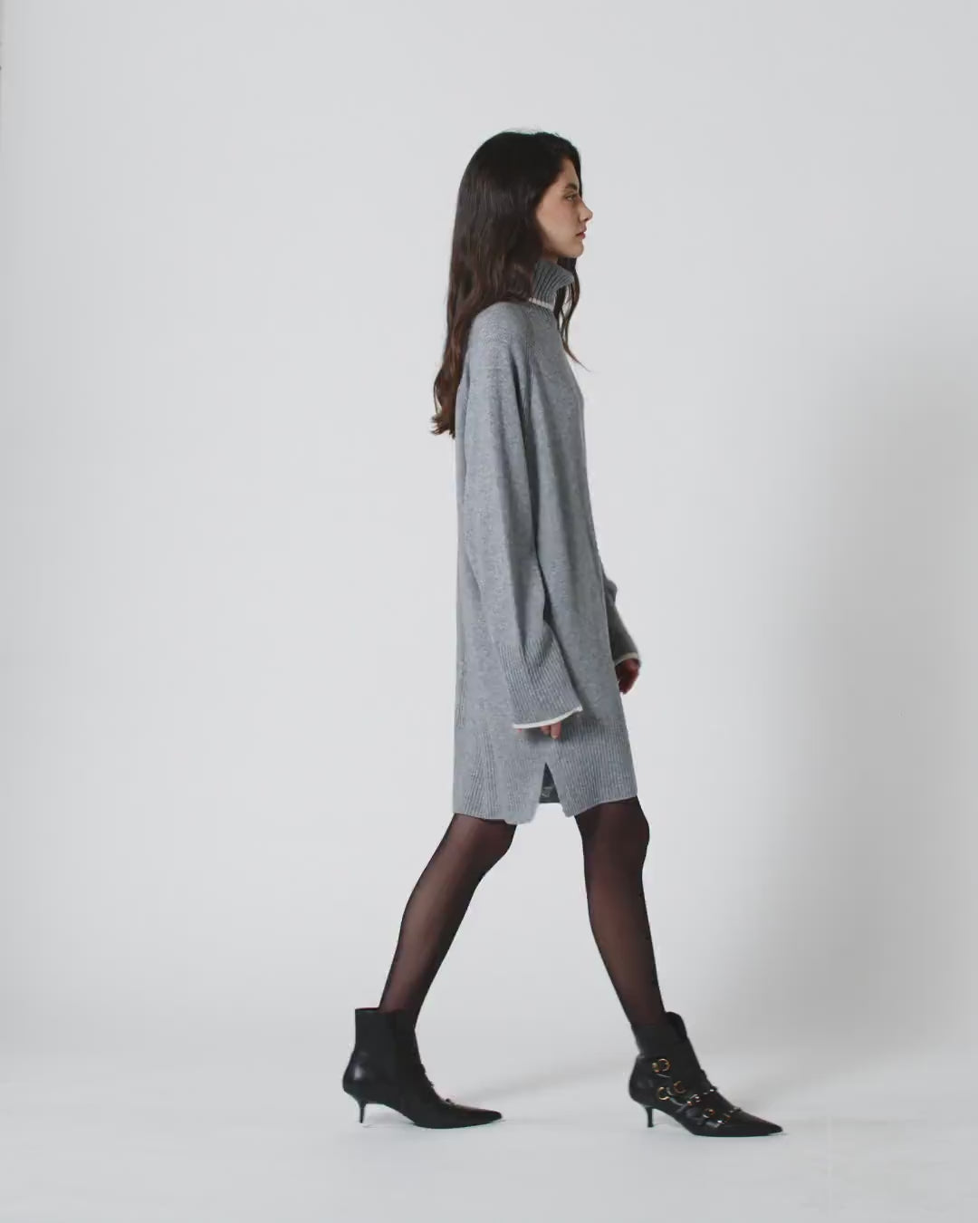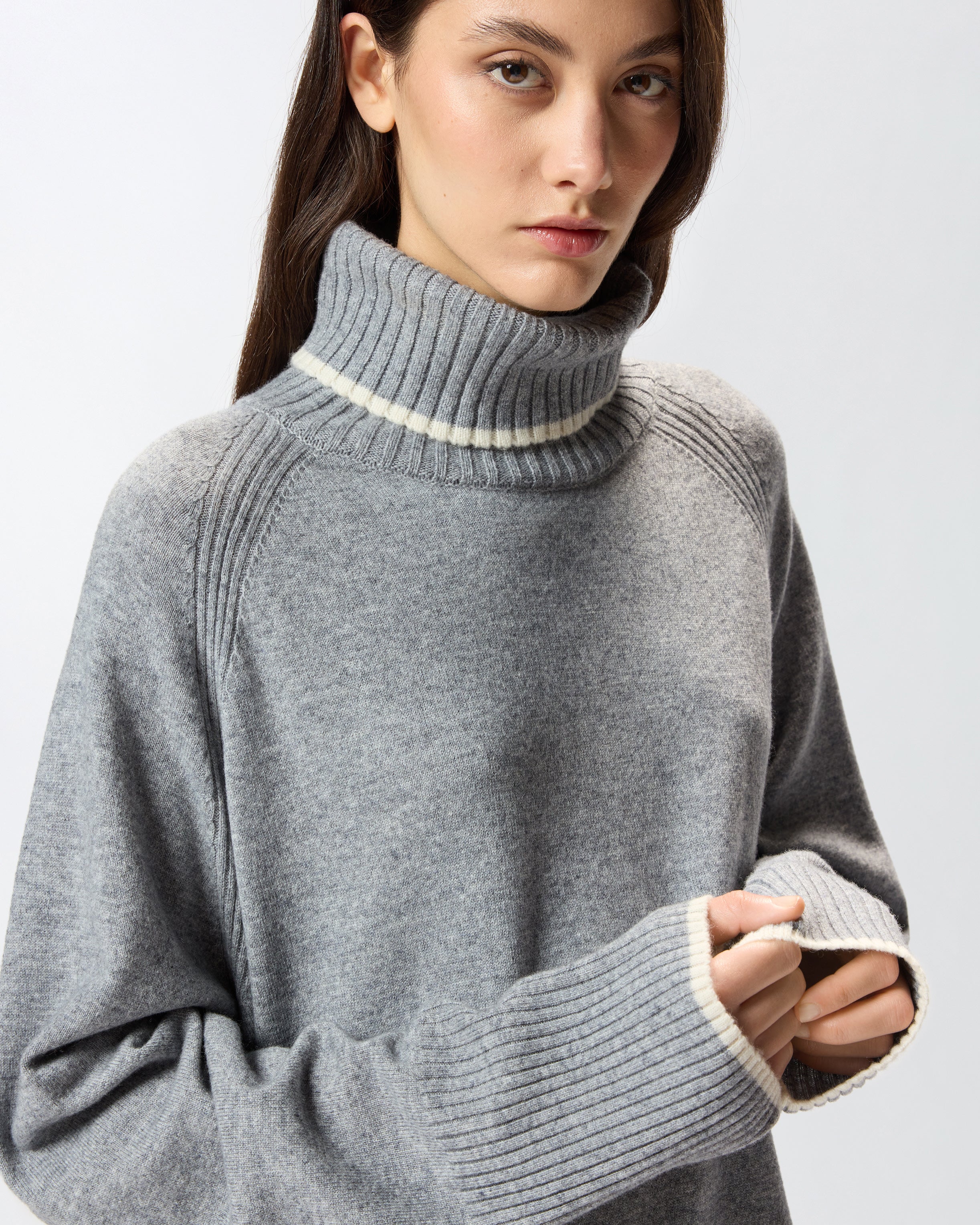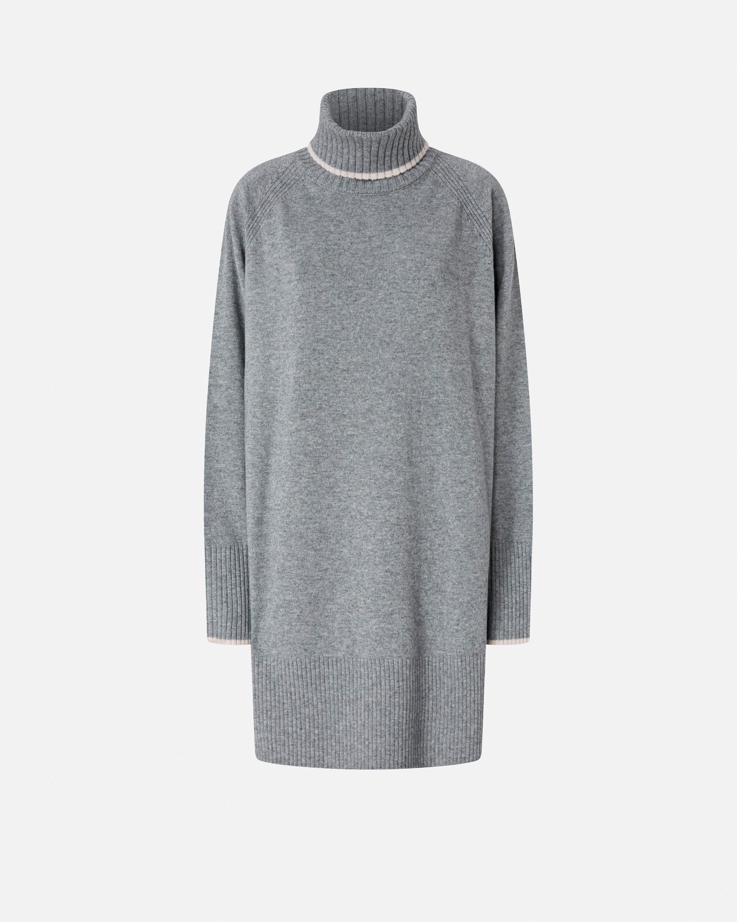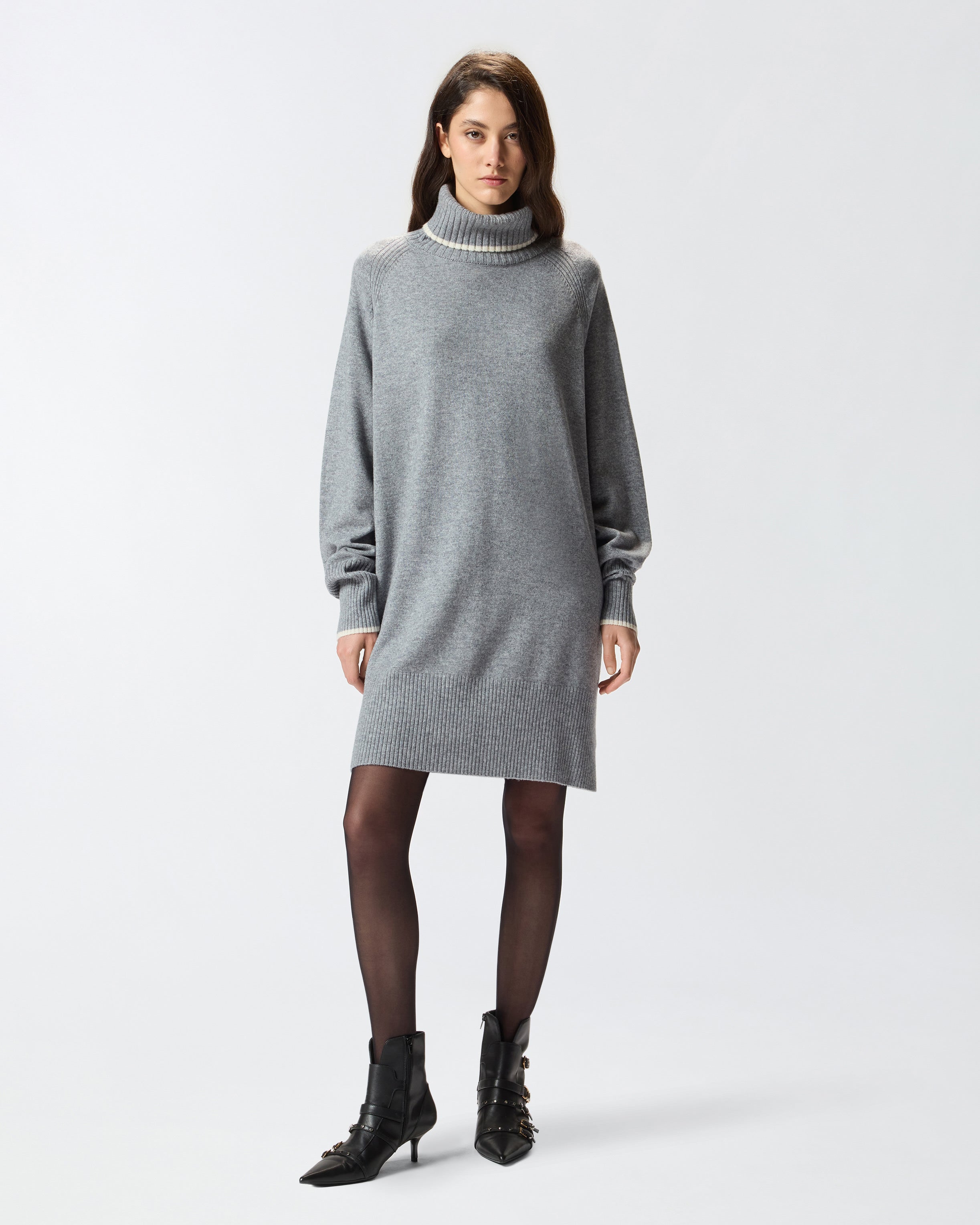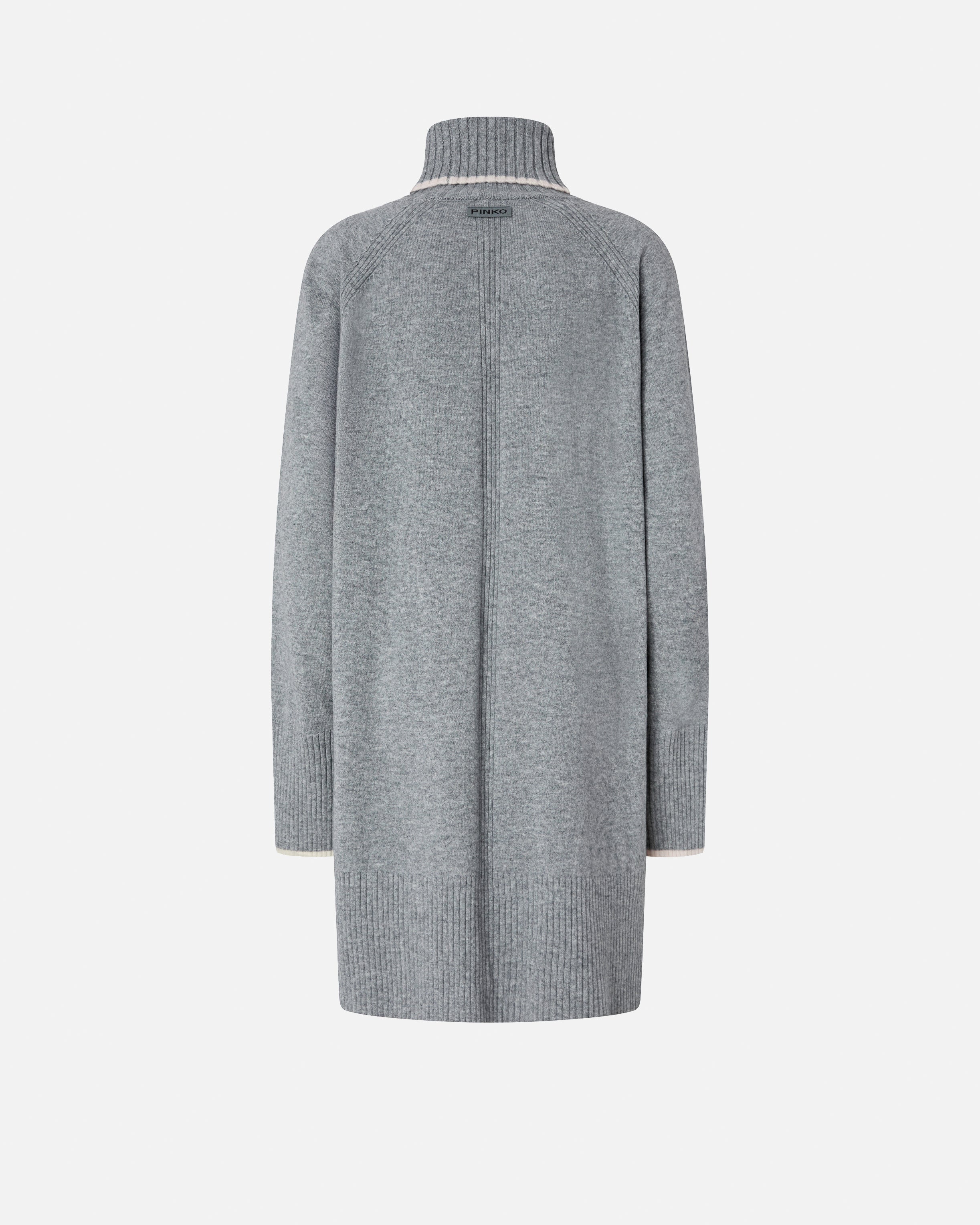 Short dress with a full silhouette in a soft merino and cashmere-blend knit with contrasting trims on the long sleeves and polo-neck. The piece has undergone finishing tests to minimise the possible formation of pilling, ensuring greater fabric softness and durability. The neck, hem and cuffs are ribbed, while the final touch is given by the tone-on-tone label with PINKO lettering logo on the back of the neck.