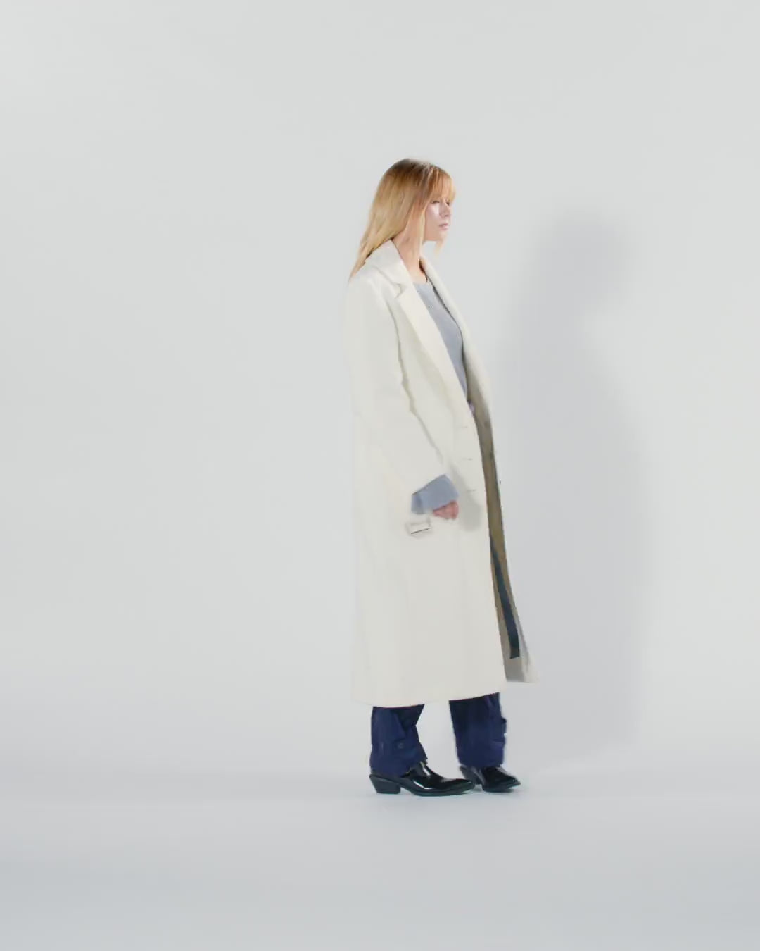 Long coat in diagonal-weave wool-blend bouclé fabric with a classic lapel collar and comfortable patch pockets. Slit in the middle at the bottom on the back and single-breasted button fastening at the front. Matching-fabric waist belt with metal buckle. Face the coldest temperatures with this garment that is ready to give you a soft hug.