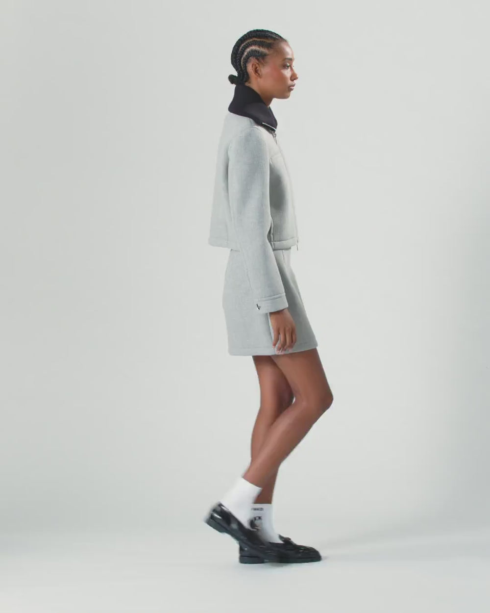 Slim-fitting jacket in washed and bonded wool gauze with two-way full-zip fastening and chest pockets. The fabric gives the garment a modern, compact effect, while the structured design is perfect for everyday looks. The focal point of the piece, however, is the knit high neck that contrasts with the plain colour of the design.