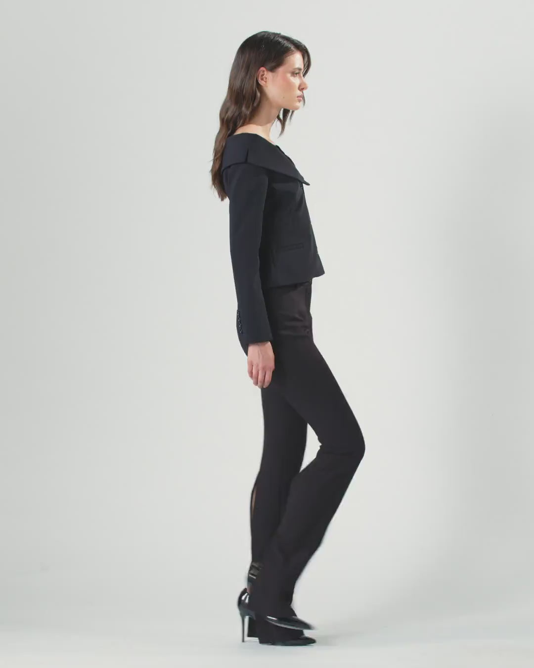 Slim-fitting, long-sleeved jacket in figure-flattering stretch crepe fabric. The off-centre button placket, buttoned cuffs and side welt pockets are a clear nod to the classic blazer's design, while the wide neckline that leaves the shoulders uncovered gives the item a decidedly feminine touch: the end result is structured yet classy in style, like only PINKO knows how.